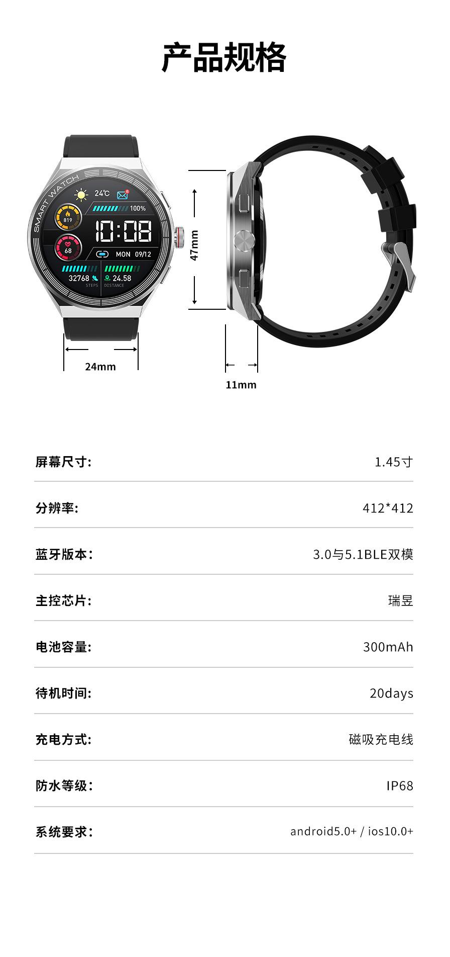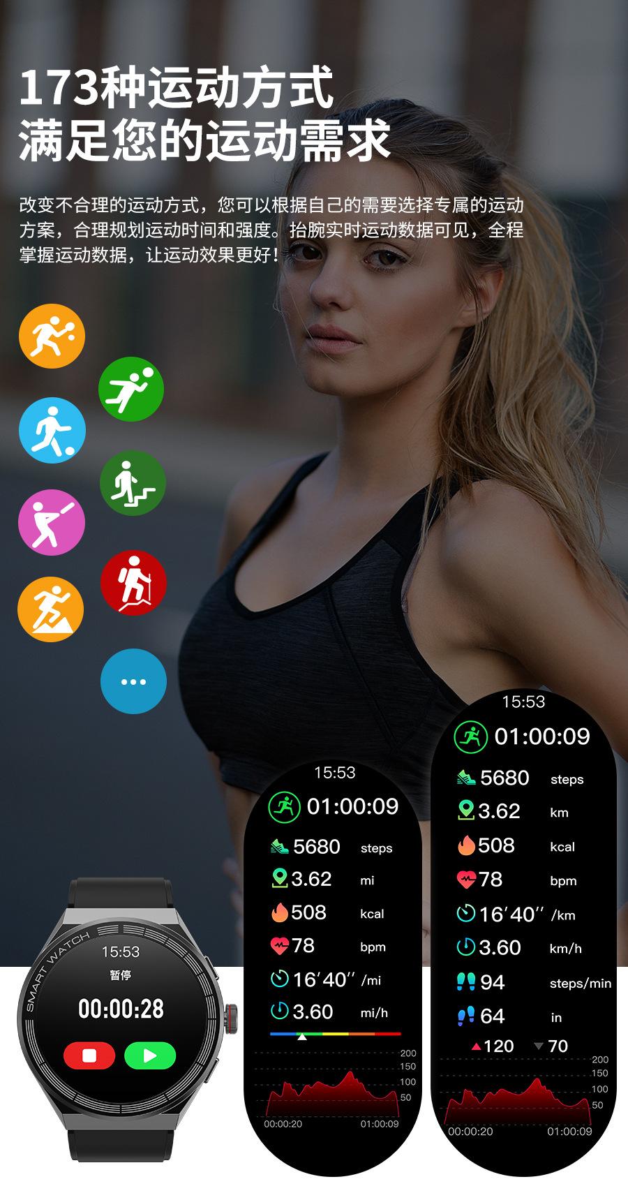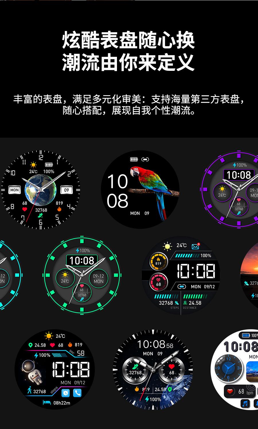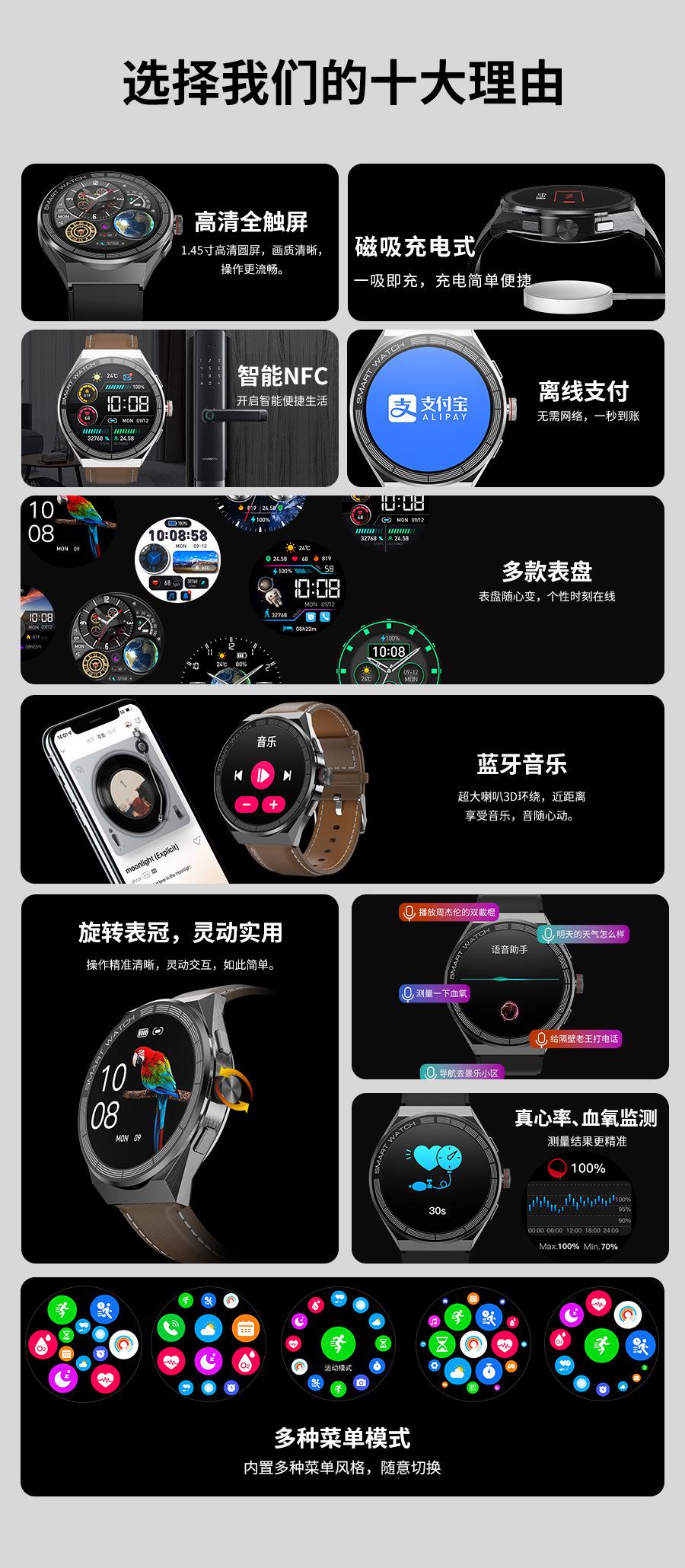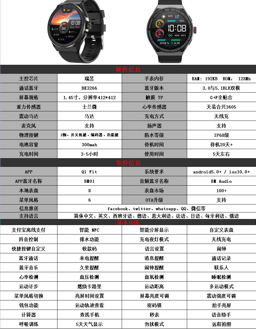 Heart rate monitoring, Social Entertainment, Bluetooth call, NFC function, Smart Reminder, Remote control self...