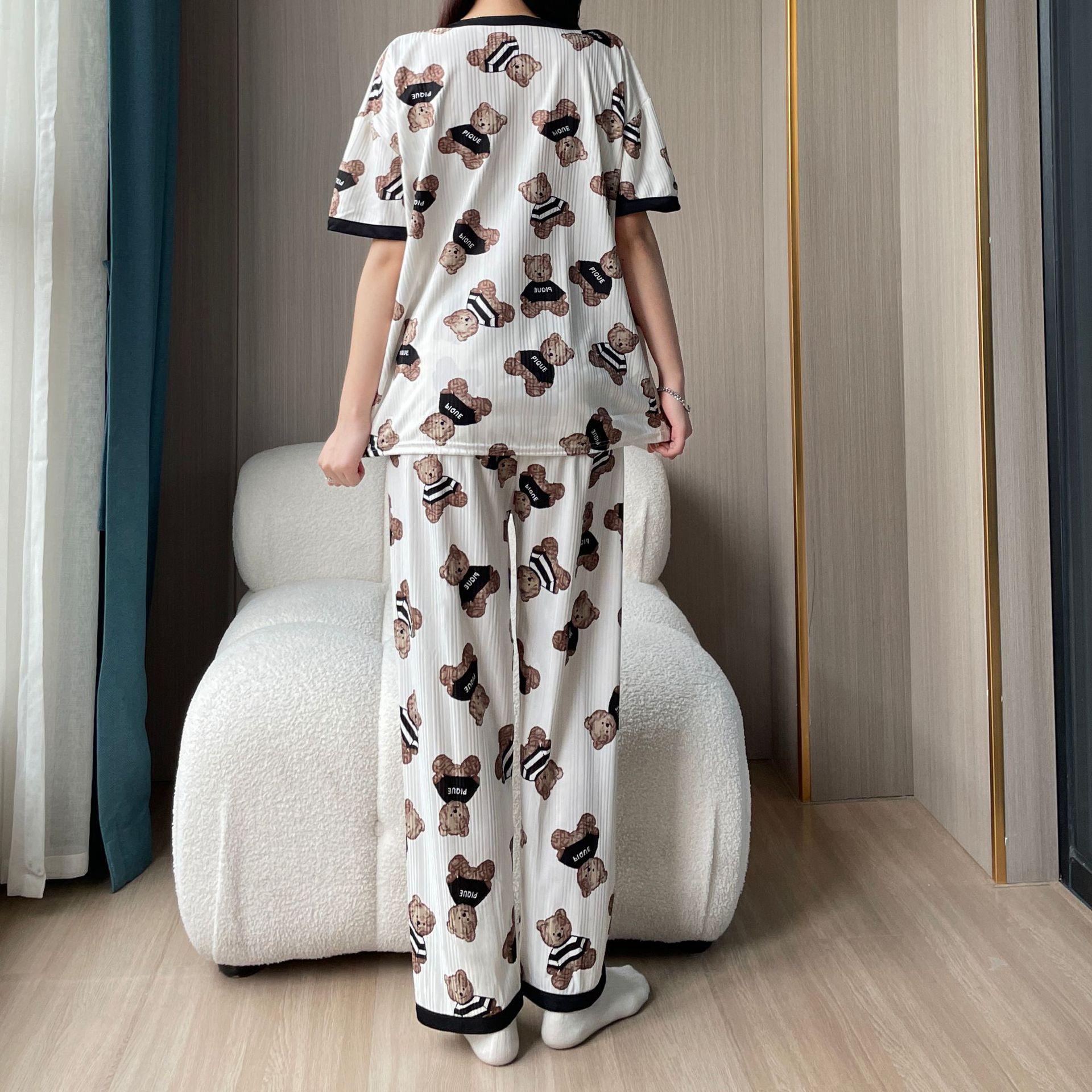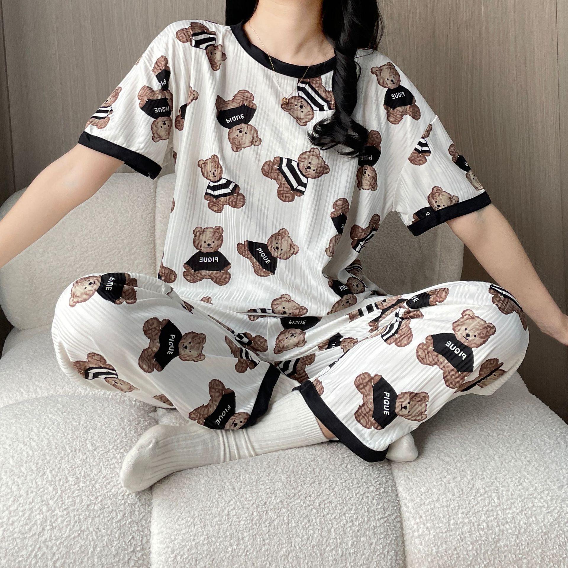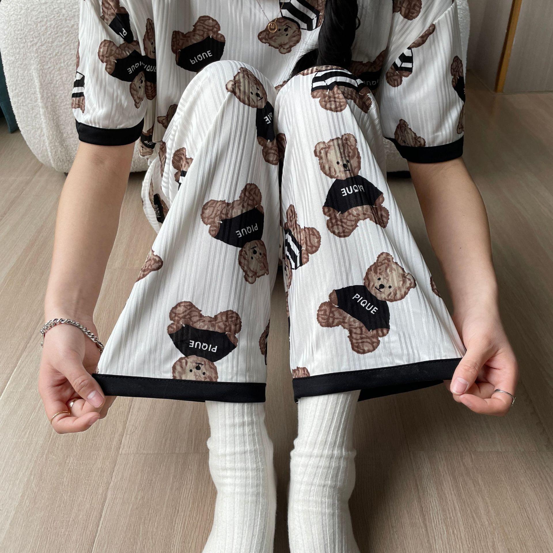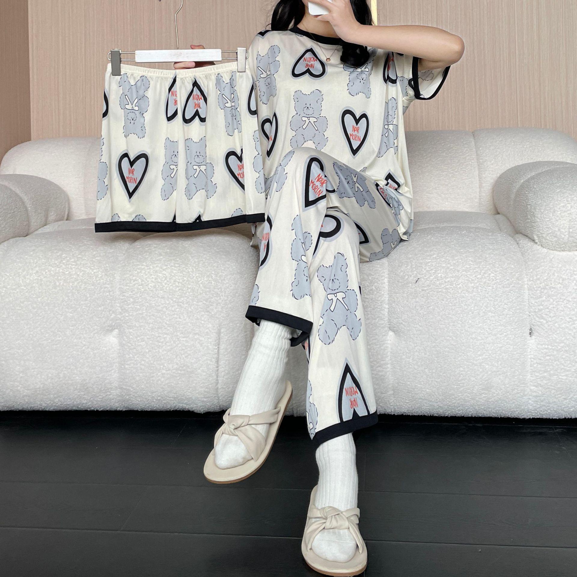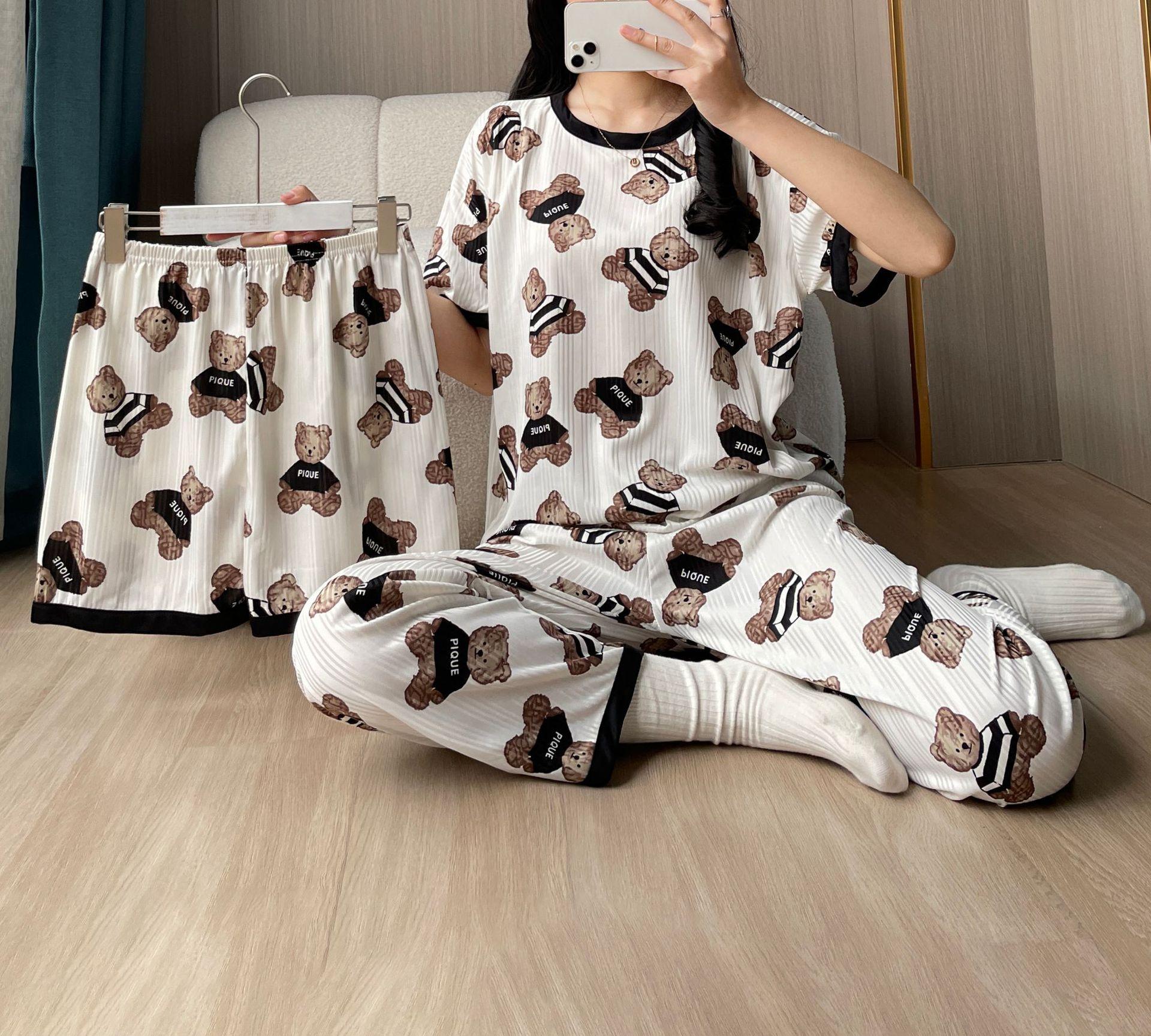 Pijama de Manga Corta de Primavera y Verano Conjunto de Tres Piezas con Estampado de Oso y Carita Sonriente Holgado Conjunto de Ropa para el Hogar Sencillo y Casual