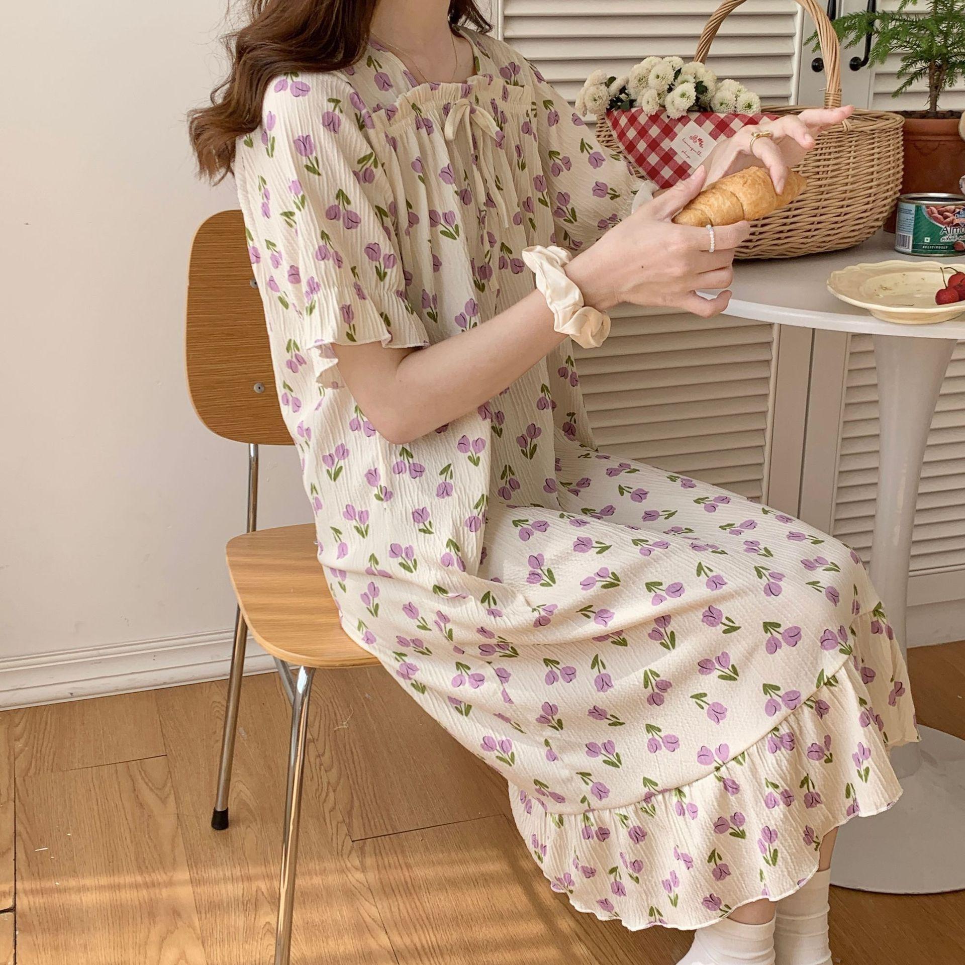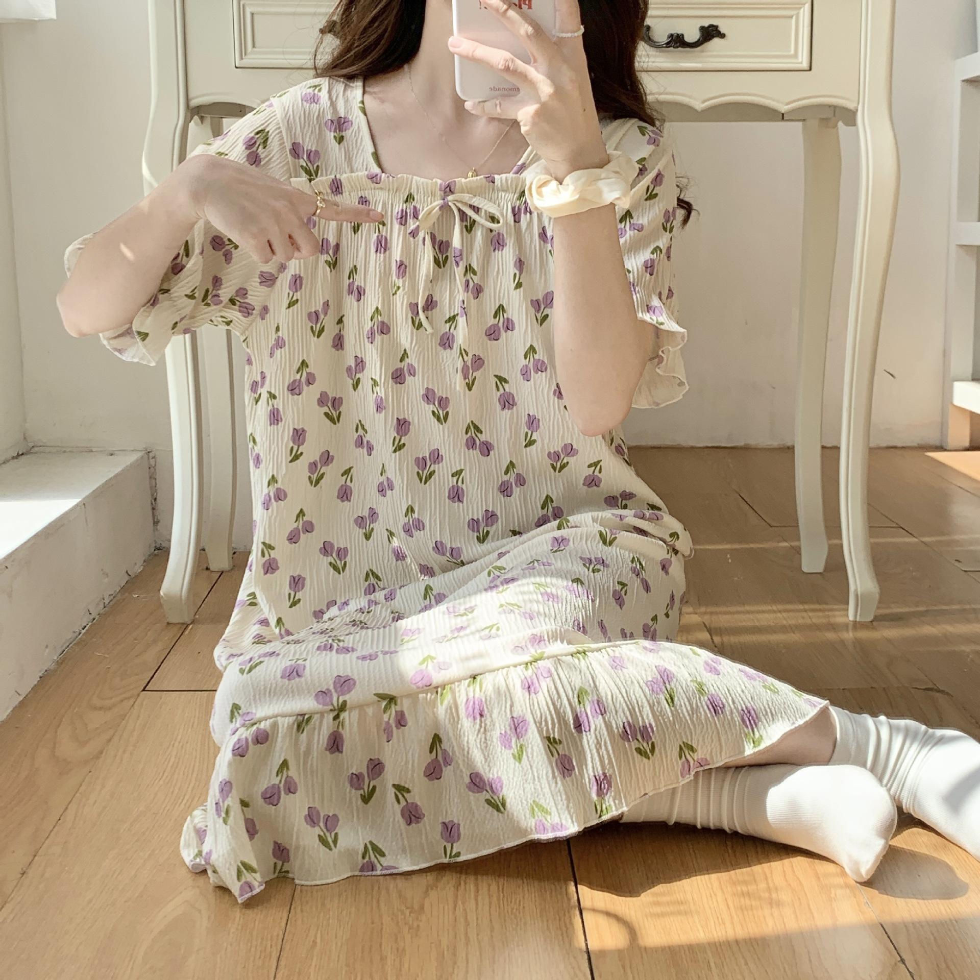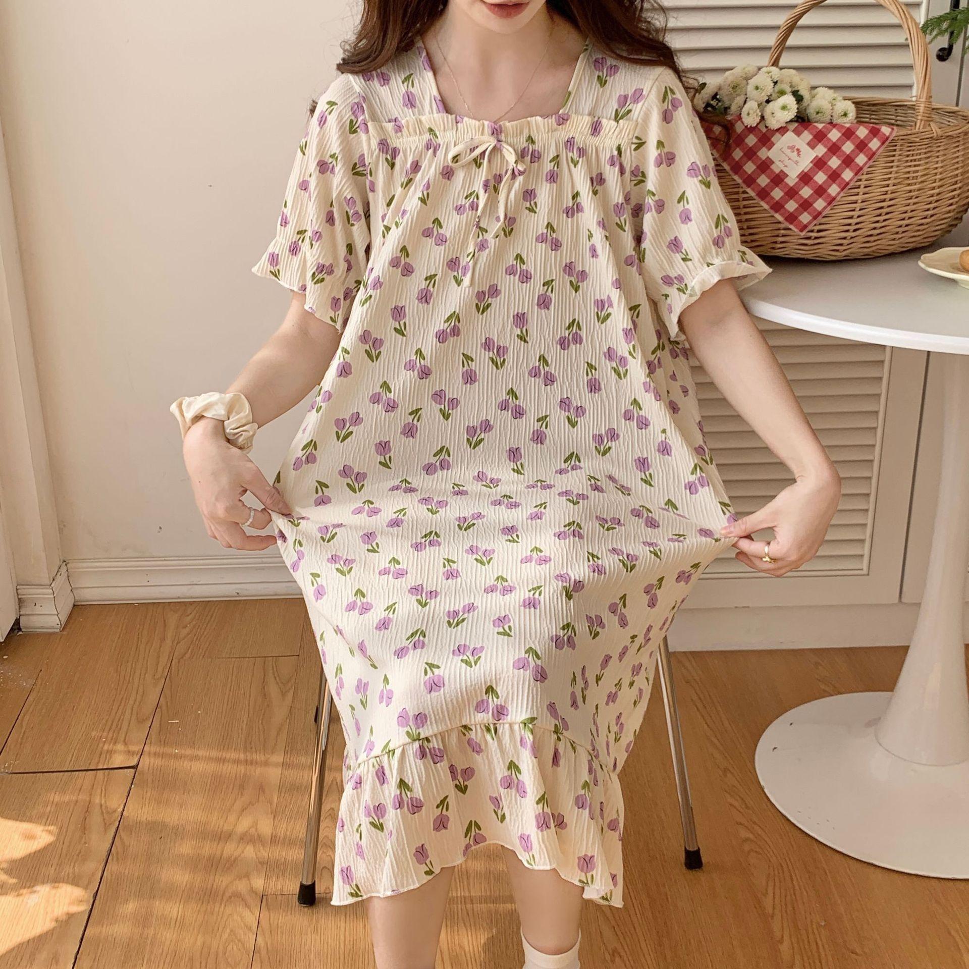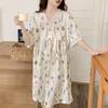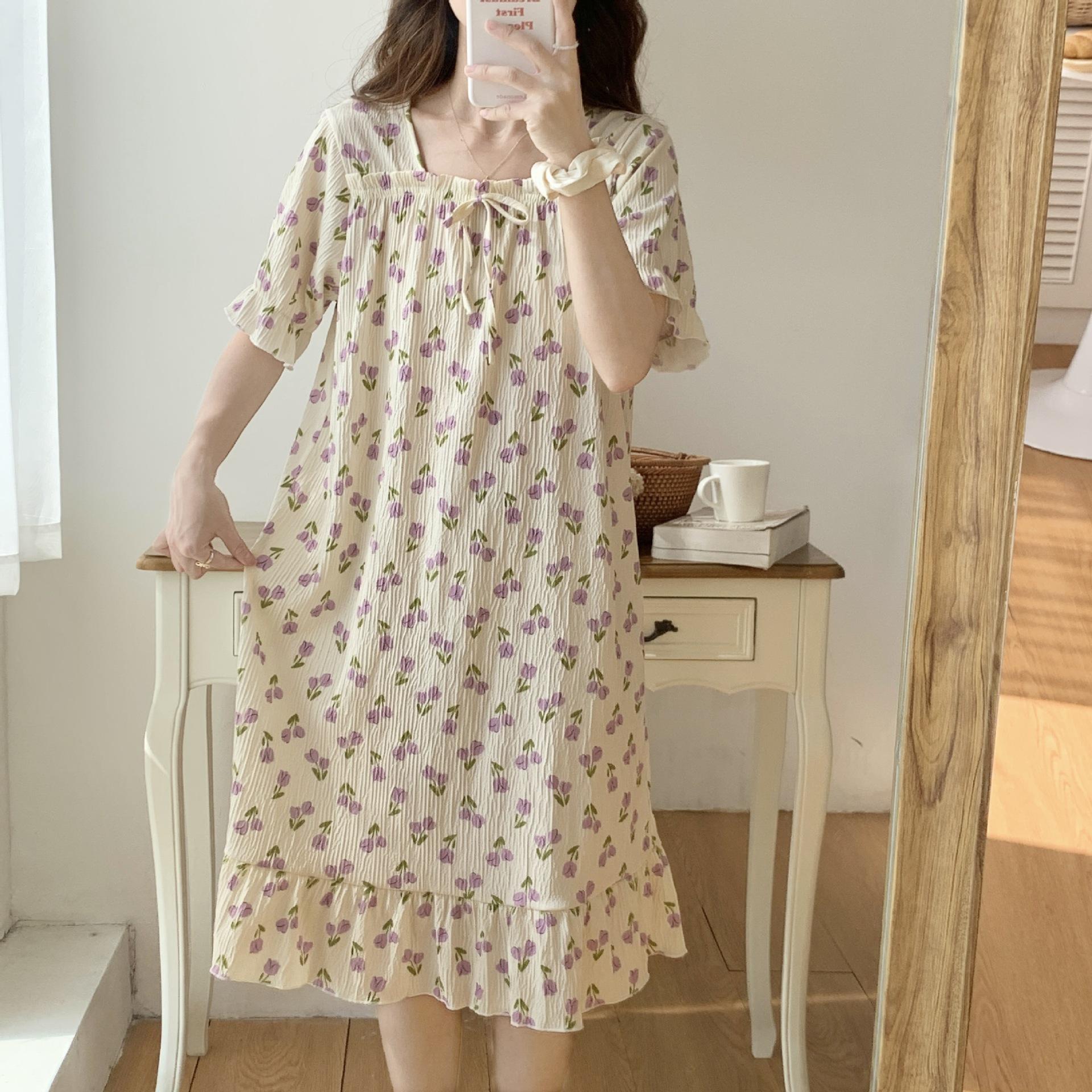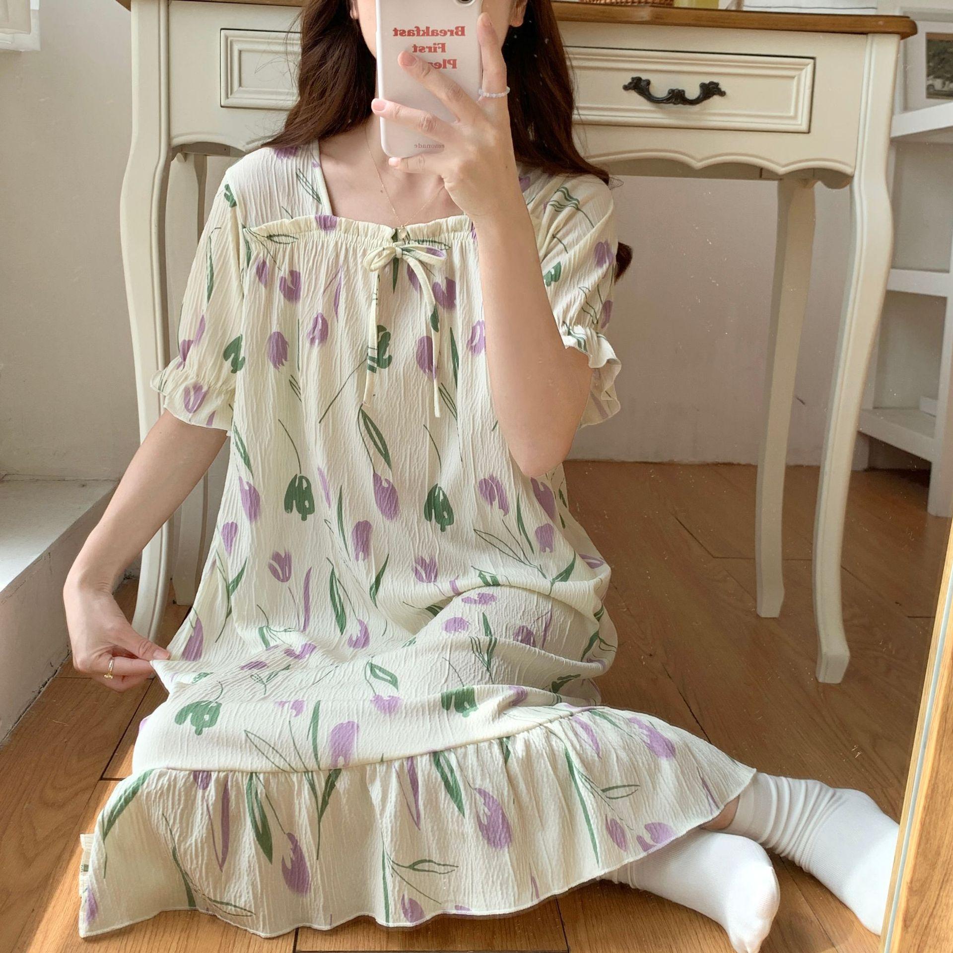 Nuevo camisón de verano de manga corta para mujer estilo coreano lindo crepé de algodón burbuja floral delgado vestido de moda para estar en casa