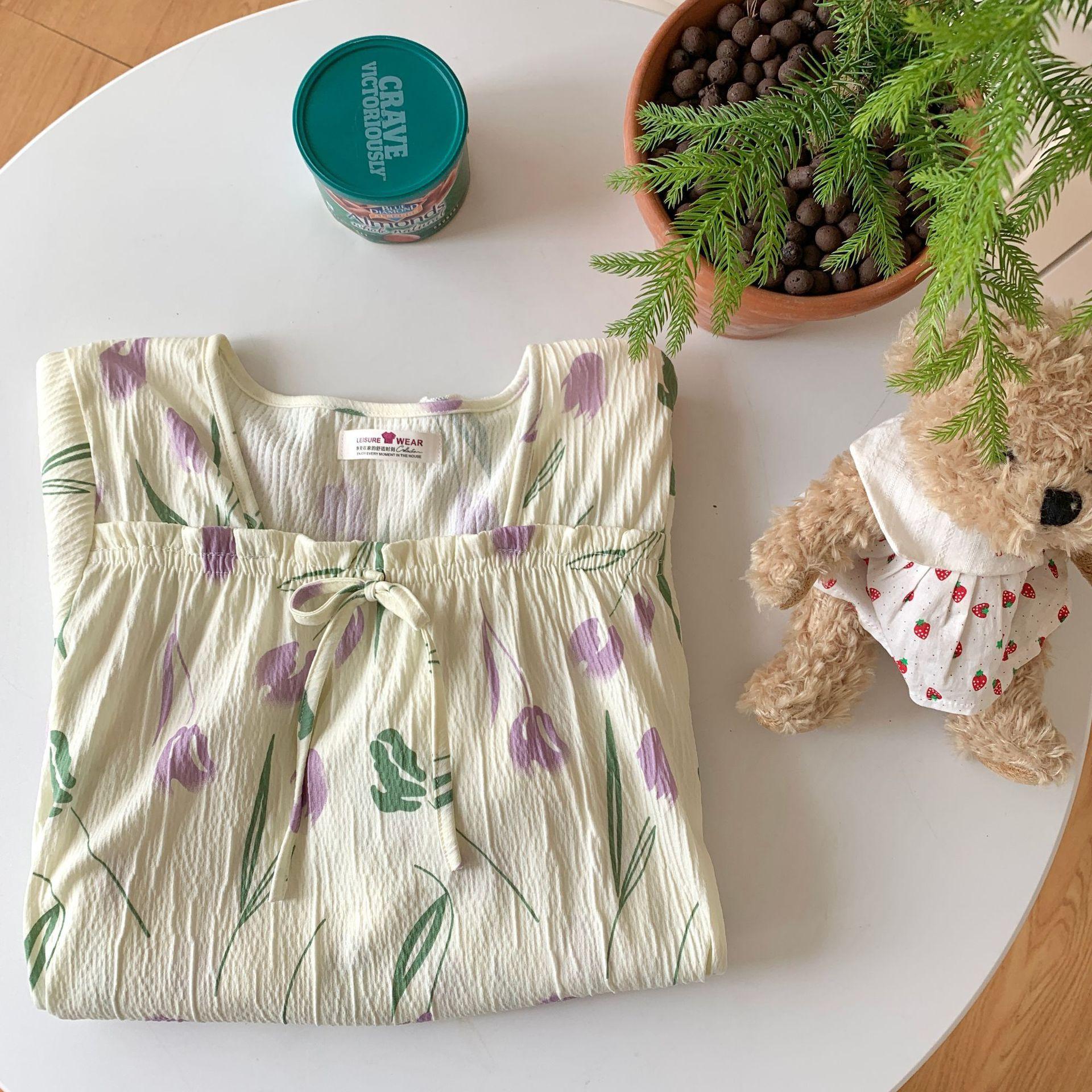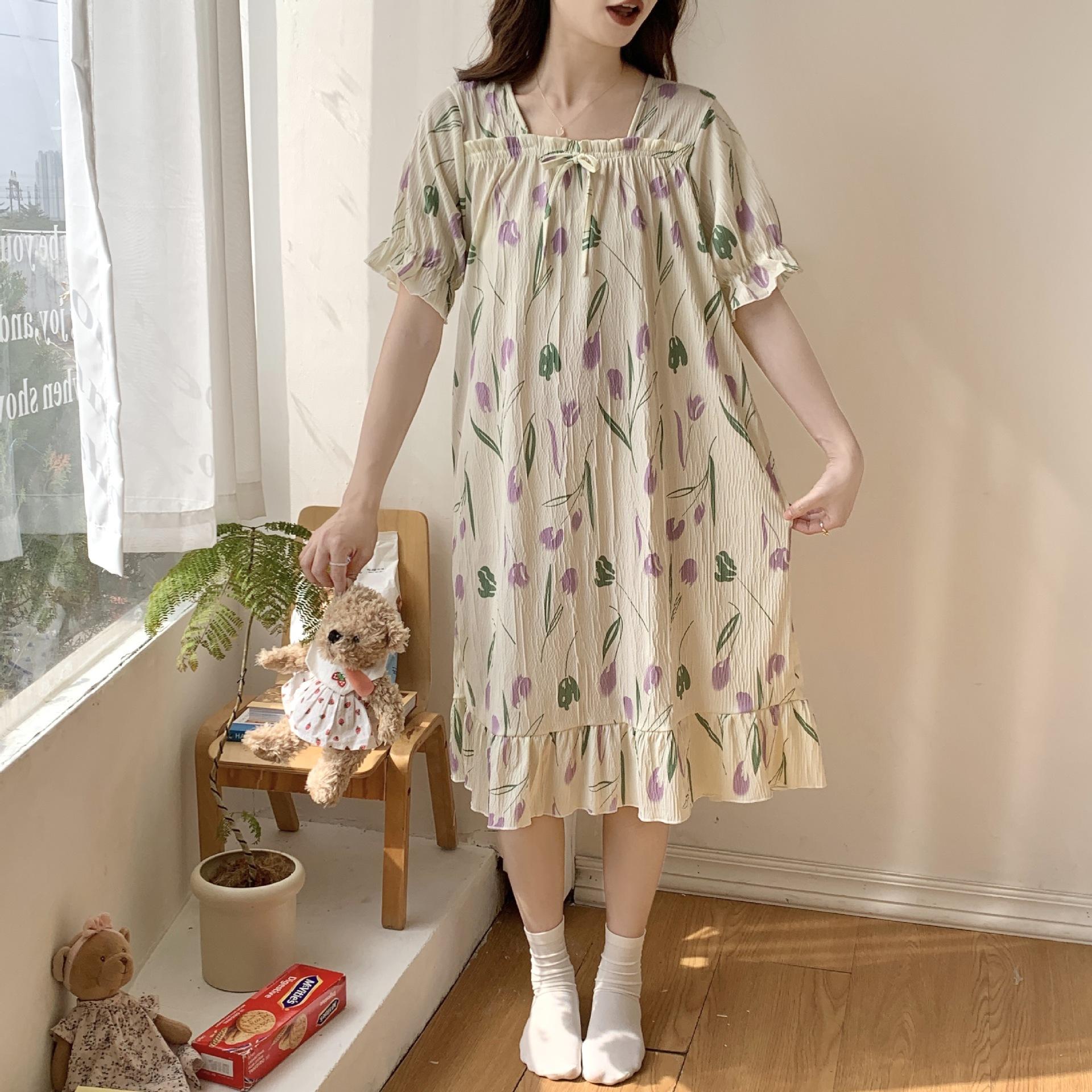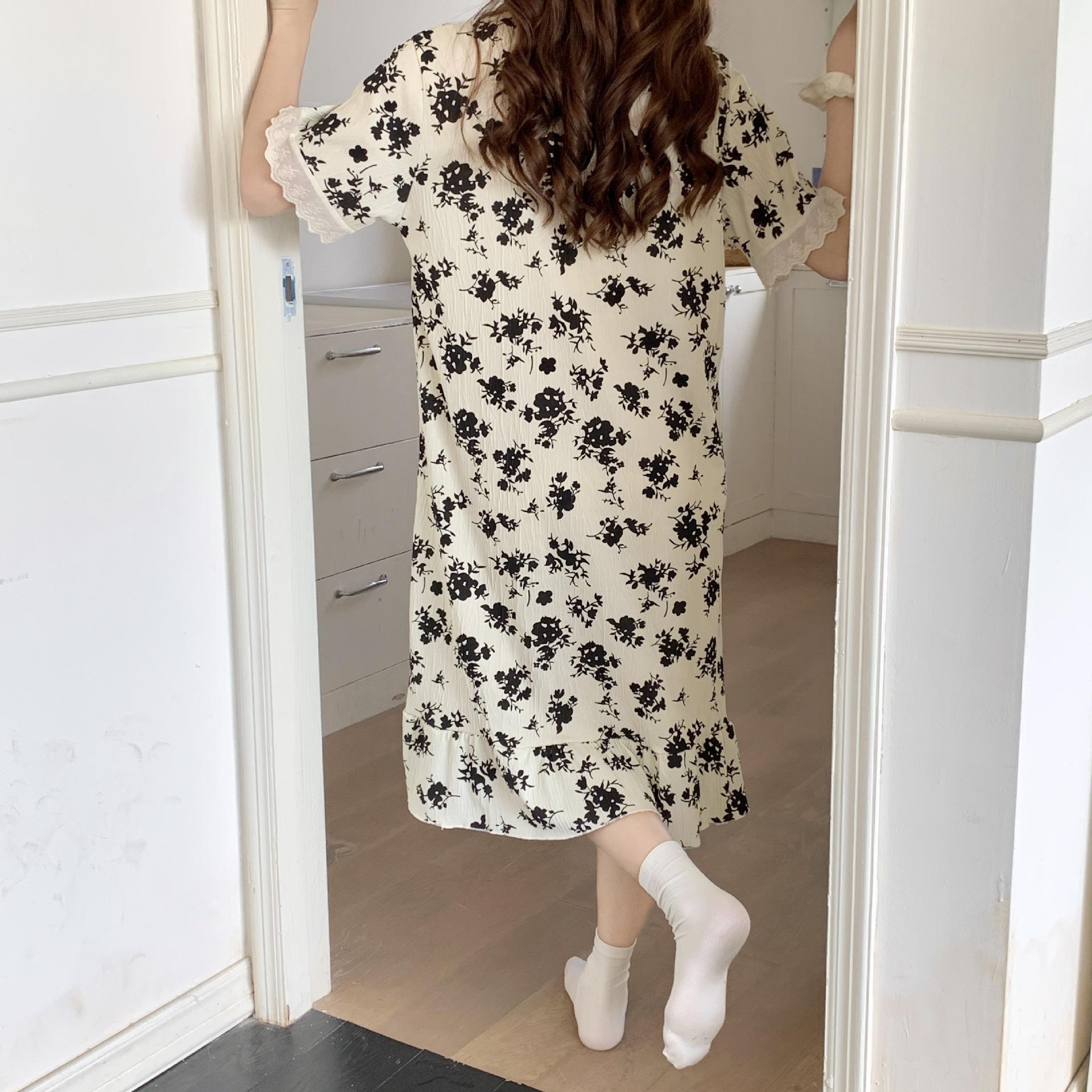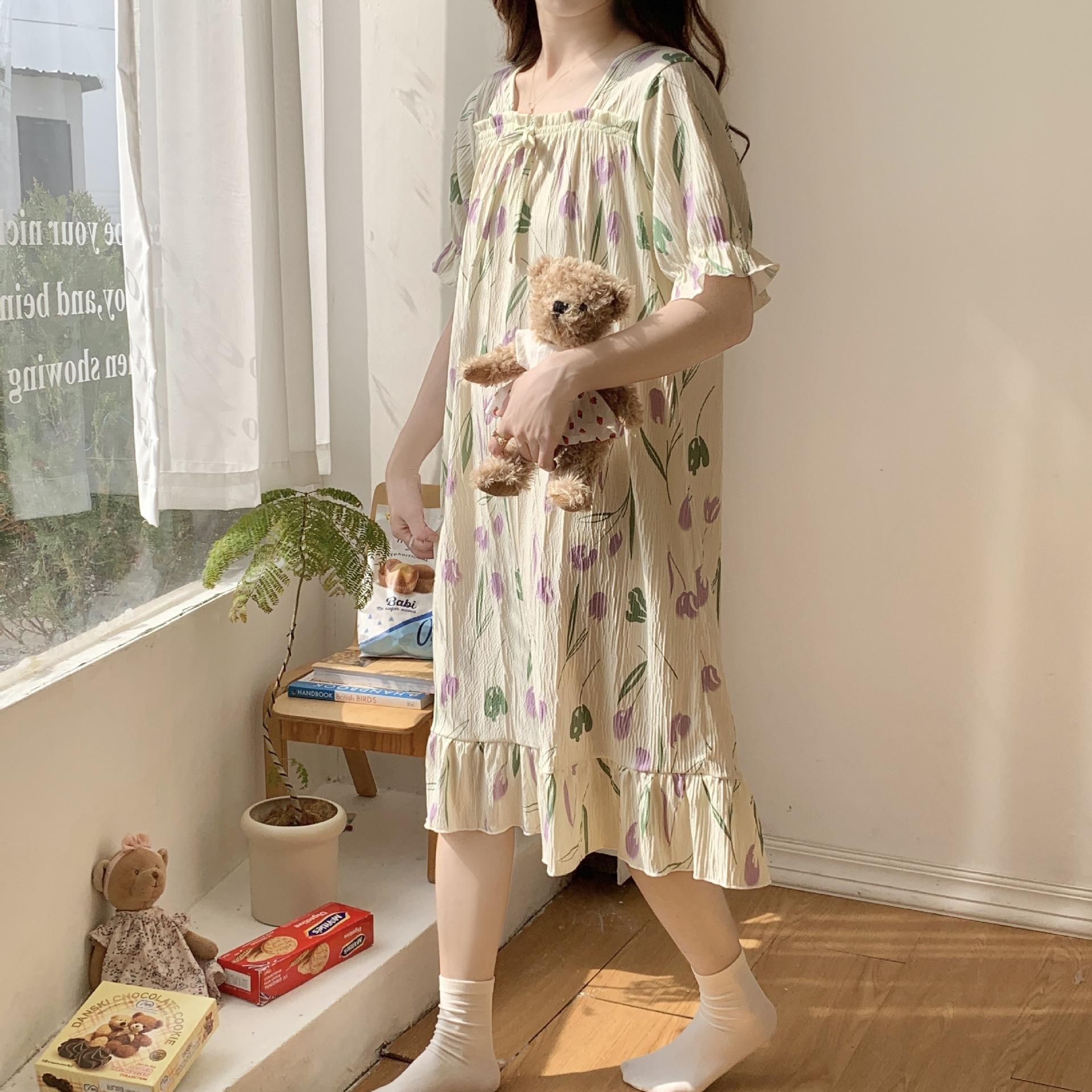 Nuevo camisón de verano de manga corta para mujer estilo coreano lindo crepé de algodón burbuja floral delgado vestido de moda para estar en casa
