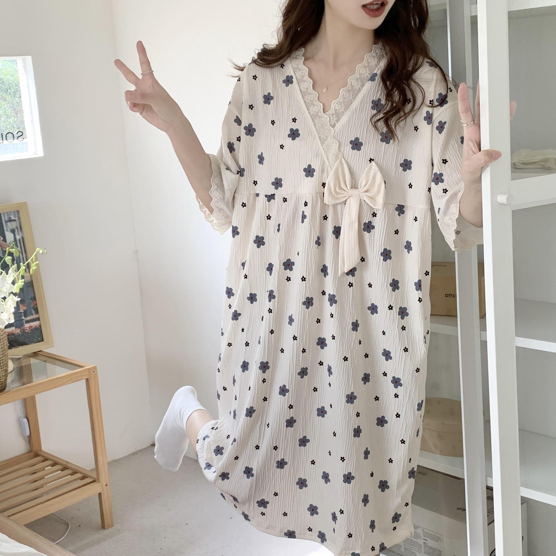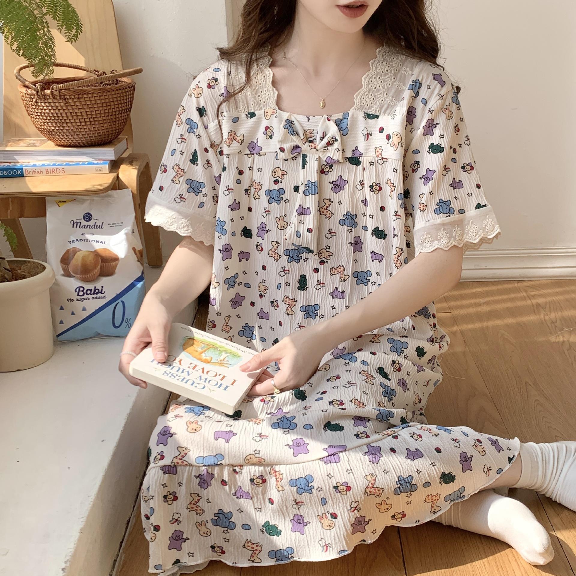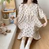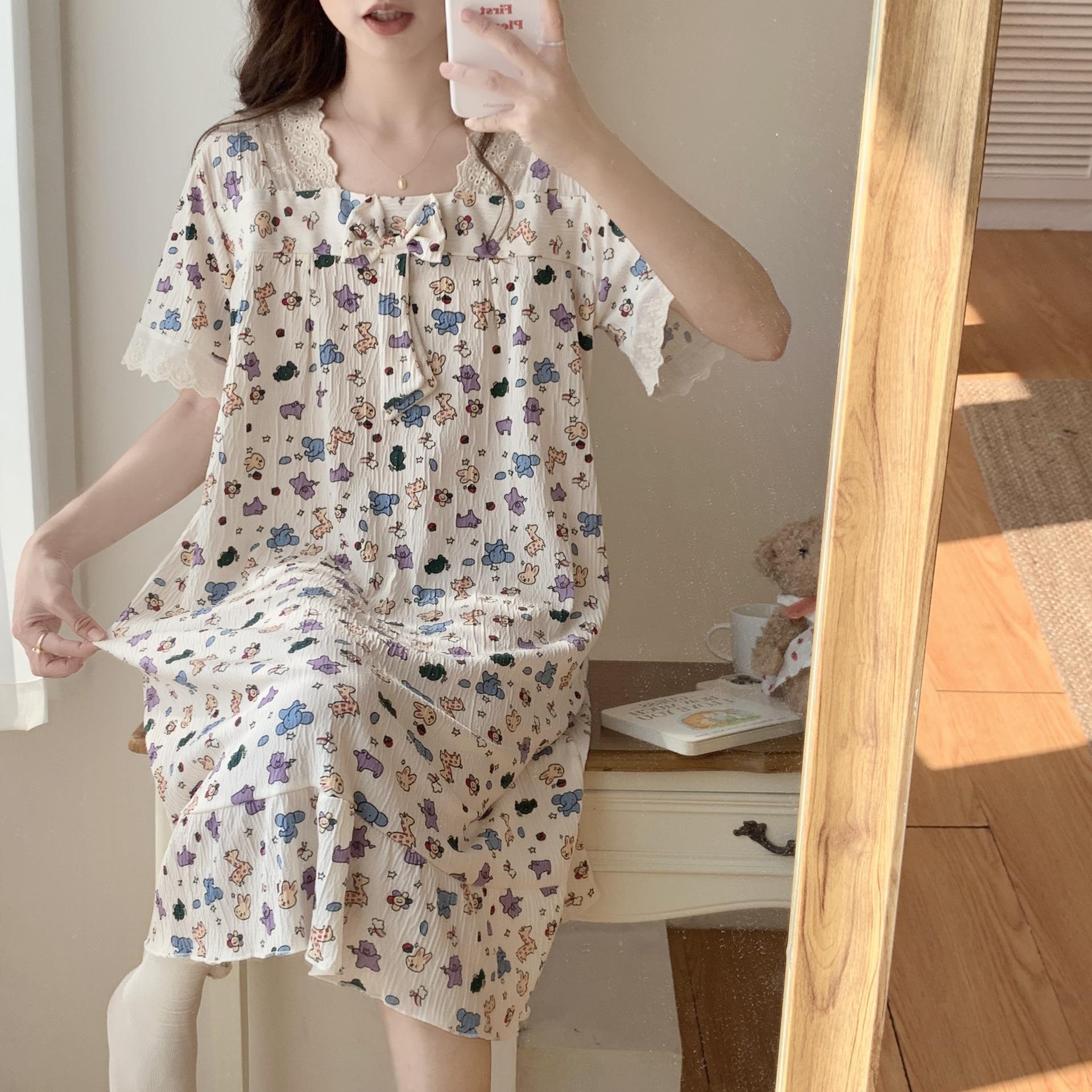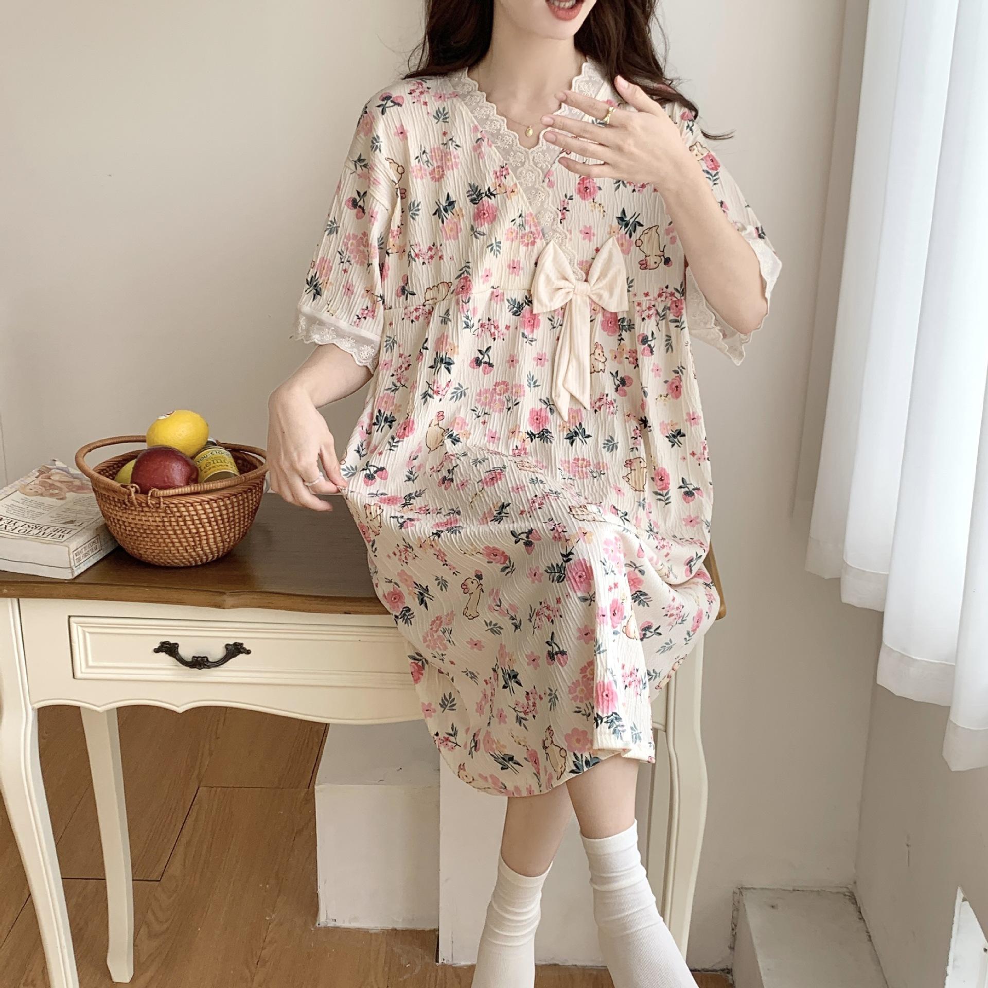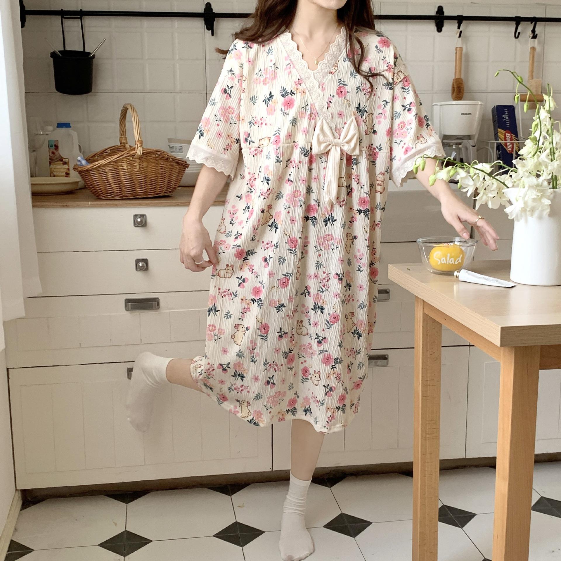 Nuevo camisón de verano de manga corta para mujer estilo coreano lindo crepé de algodón burbuja floral delgado vestido de moda para estar en casa