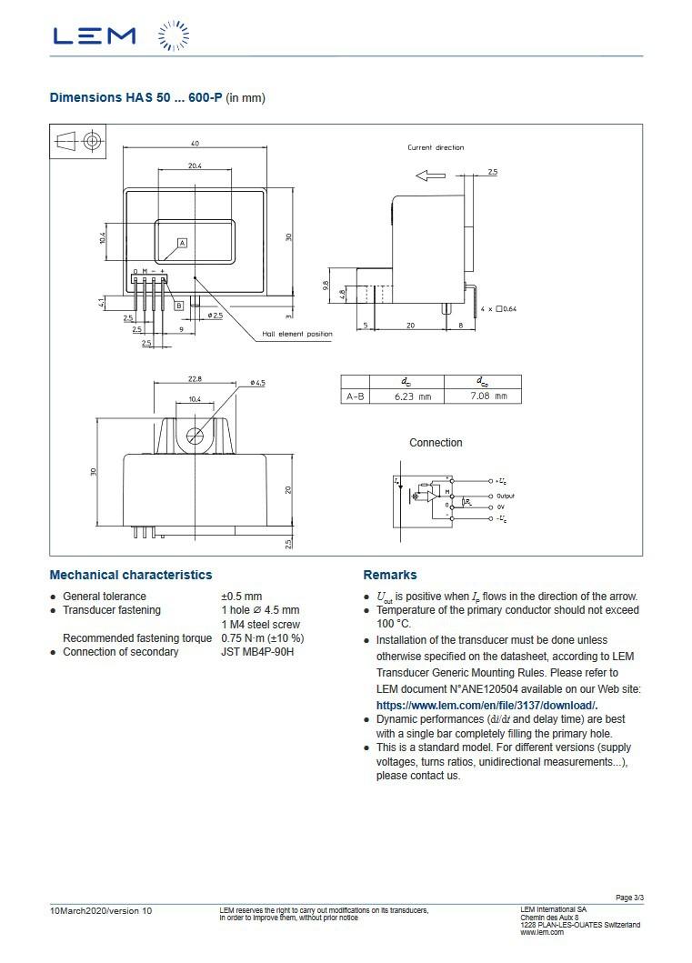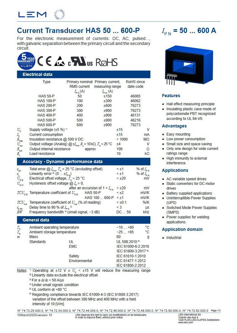 Has200-P Lem/Lem Sensor de Corriente Nuevo Transformador de Efecto Hall Corriente Nominal 200A