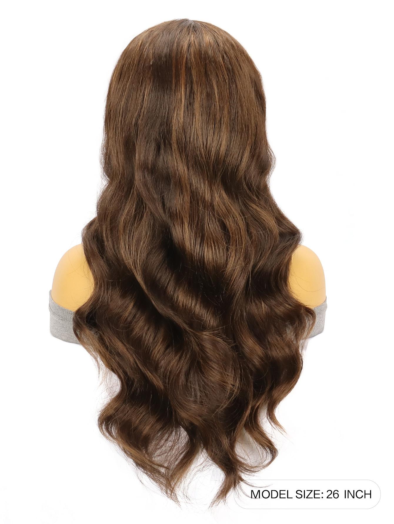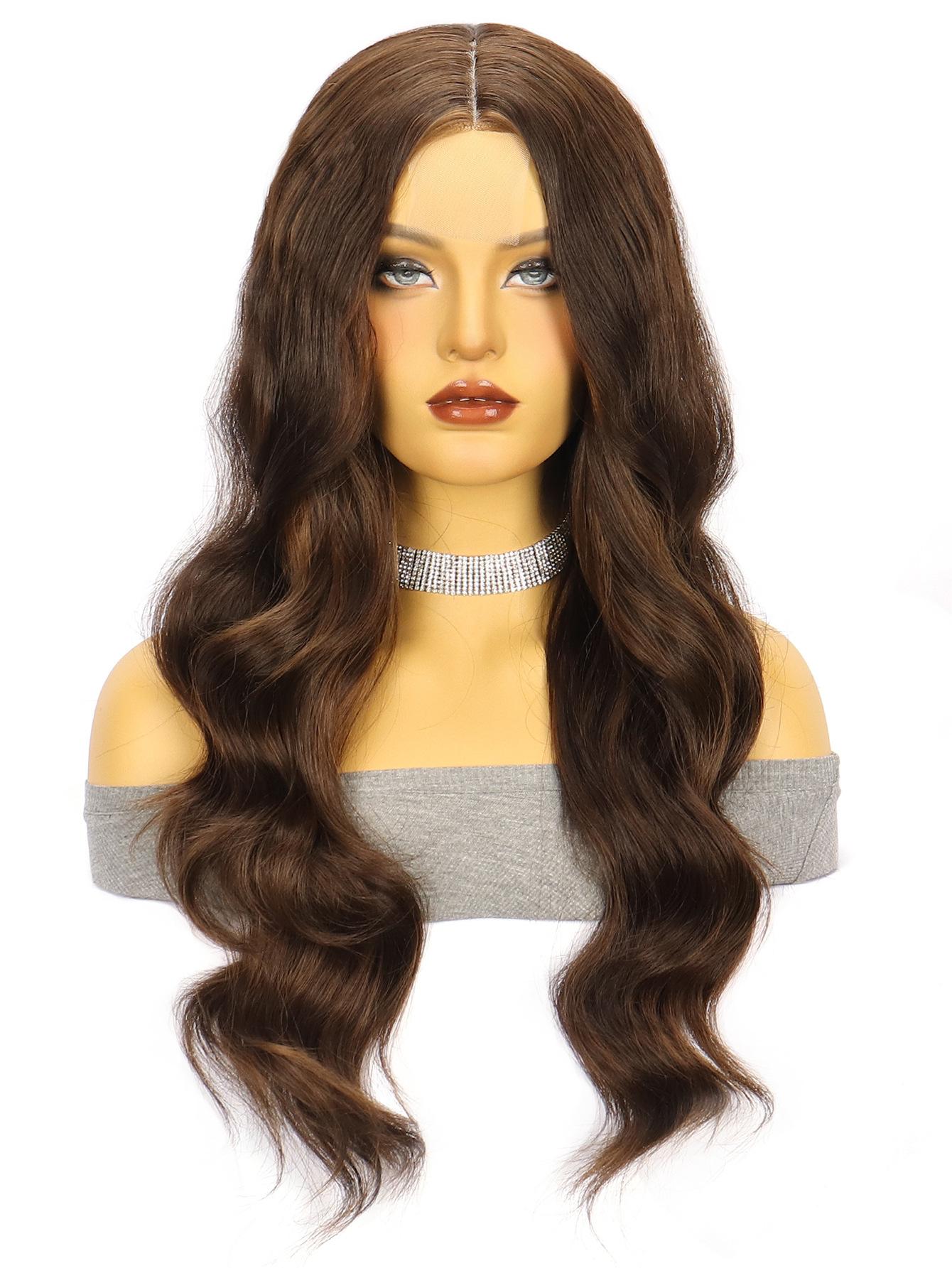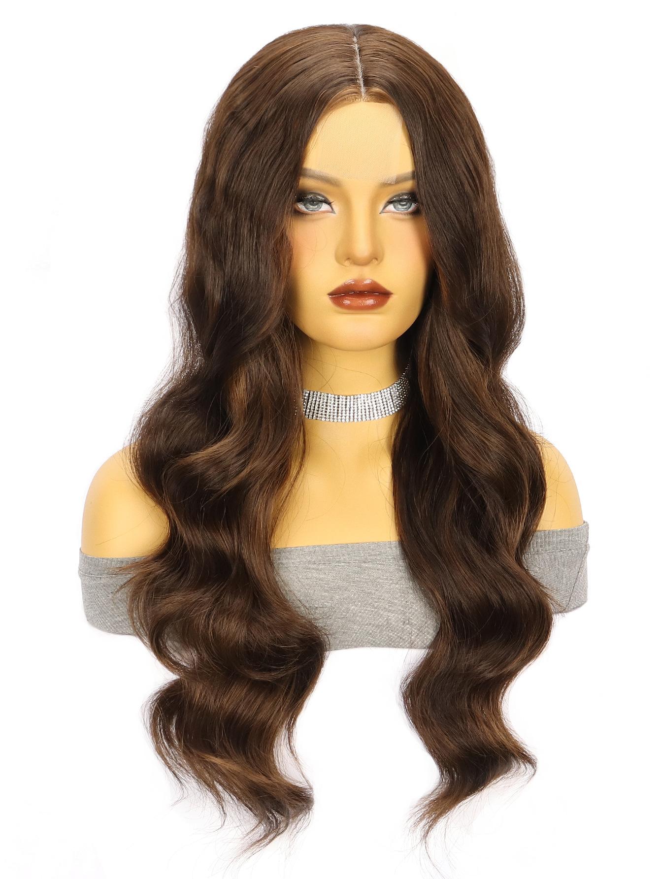 ![]() Peluca de encaje con reflejos marrones, cabello largo y rizado con raya en medio, tocado de fibra química para mujer, disponible para entrega