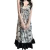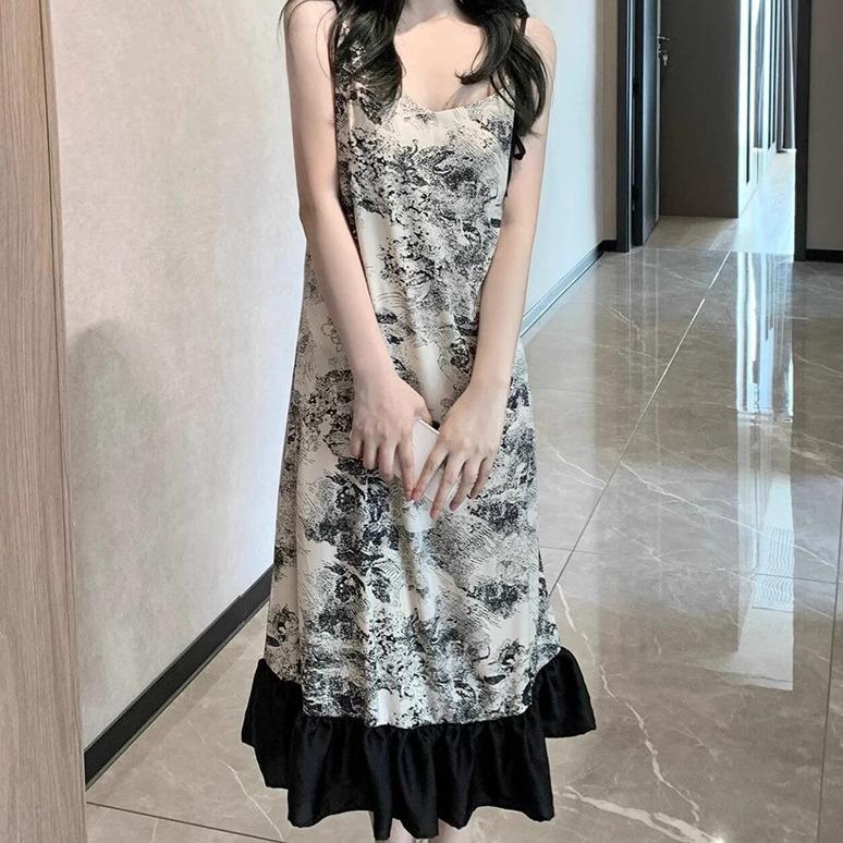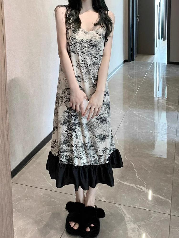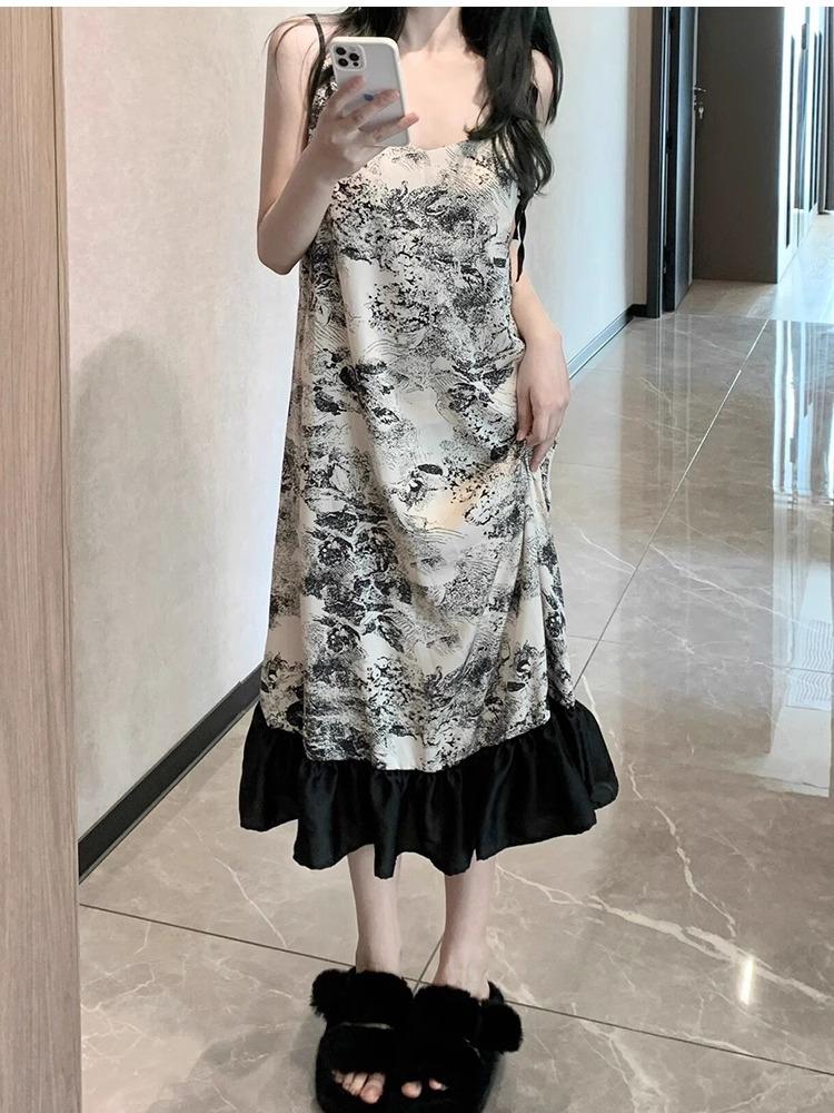 Camisón Sexy Estilo Pintura a Tinta, Ropa de Dormir de Verano para Mujer, Ropa de Descanso, Fino con Almohadillas en el Pecho, Vestido Largo Casual, Estilo Holgazán