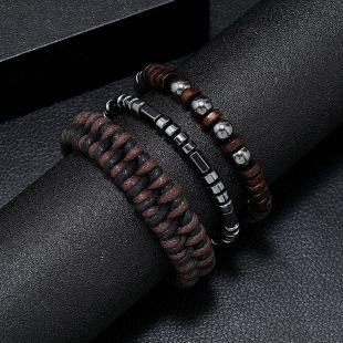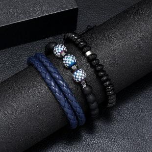 | Pulsera de cuero multicapa para hombre, joyería transfronteriza, pulsera de cuentas de cuero trenzado europeo y americano, venta al por mayor, conjunto de 3 piezas |