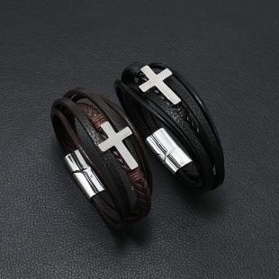 | Pulsera de aleación popular europea y americana para hombre, pulsera cruzada con hebilla magnética, accesorios de cuero trenzado simple multicapa |