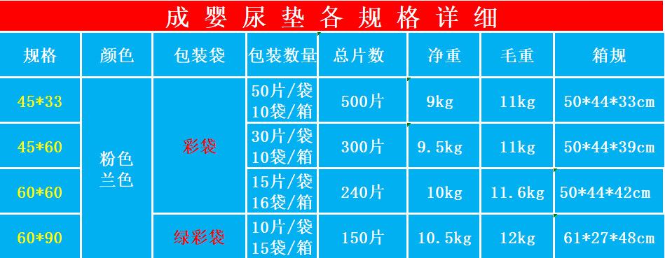 45*33-50 blue, pink, 45*60-30 blue, pink, 60*60-15 blue, 60*90-10 blue, pink