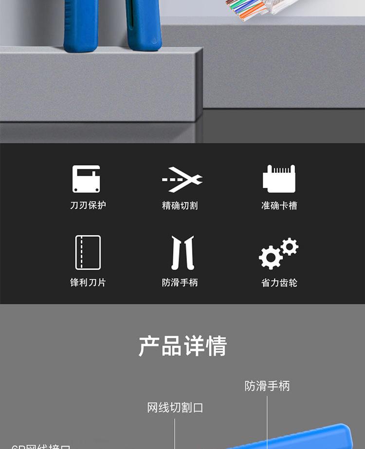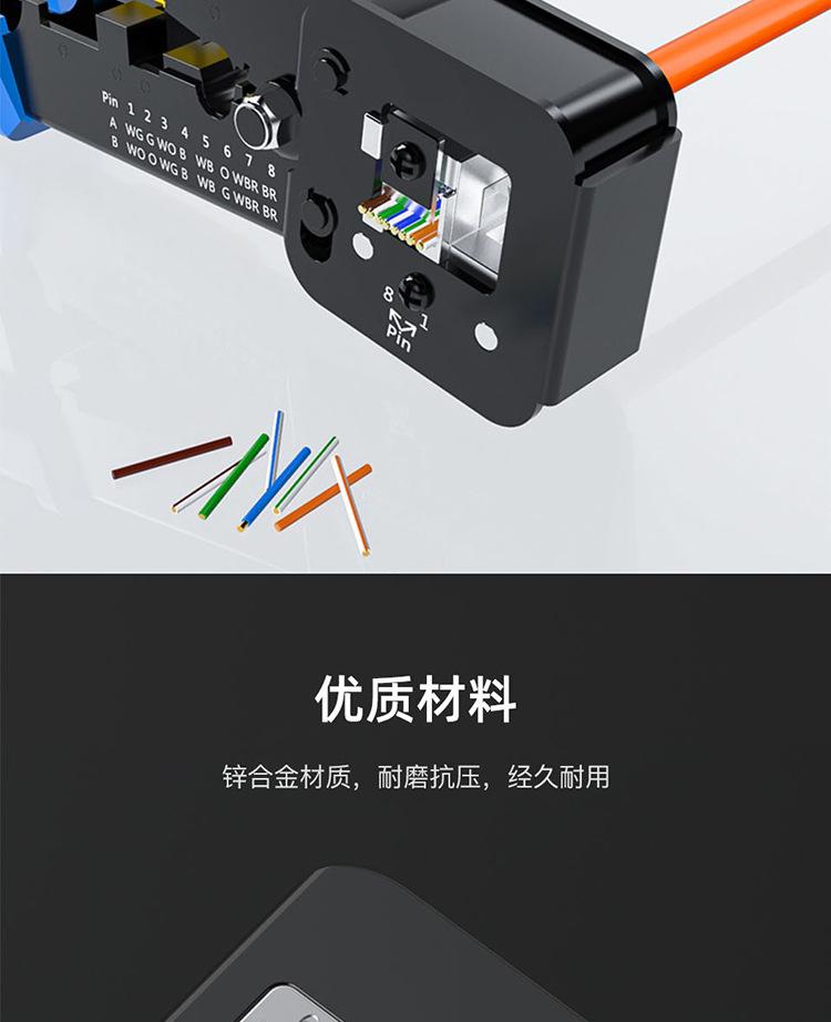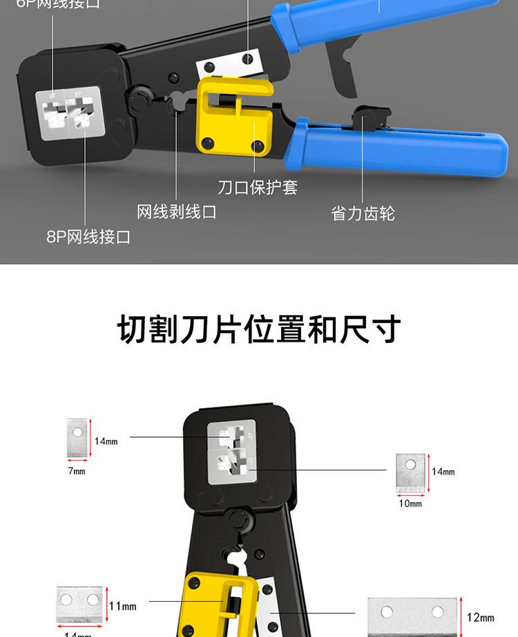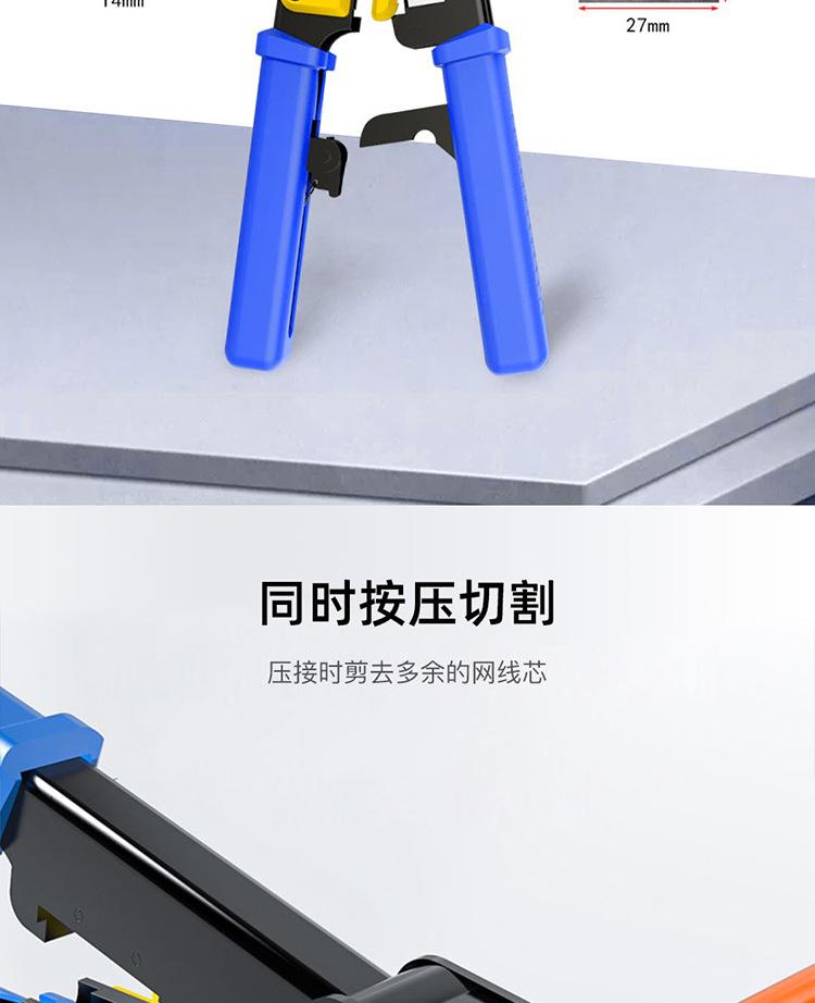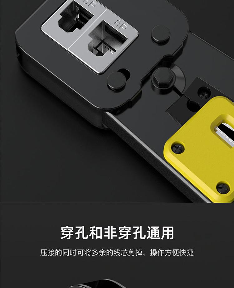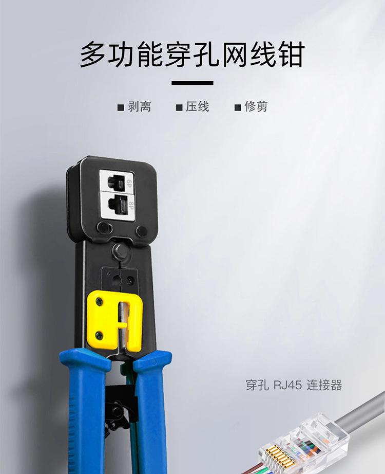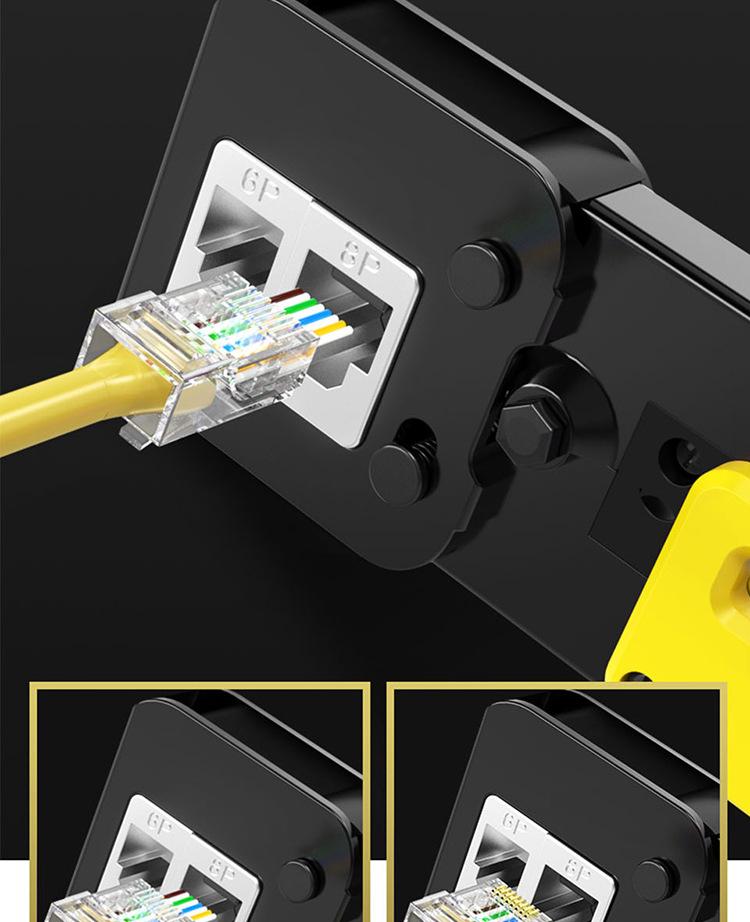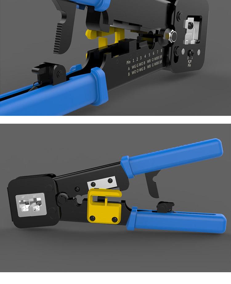 Pinzas multifuncionales para cable de red de paso, pinzas de crimpado para conector cristal 6P/8P perforado, estas pinzas de paso integran todas las funciones de las pinzas para cable de red, y pueden realizar operaciones de corte, crimpado, pelado de cable de red, entre otras.