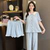 Pijama de verano de tres piezas para mujer, bonito cárdigan de algodón con solapa y nubes dulces, pantalones de manga corta, ropa fina para el hogar.