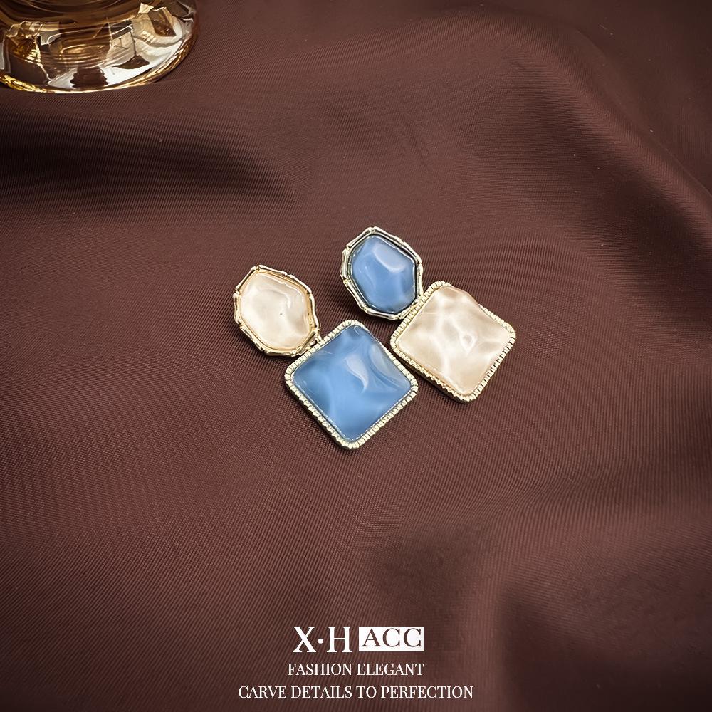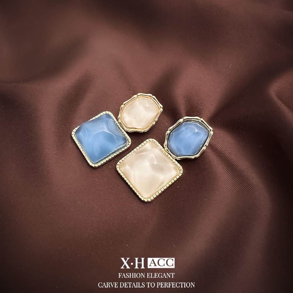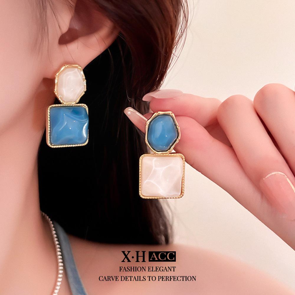 Pendientes cuadrados asimétricos brillantes de aguja plateada azul, pendientes elegantes de nicho simple, pendientes ligeros de lujo de alta gama
