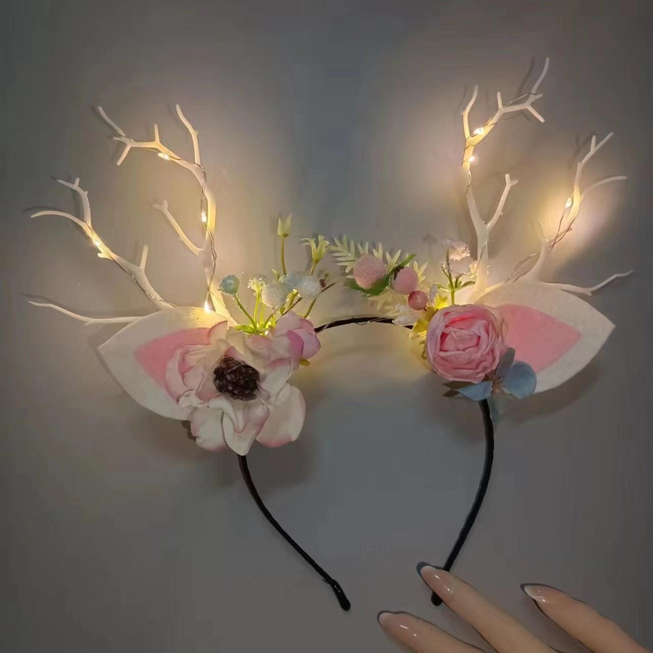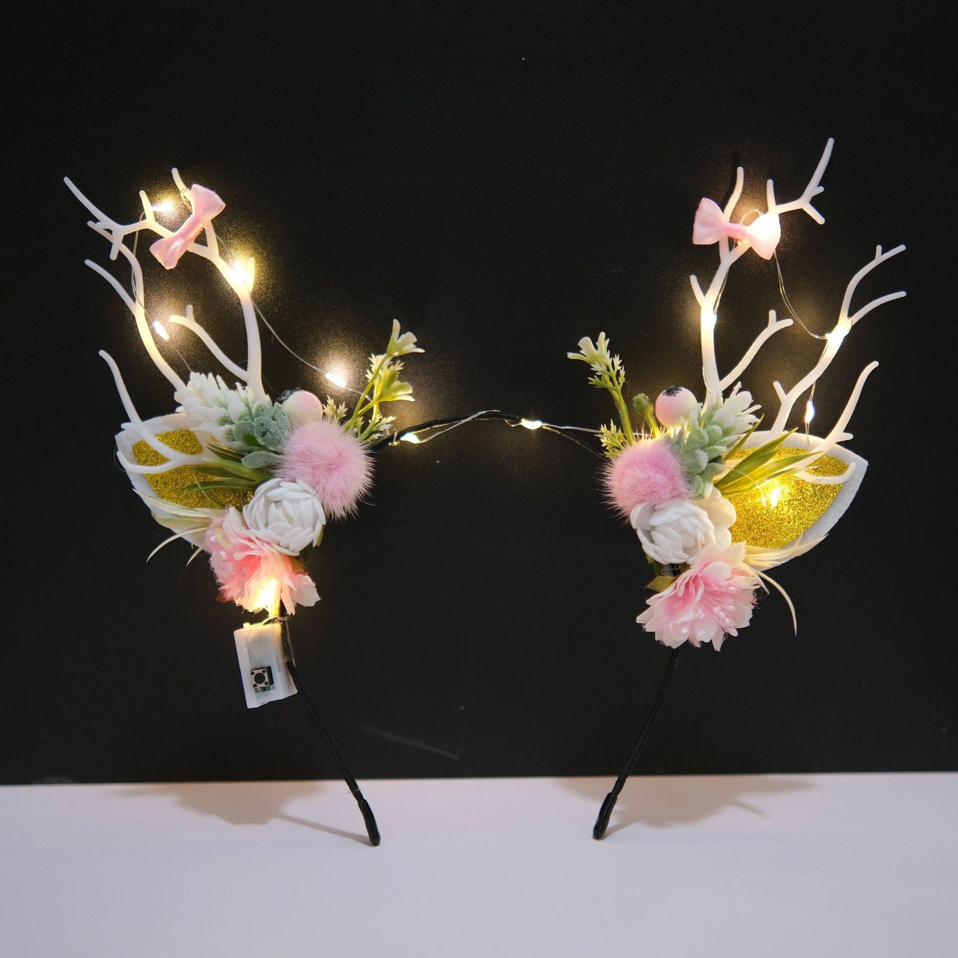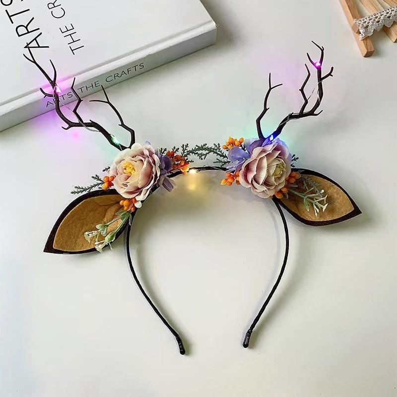Diadema Navideña Brillante Diadema de Astas de Hada de Flores Luces Intermitentes Tocado de Reno Navideño Diadema de Lujo Ligero de Alta Gama