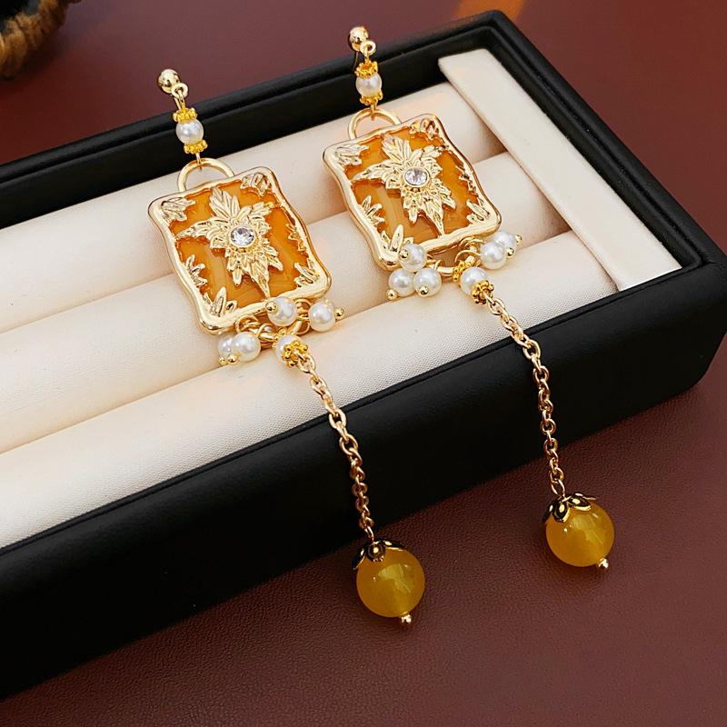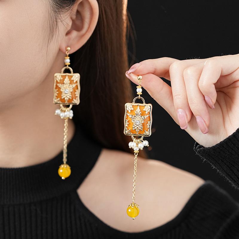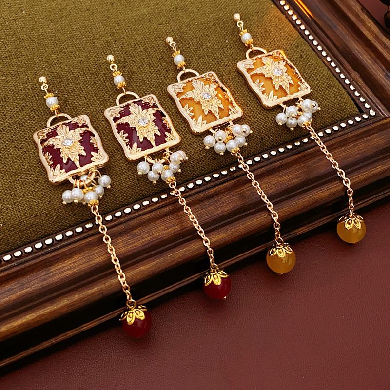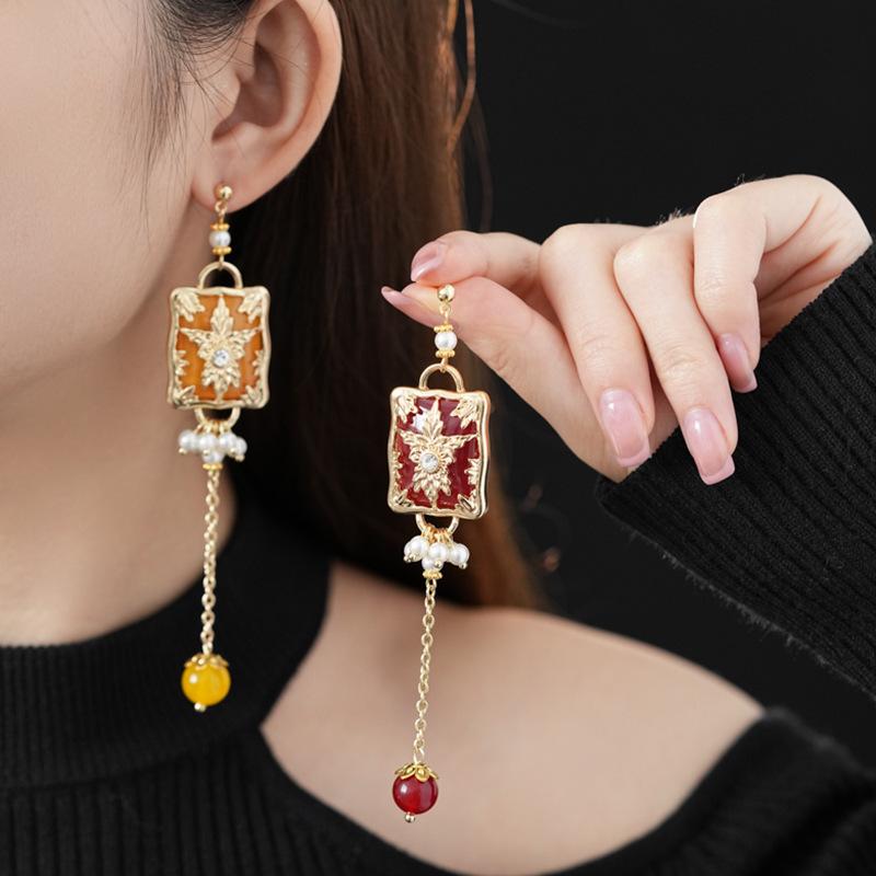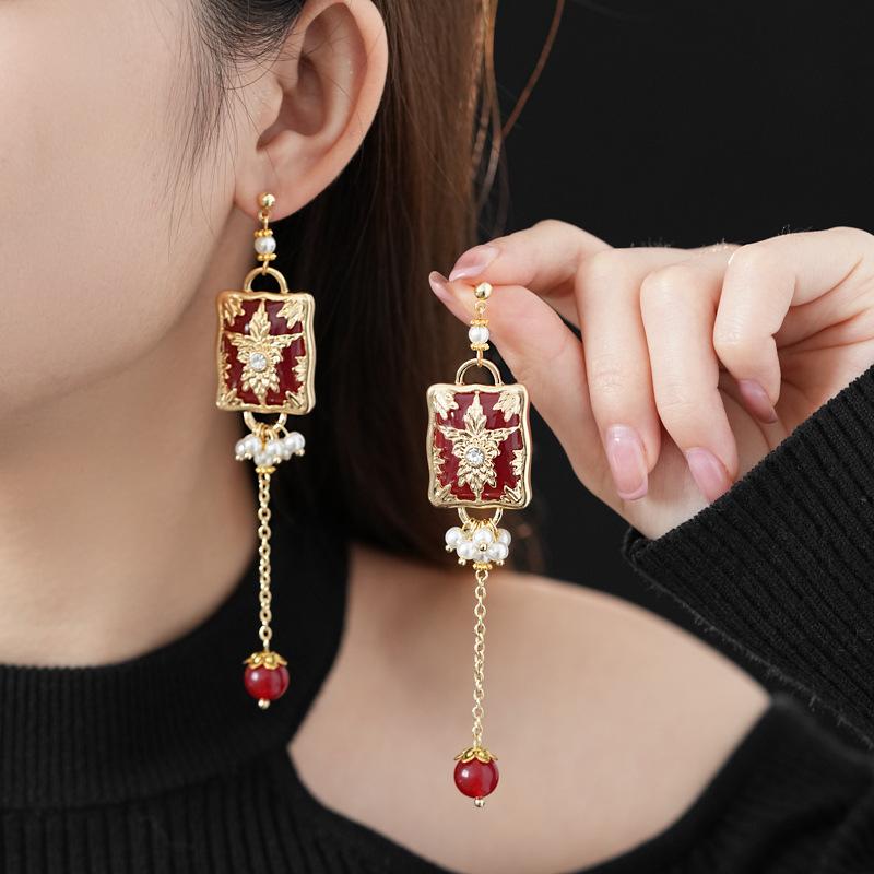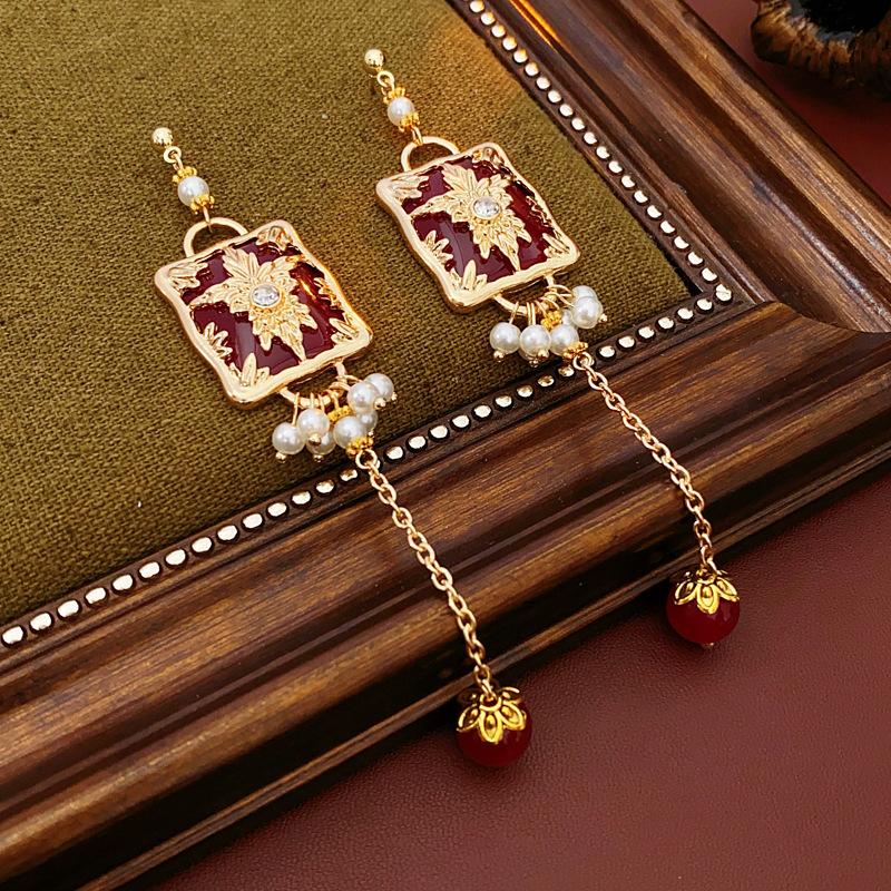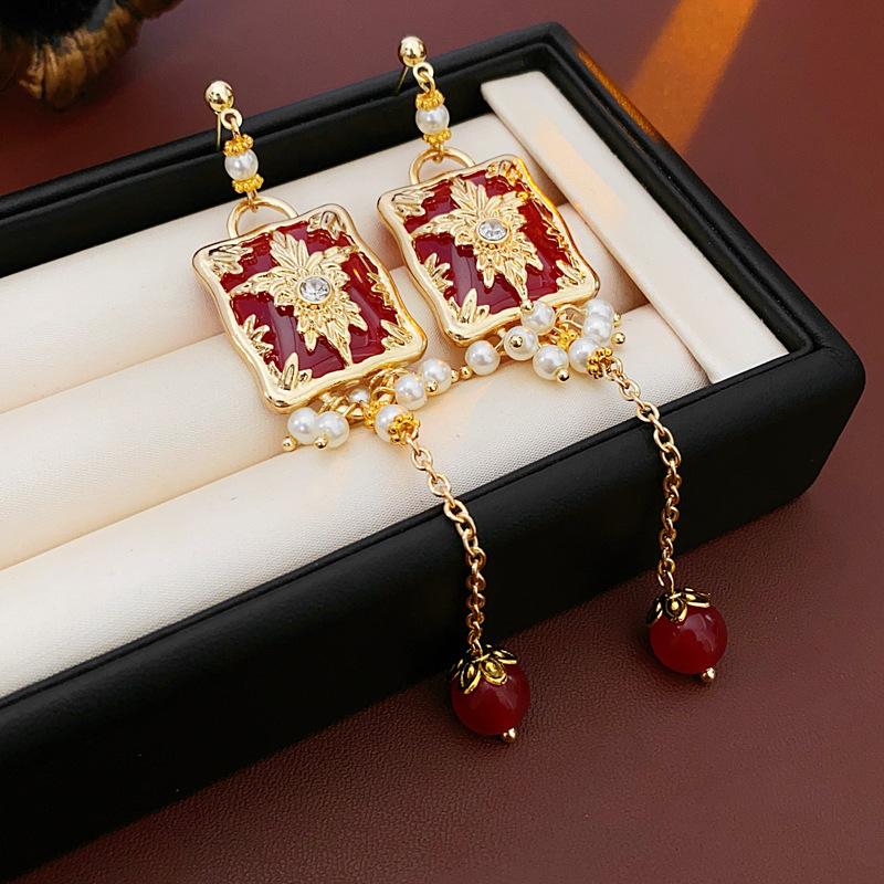 Aretes de Aguja de Plata Vintage Medievales con Diamantes, Perlas Artificiales Cuadradas de Flores, Aretes de Borla, Aretes de Alta Gama