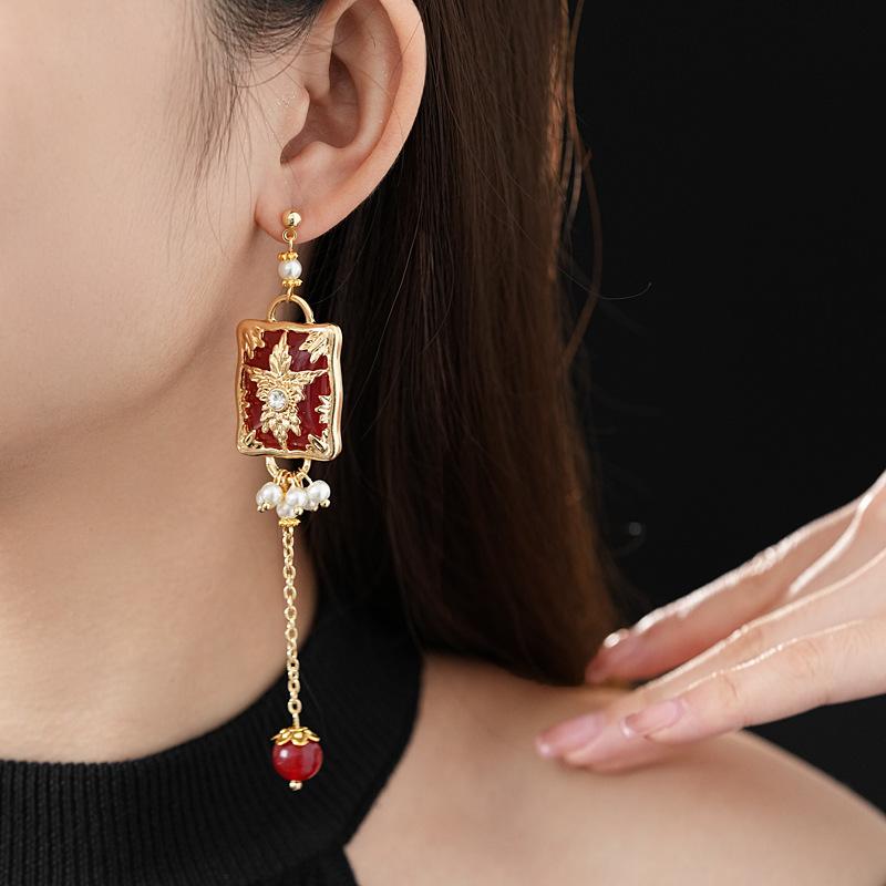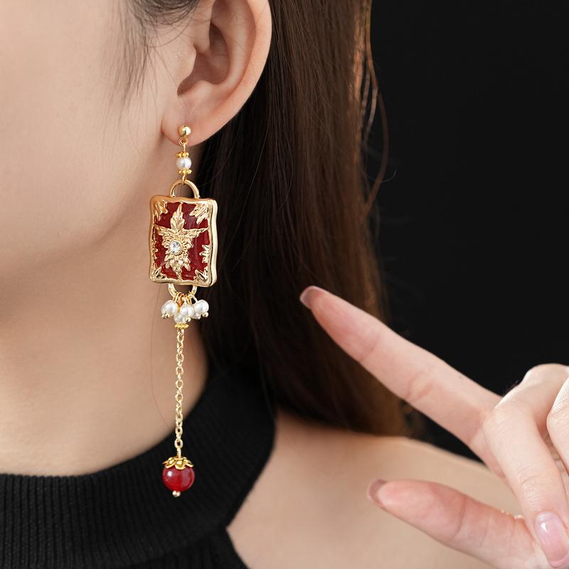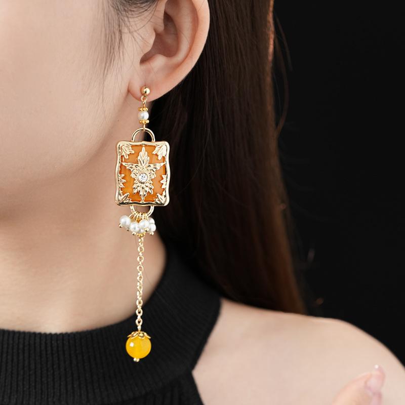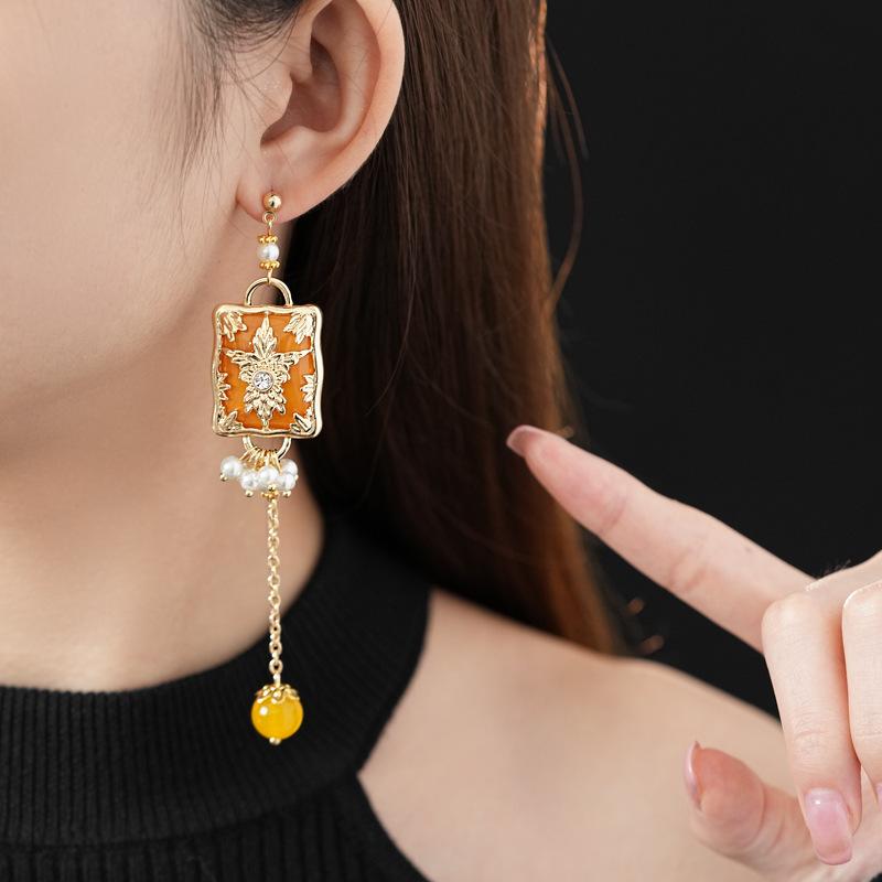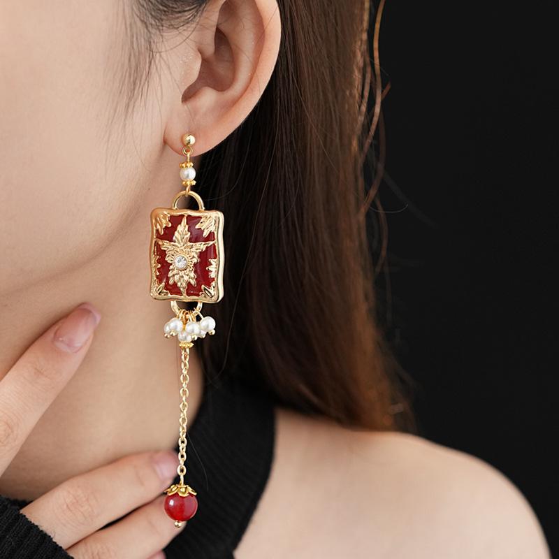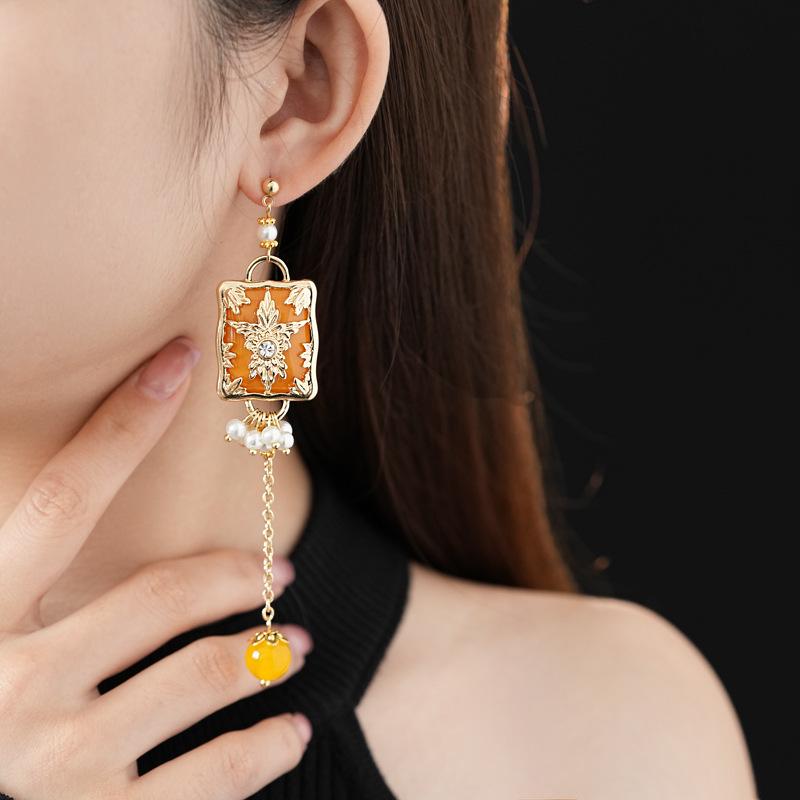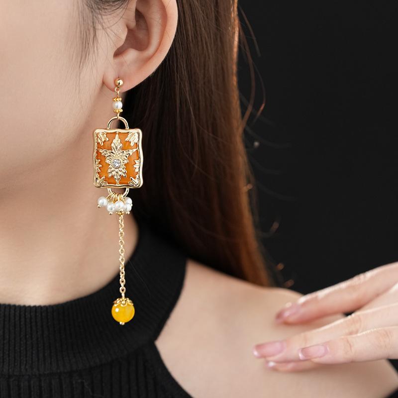 Aretes de Aguja de Plata Vintage Medievales con Diamantes, Perlas Artificiales Cuadradas de Flores, Aretes de Borla, Aretes de Alta Gama