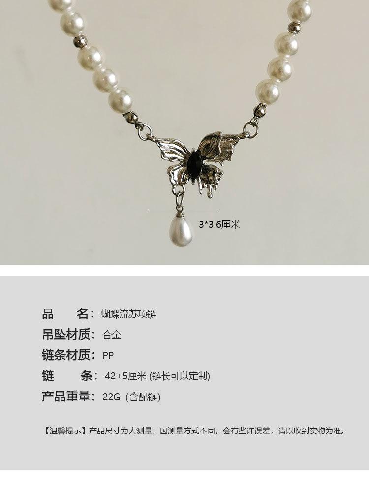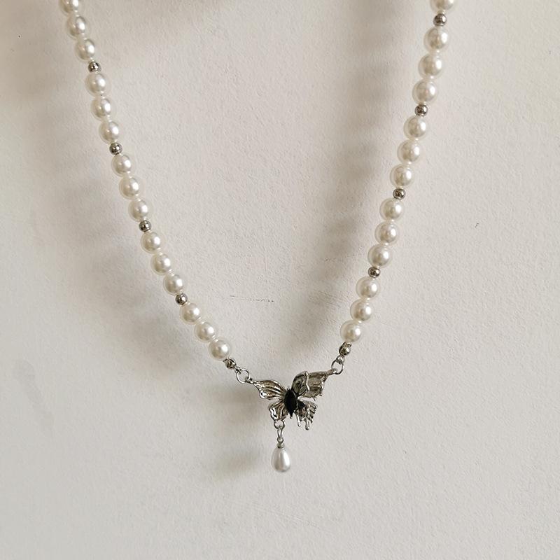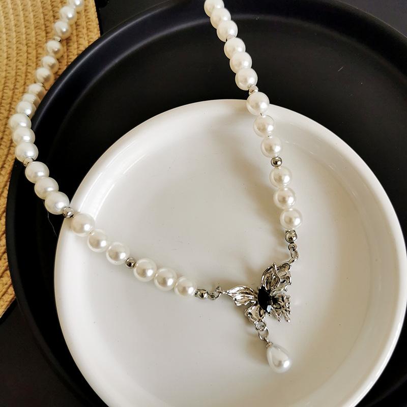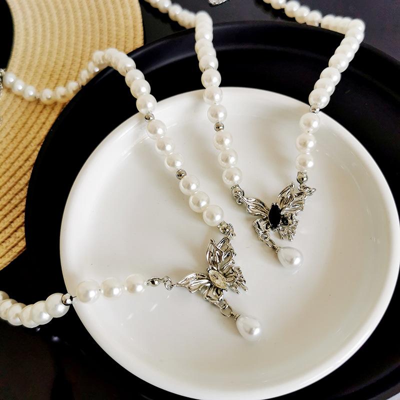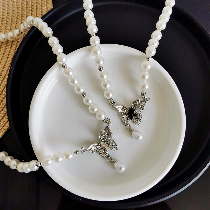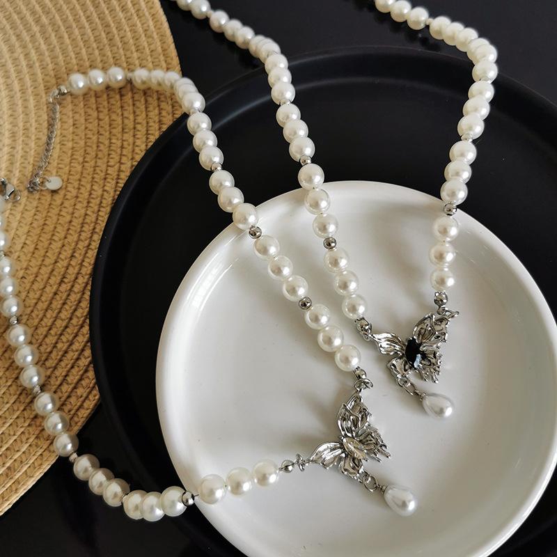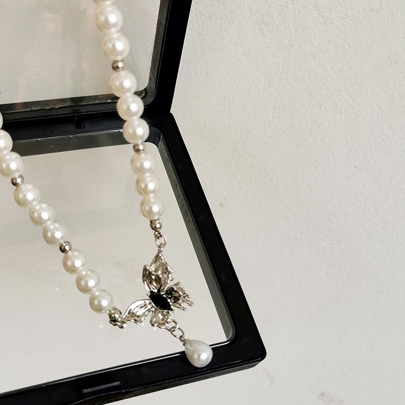 Pearl chain white diamond water drop butterfly necklace, Pearl chain black diamond water drop butterfly necklace