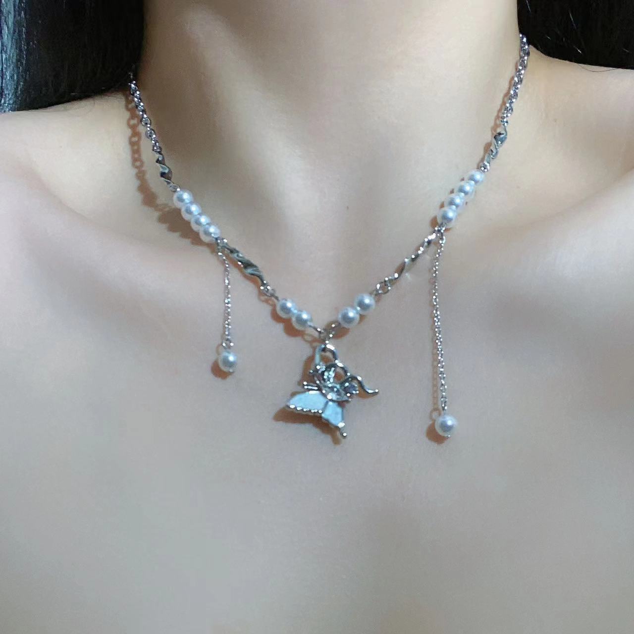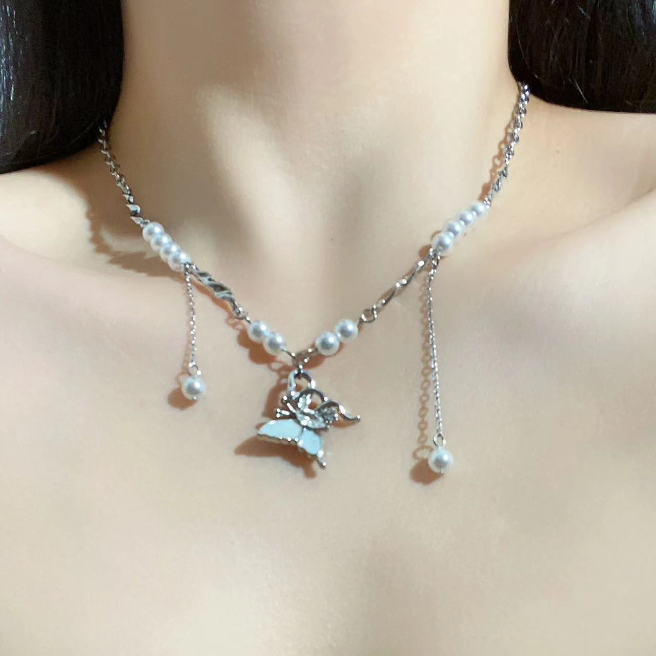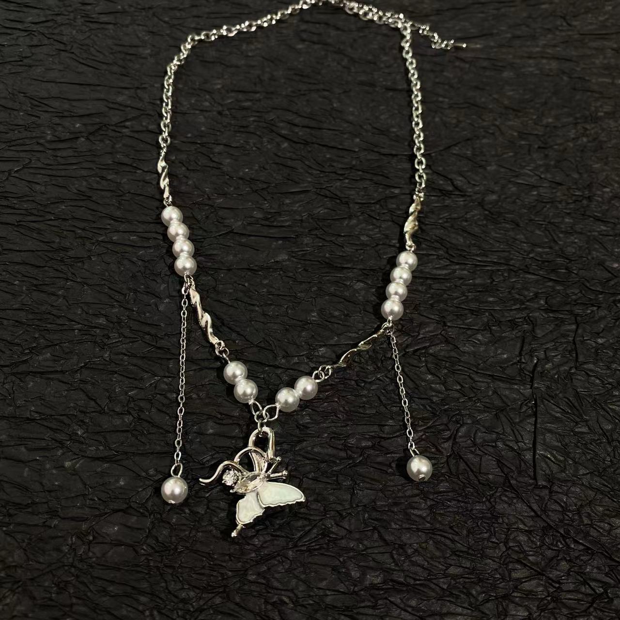 Collar con colgante de mariposa y perla dulce para mujer, cadena de cuello de nicho de lujo ligero de alta gama, exquisito estilo nuevo, elegante cadena de clavícula ~