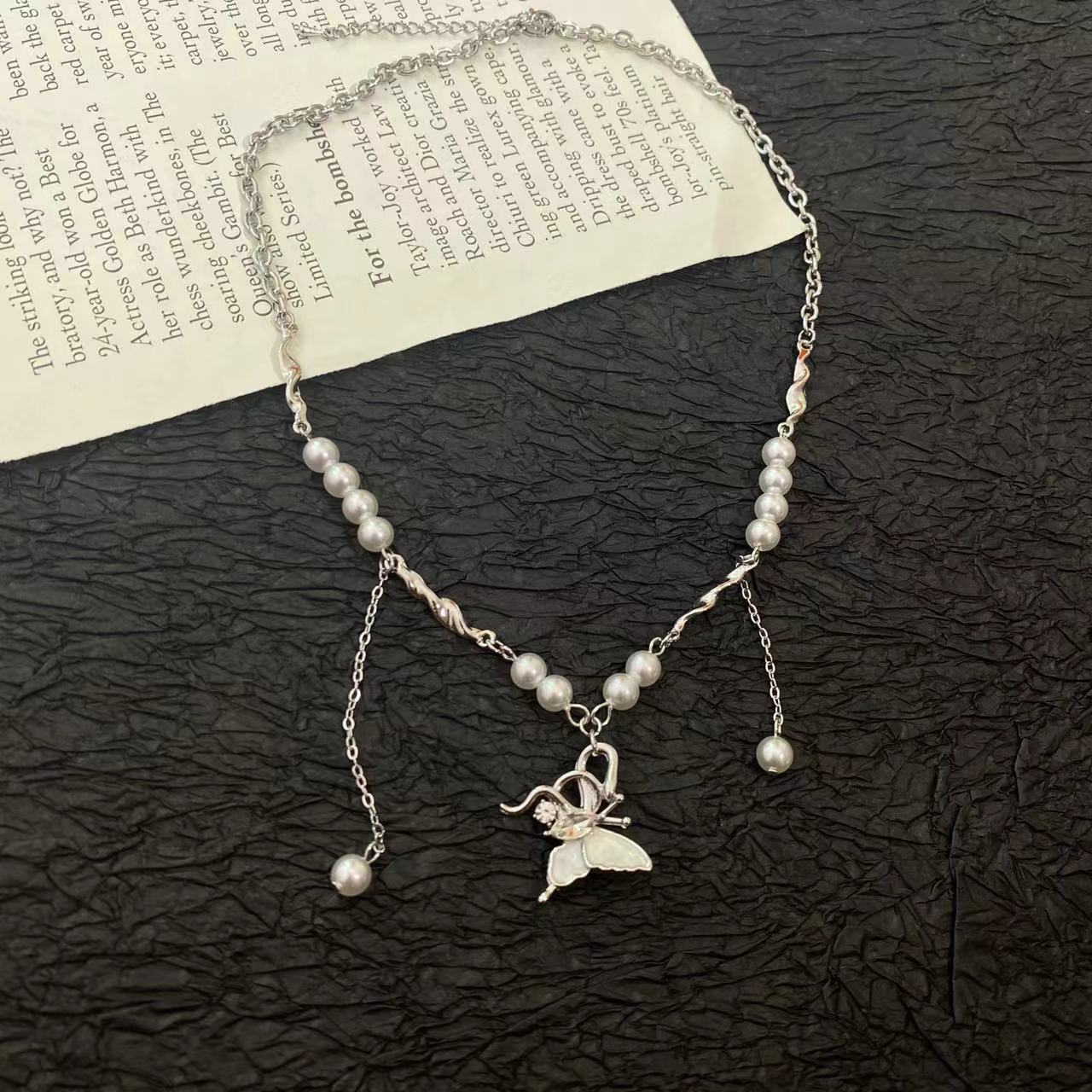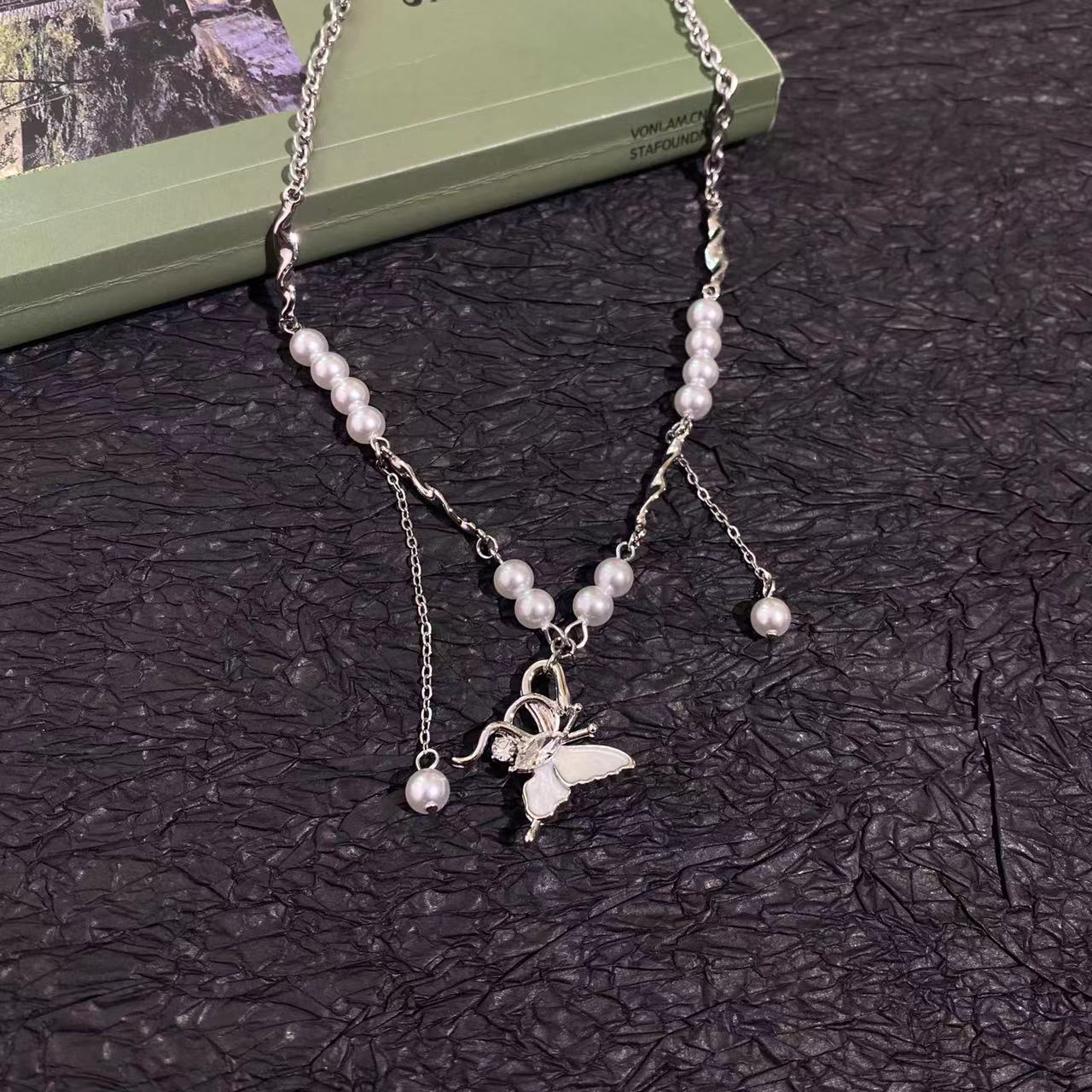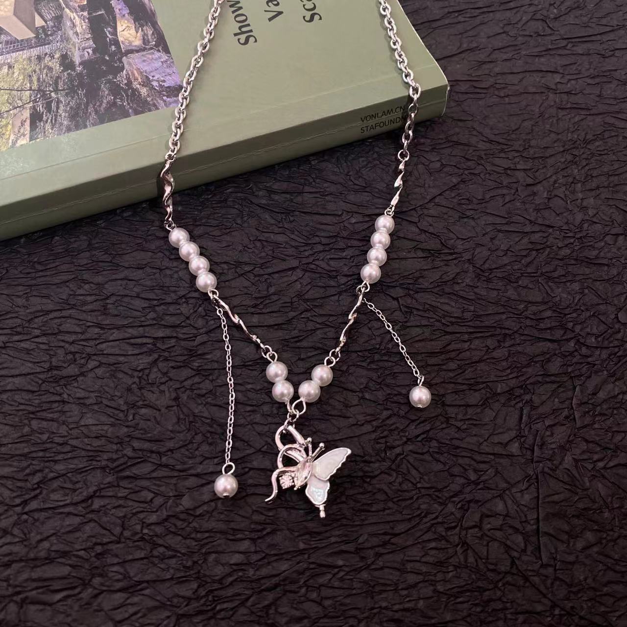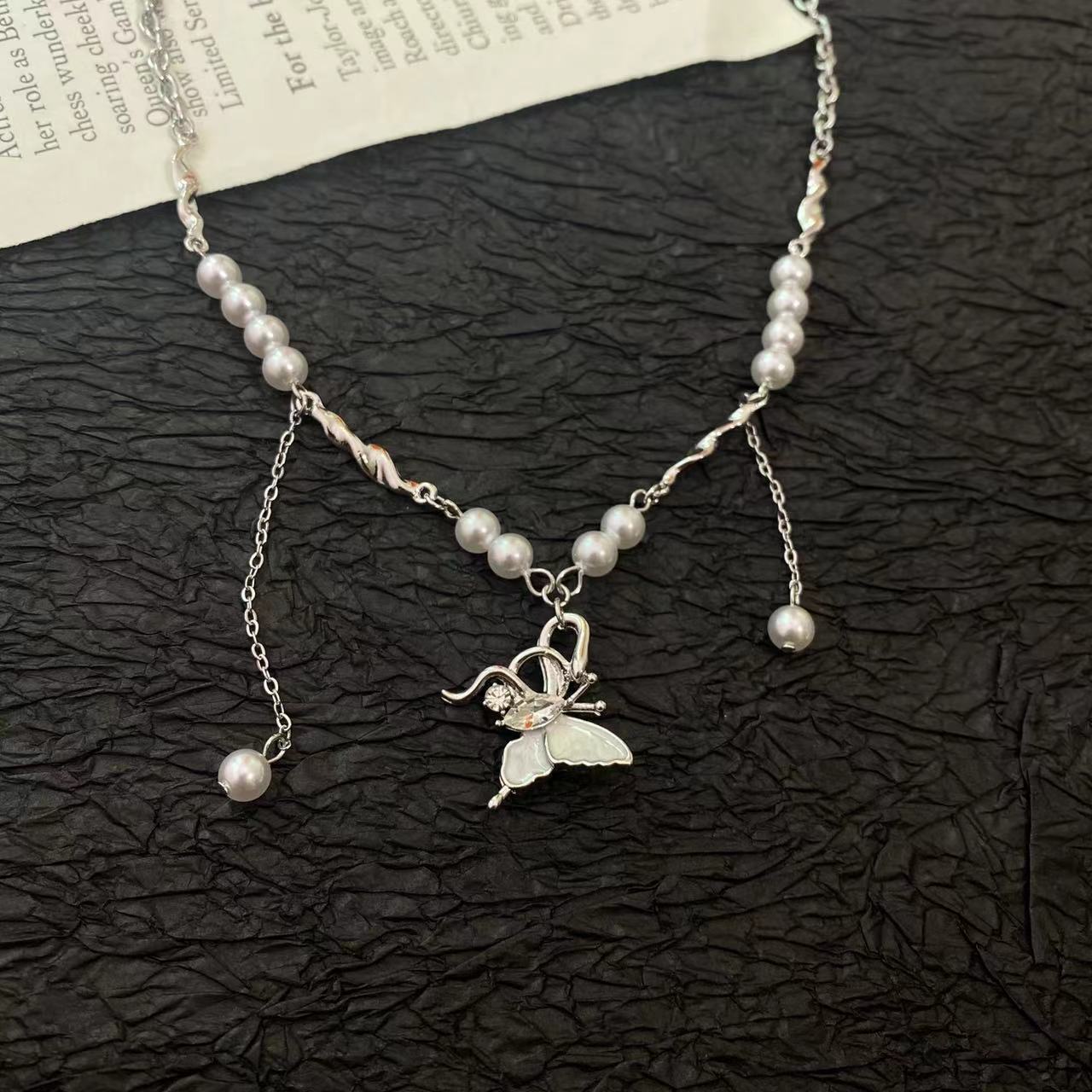 Collar con colgante de mariposa y perla dulce para mujer, cadena de cuello de nicho de lujo ligero de alta gama, exquisito estilo nuevo, elegante cadena de clavícula ~