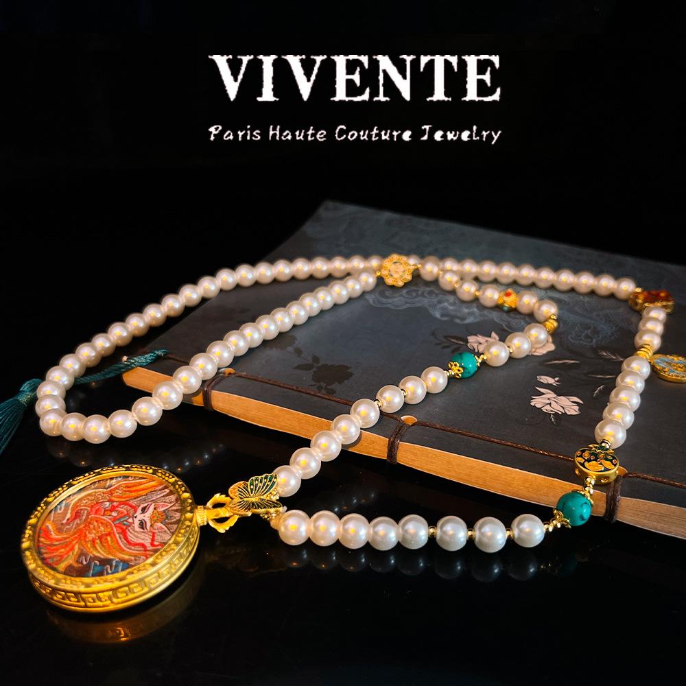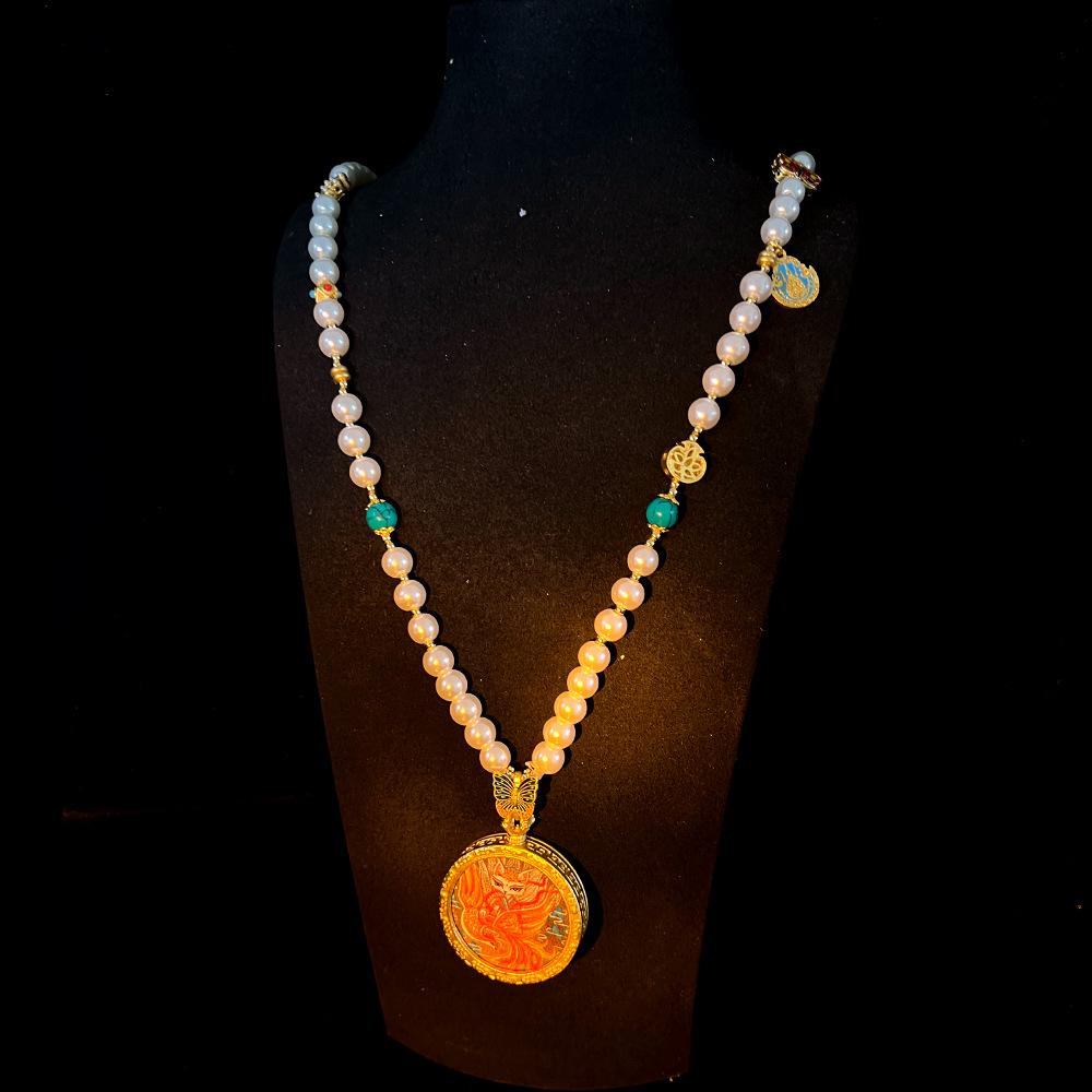 Nuevo Estilo Chino Cuentas Largo Caqui Estilo Tibetano Thangka Zorro de Nueve Colas Estilo Nacional Clásico de Alta Gama Cadena de Lana de Doble Cara