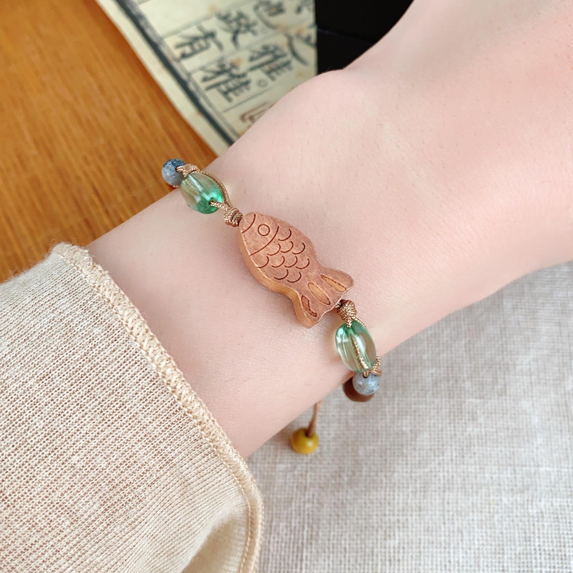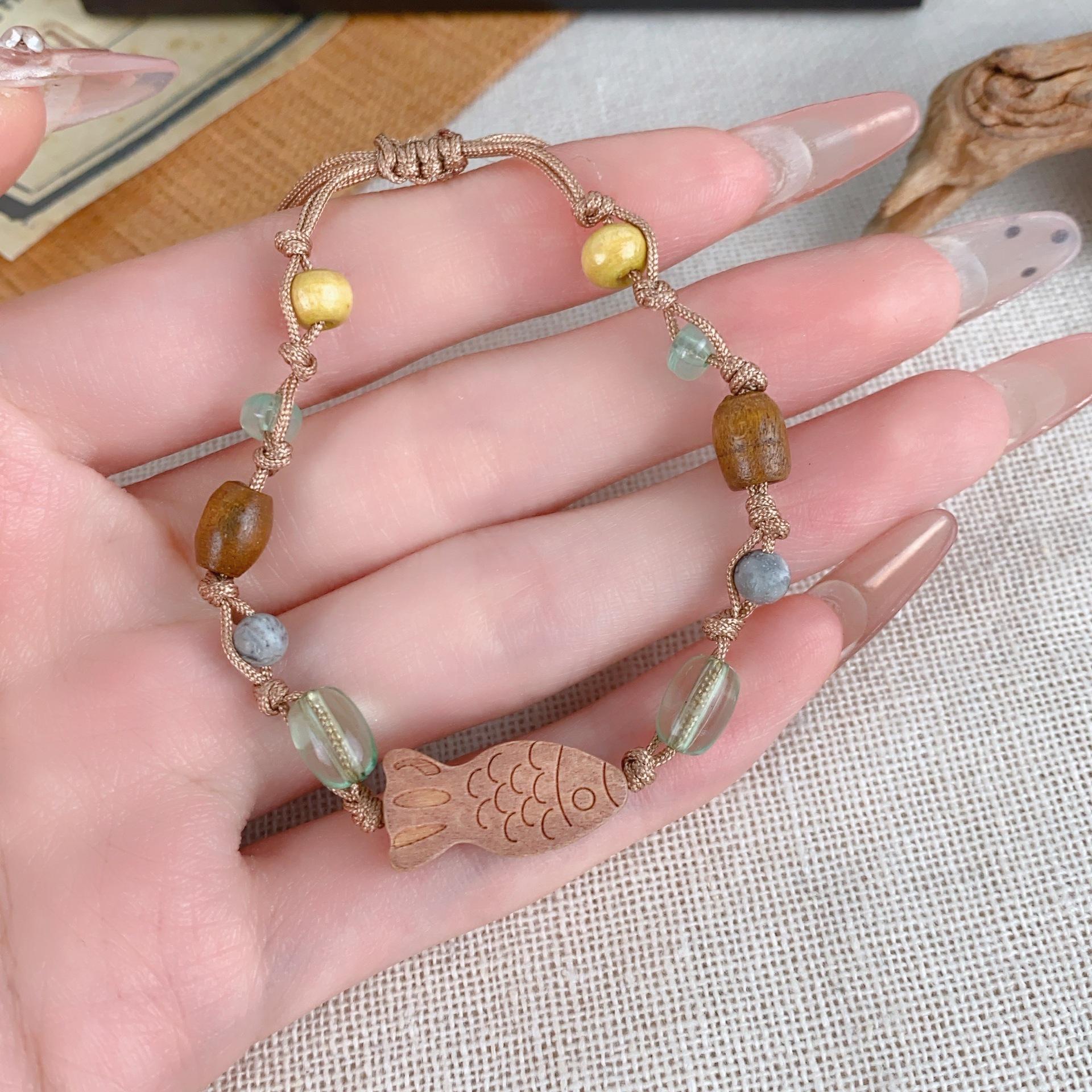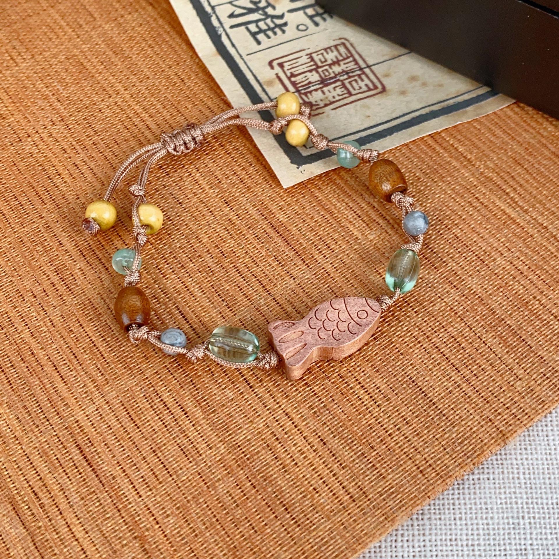 Pulsera de Mano de Cuerda de Madera Estilo Chino Nuevo Pez Koi Estilo Nacional Caoba Cool Vintage Hecha a Mano Tejida Nicho Estilo Ins Pulsera de Novia