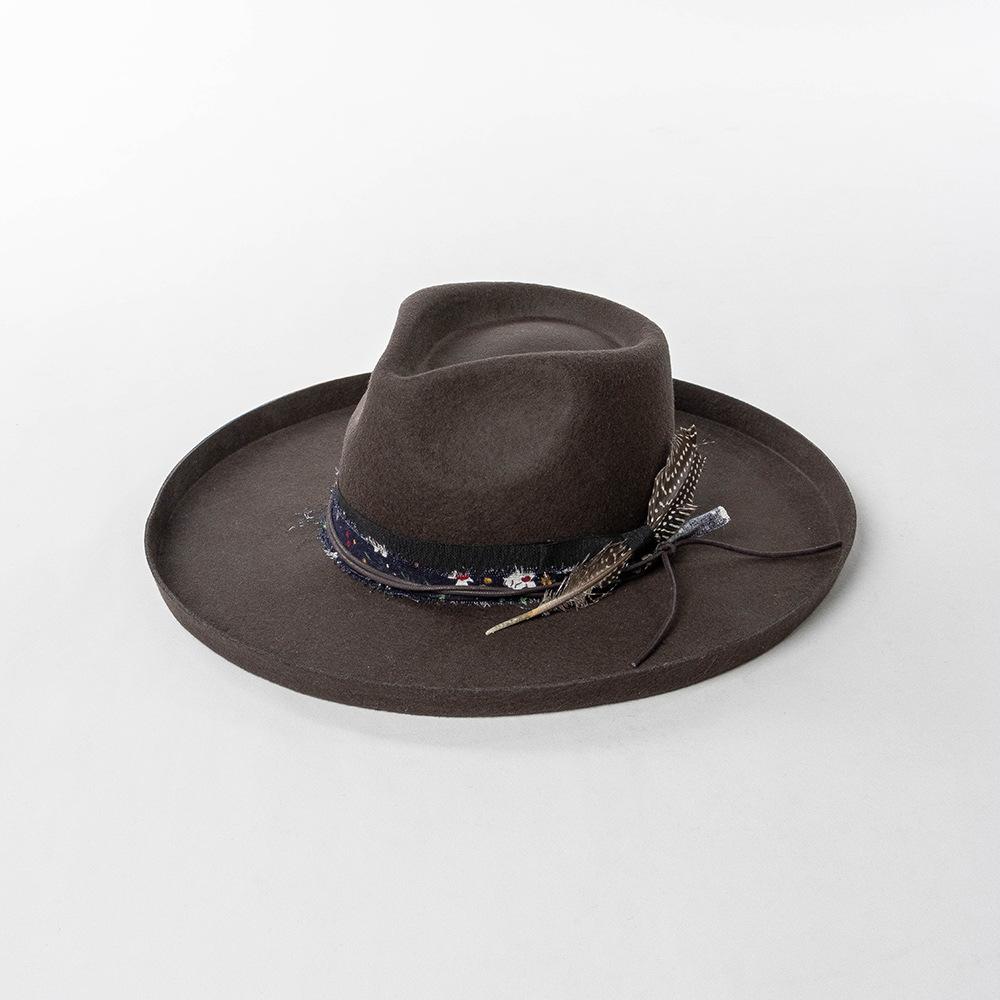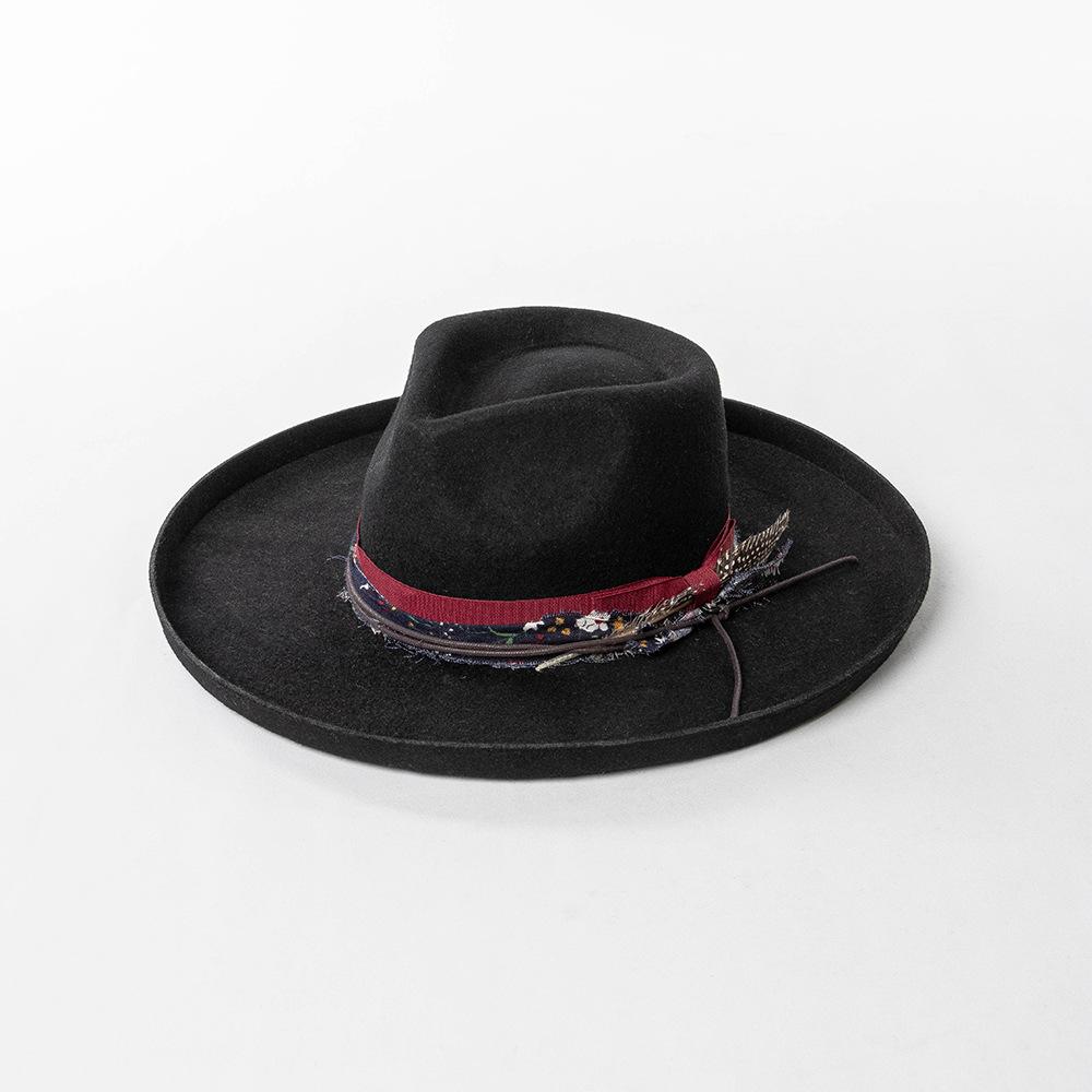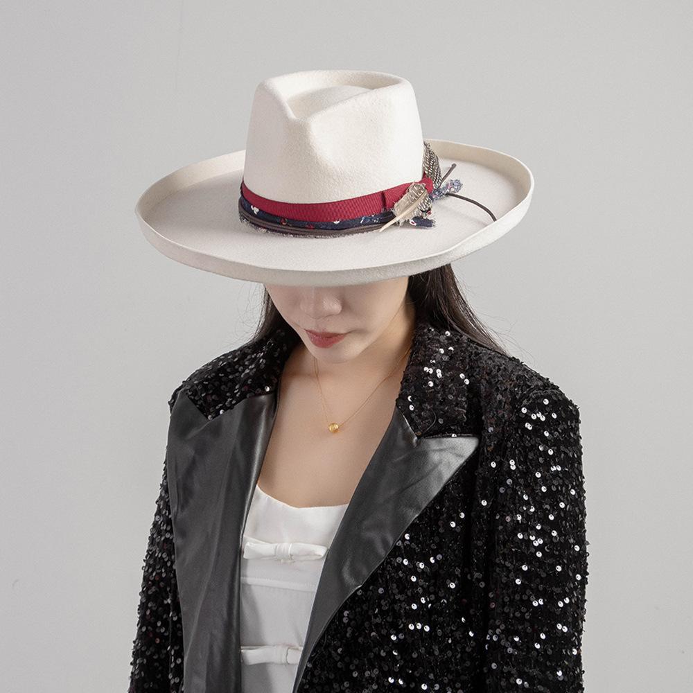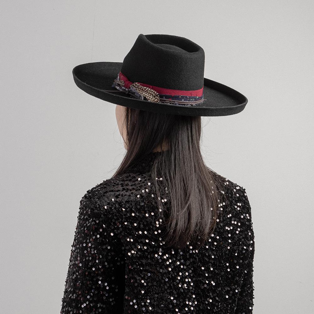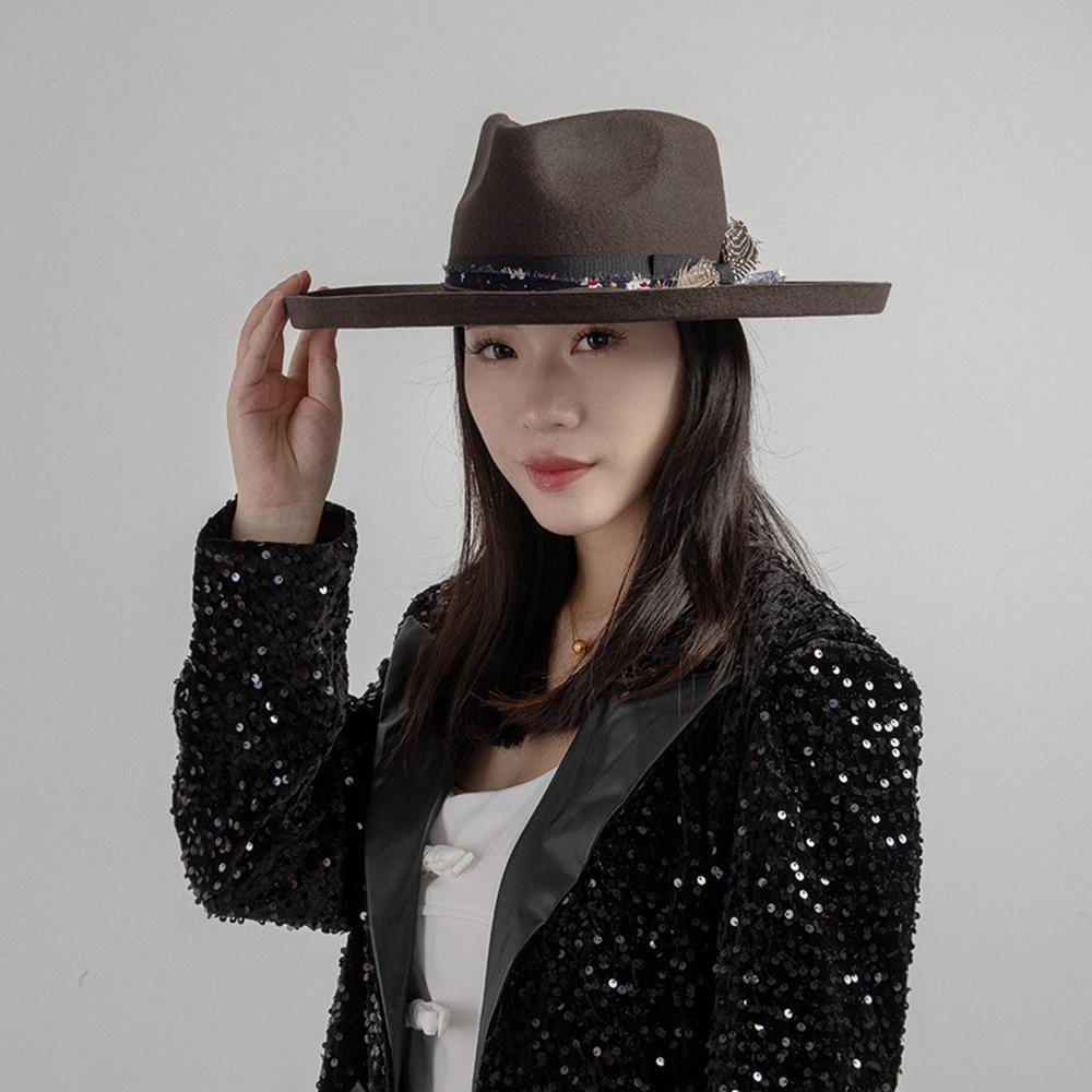 Sombrero de jazz de tweed de lana de ala ancha con borde deformado y plumas de tejido floral informal de moda transfronteriza de otoño e invierno, sombrero británico