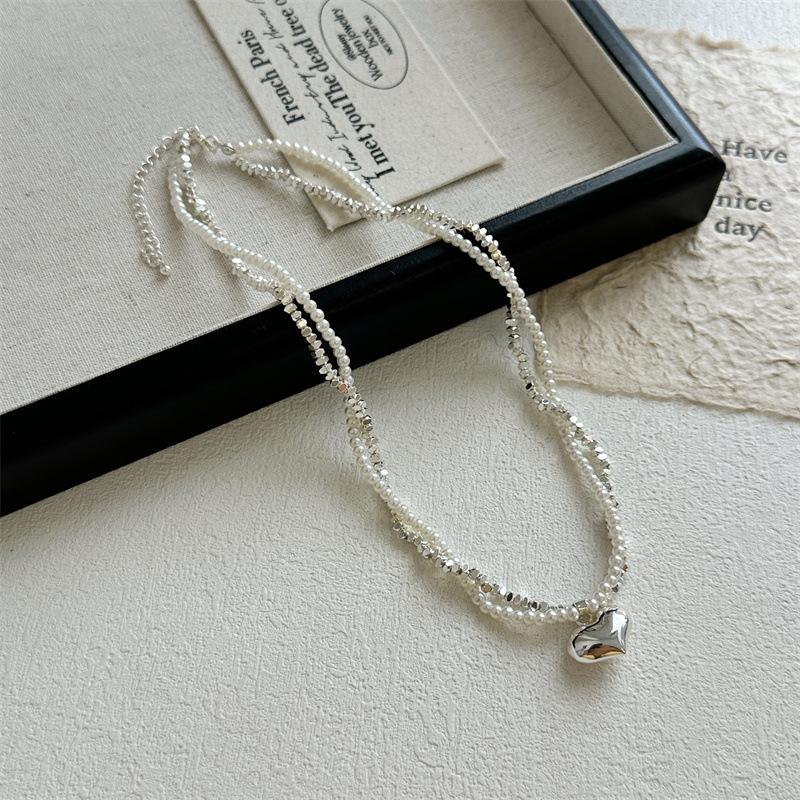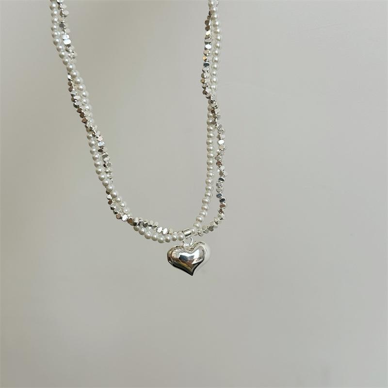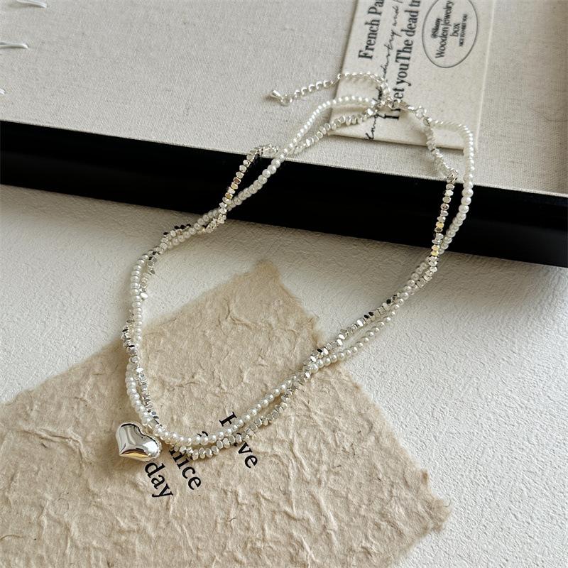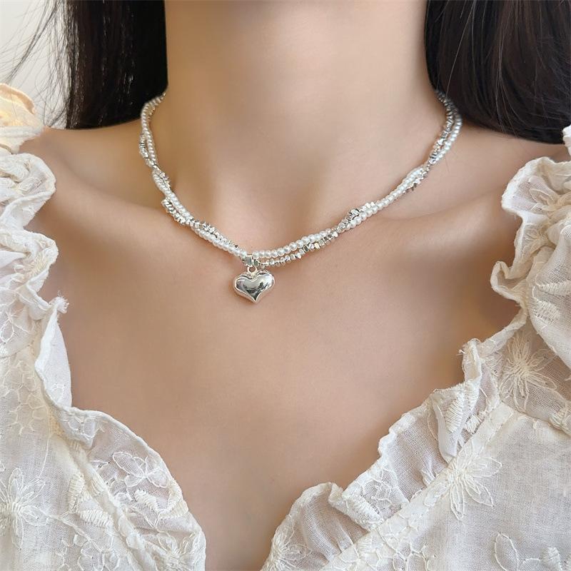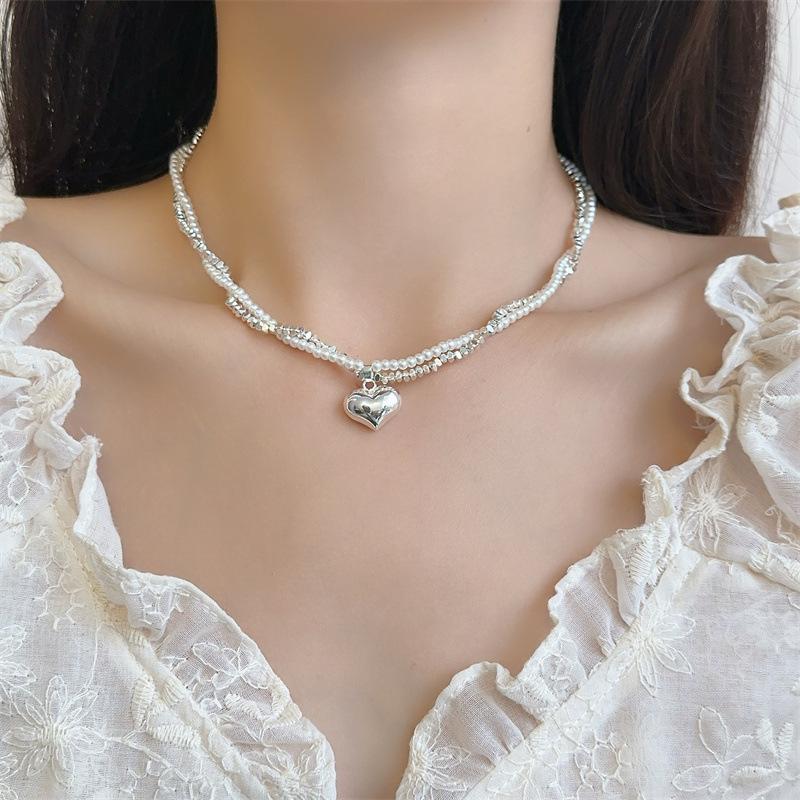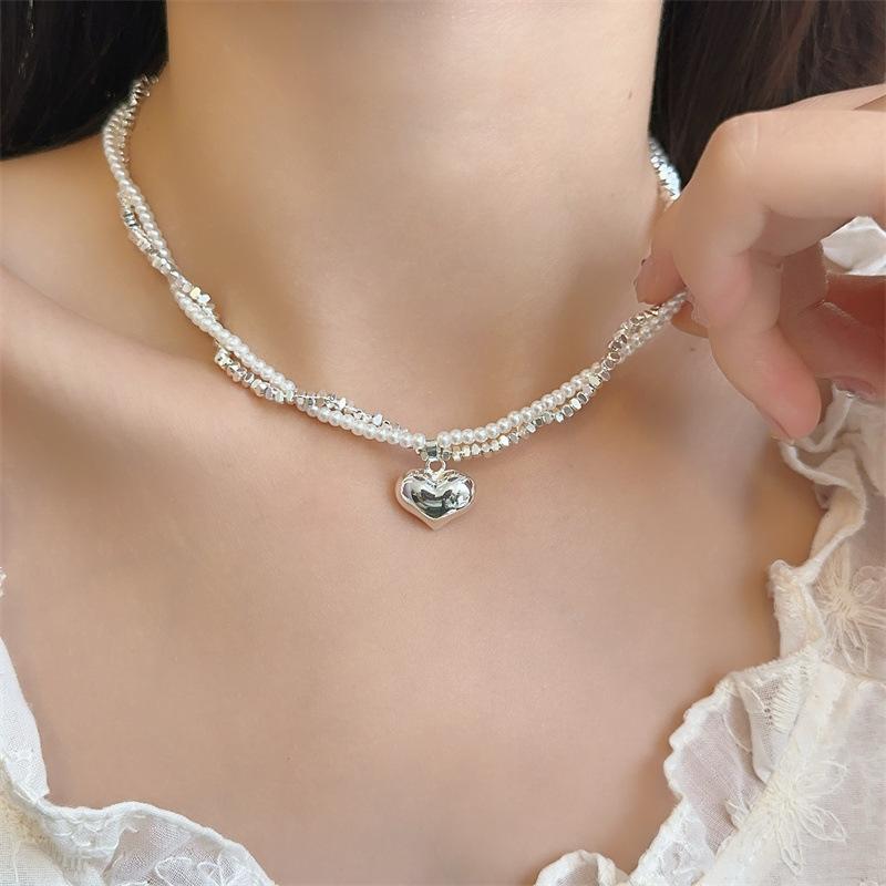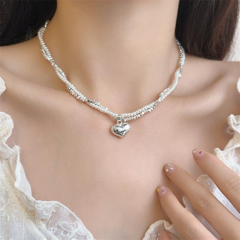 Estilo Lujo Francés de Entrada Plata Rota Romántica Perla Amor Colgante Collar de Doble Capa Collar de Alta Gama Cadena para Clavícula Accesorios