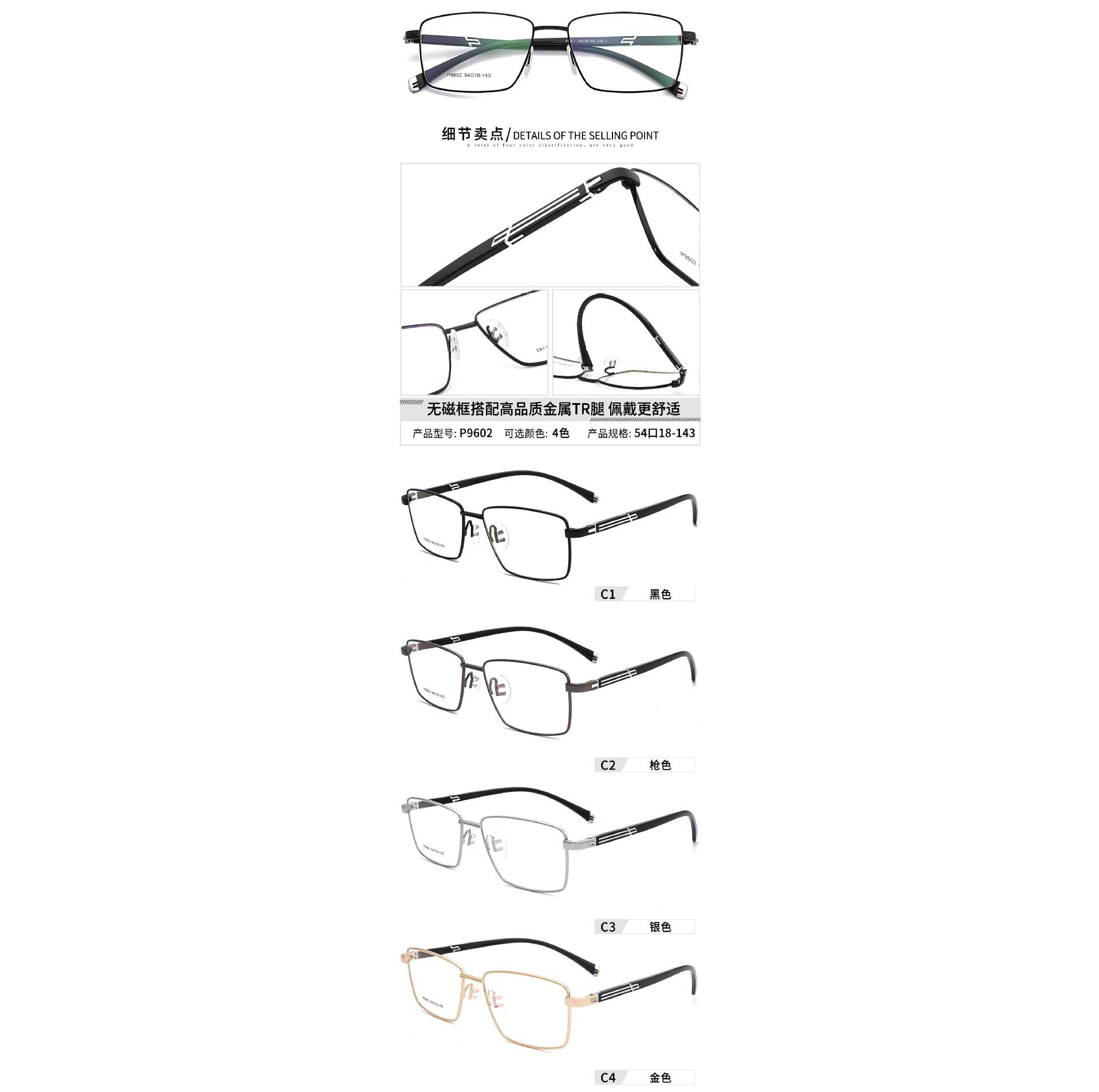 Nueva montura de gafas con montura no magnética y patas TR de metal de alta calidad para usar cómodamente en la oficina o en el trabajo. P9602