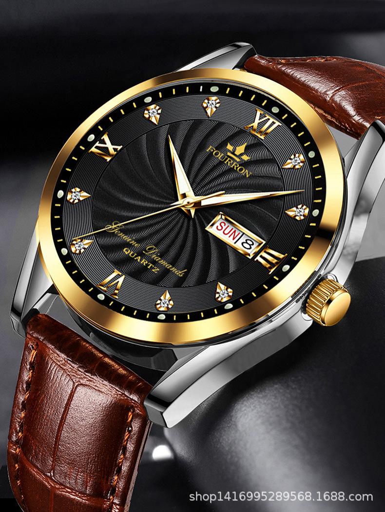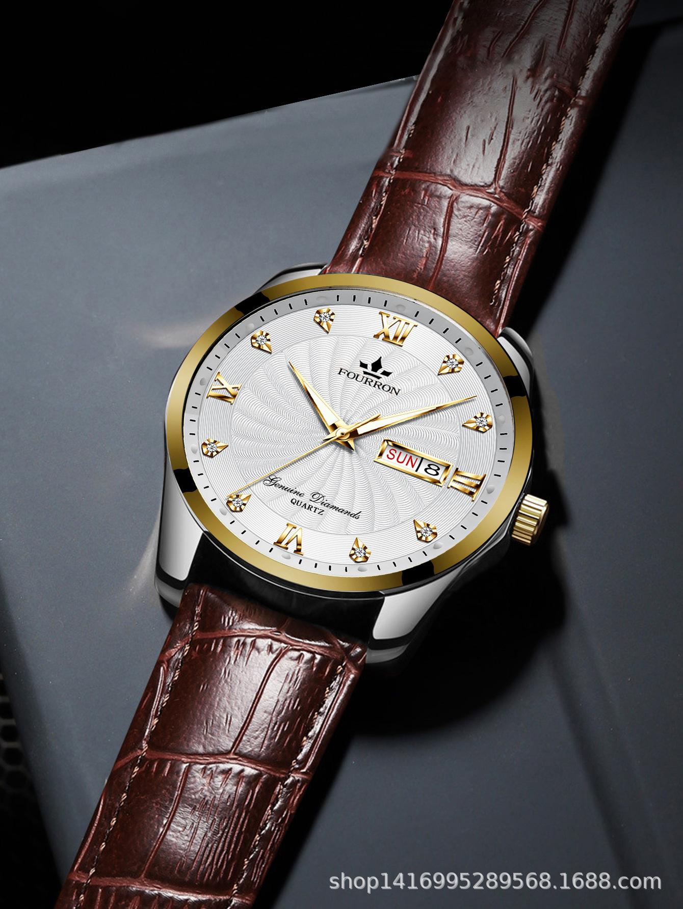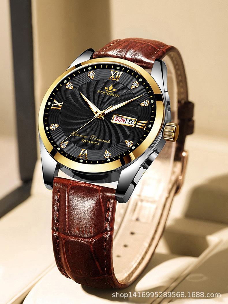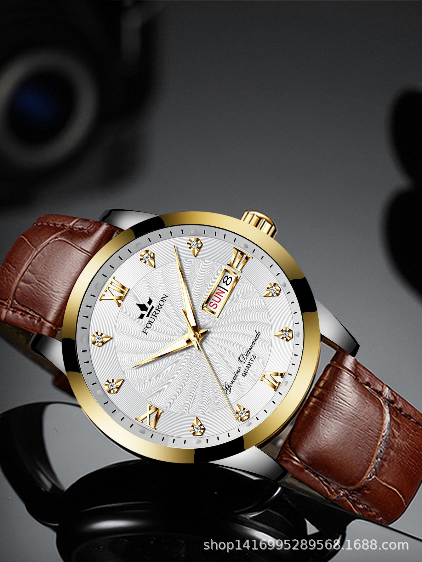 Compra Reloj de cuarzo luminoso con doble calendario y incrustaciones de diamantes para hombre con correa de cuero genuino, reloj TikTok Live al por mayor en Joom.pro