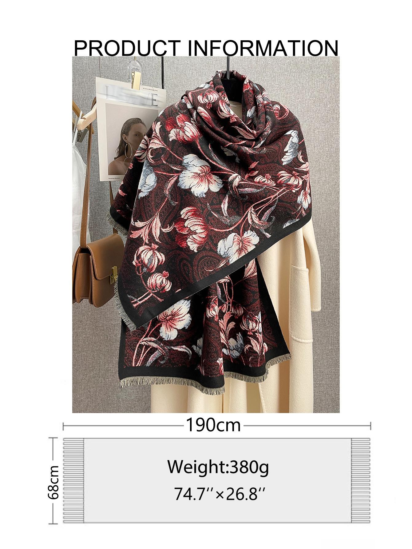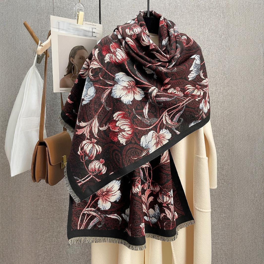Bufanda elegante con flores para otoño e invierno, de cachemira de doble cara, cálida y gruesa, larga, para mujer, chal elegante que combina con todo.