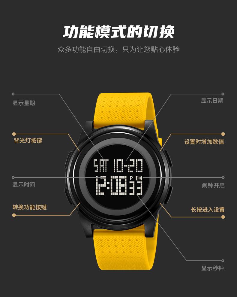 Funciones: 2 tiempos, cronómetro, fecha, alarma temporizador, semana, EL luminoso, señal horaria, formato 12/24 horas, cuenta regresiva.