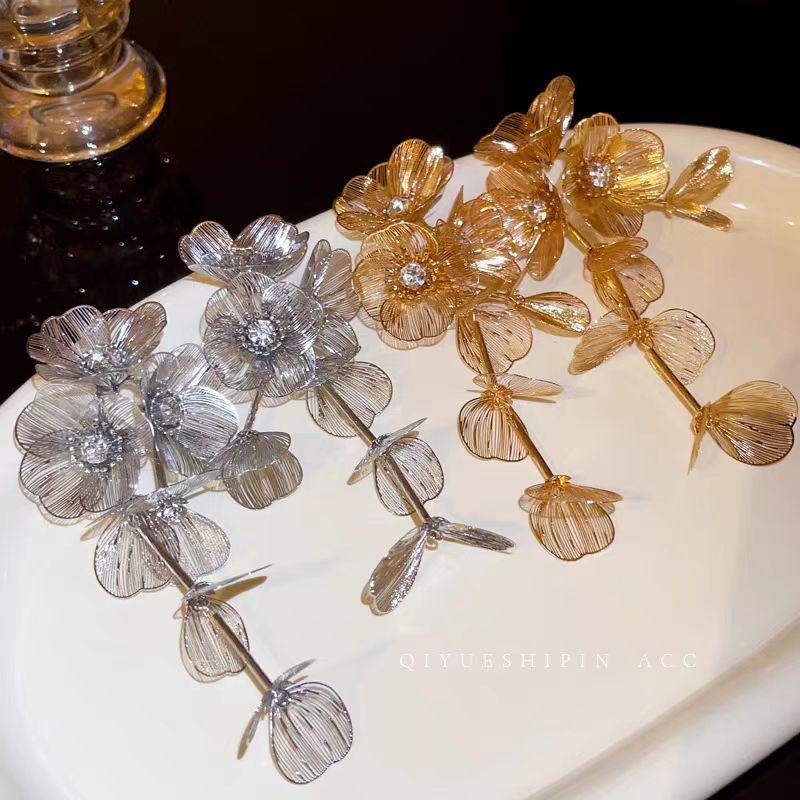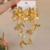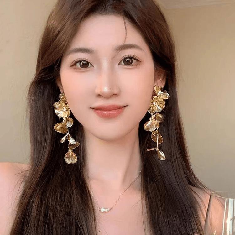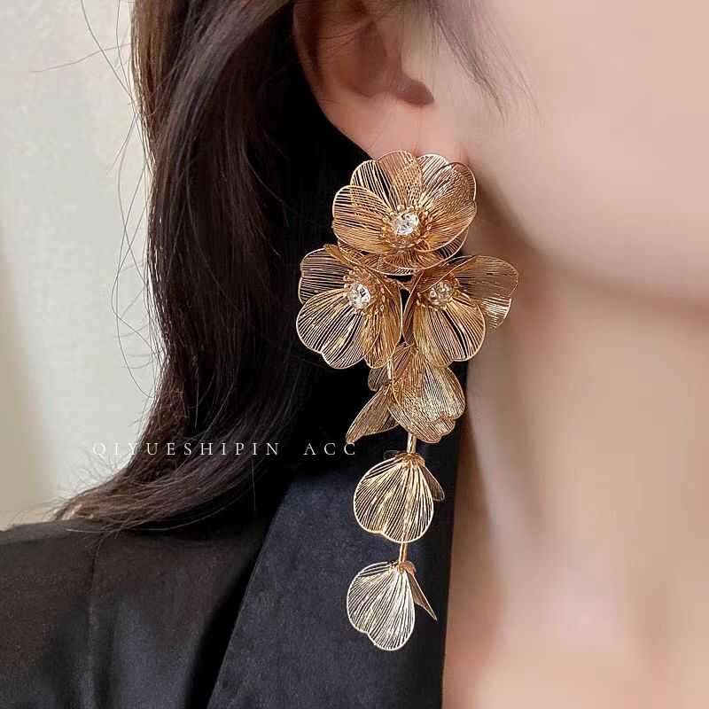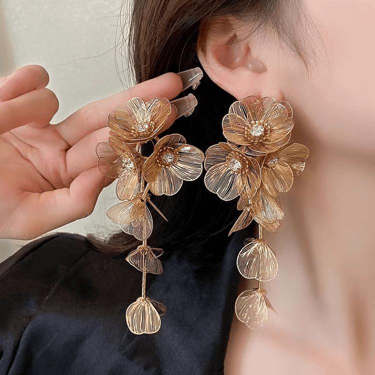 Pendientes dorados de flores grandes para mujer 2024, nuevos pendientes de alta gama exagerados con borlas largas y ligeras de lujo.