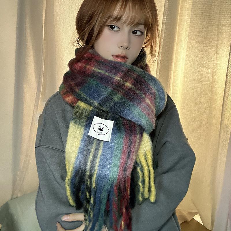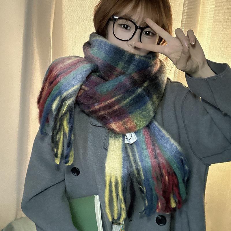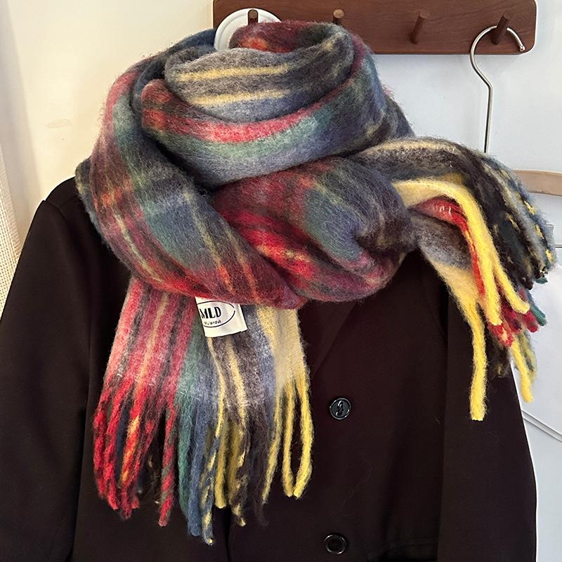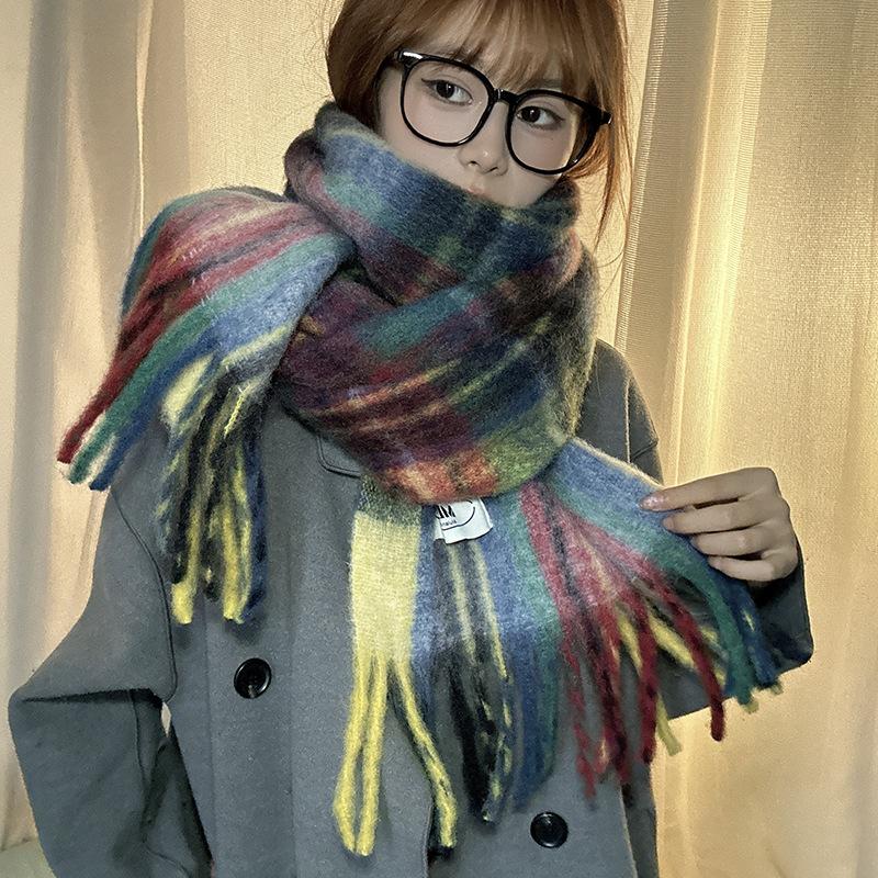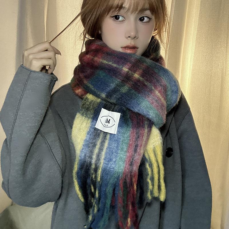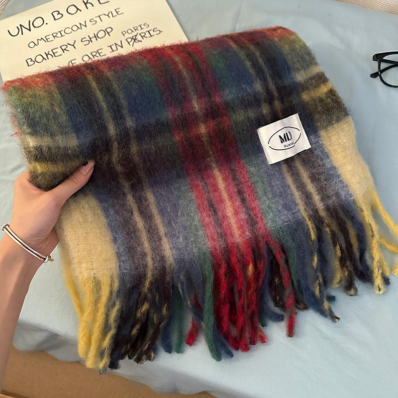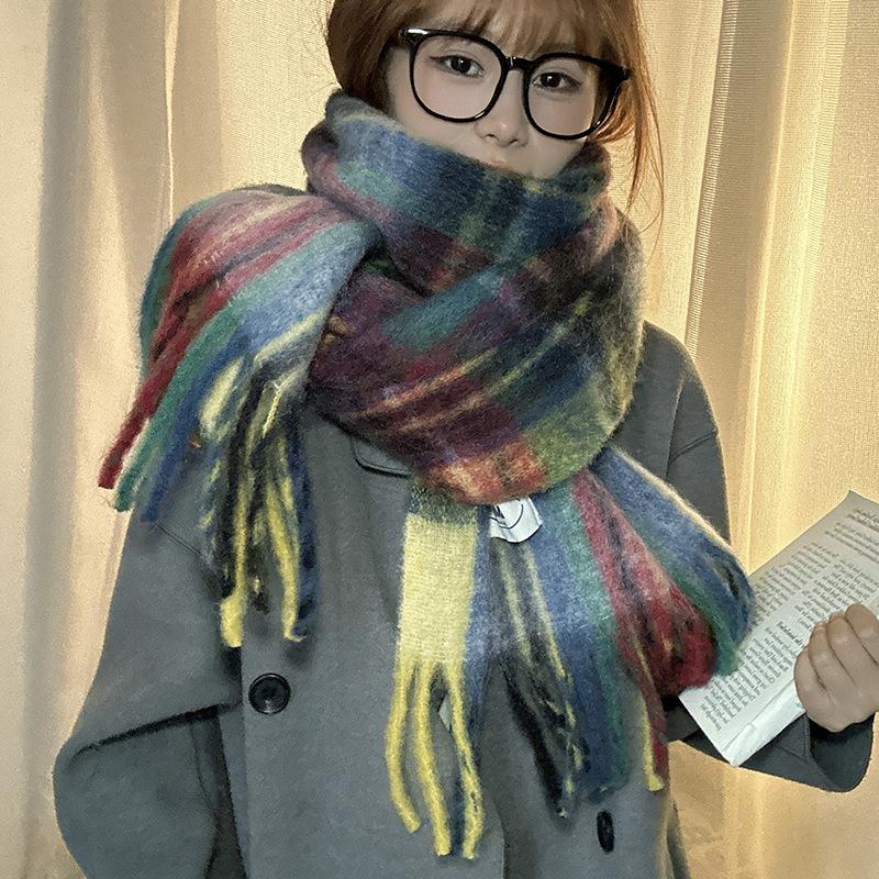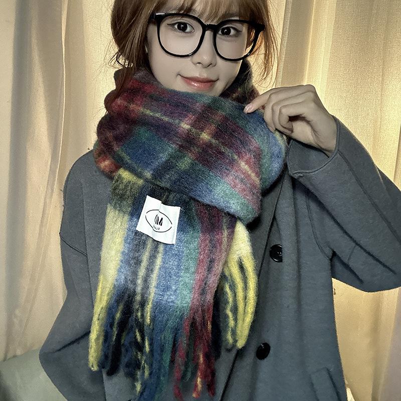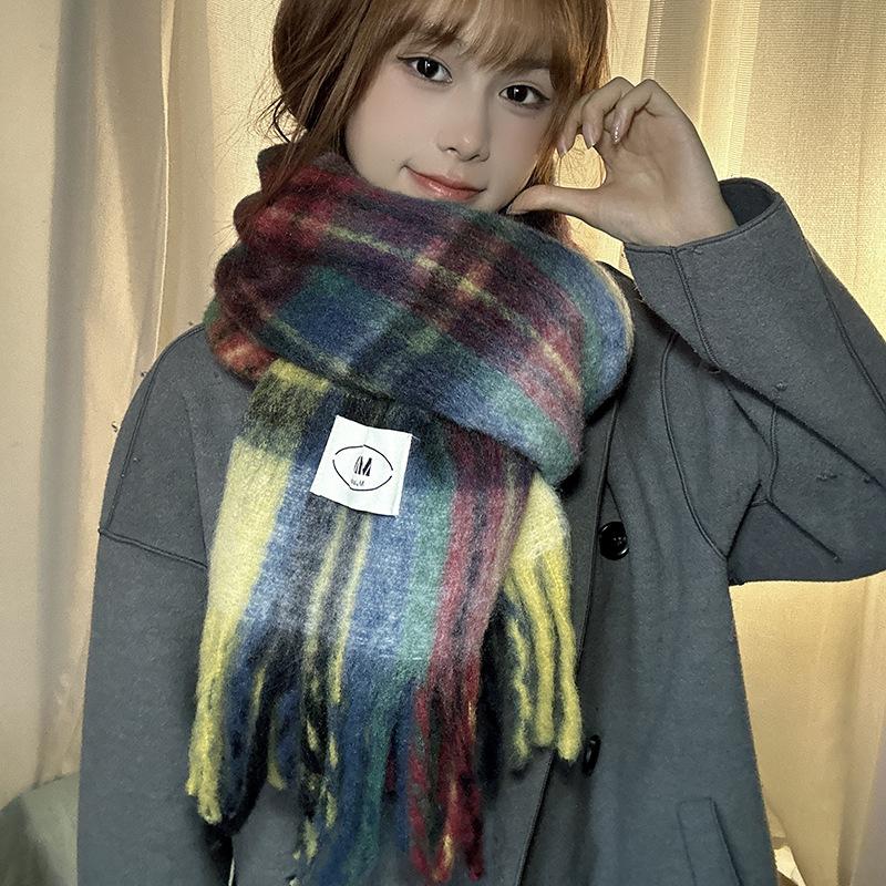 Compra Bufanda a cuadros de color contrastante Bufanda de mohair con borlas de color Ins Otoño e Invierno Cálida Gruesa Atmósfera Estudiante Combinación con todo al por mayor en Joom.pro