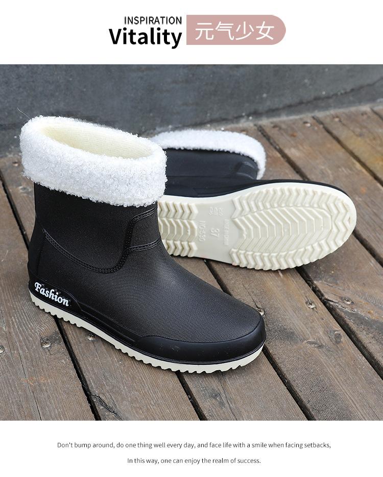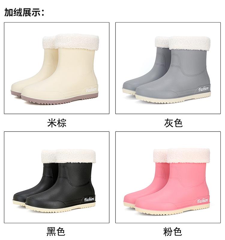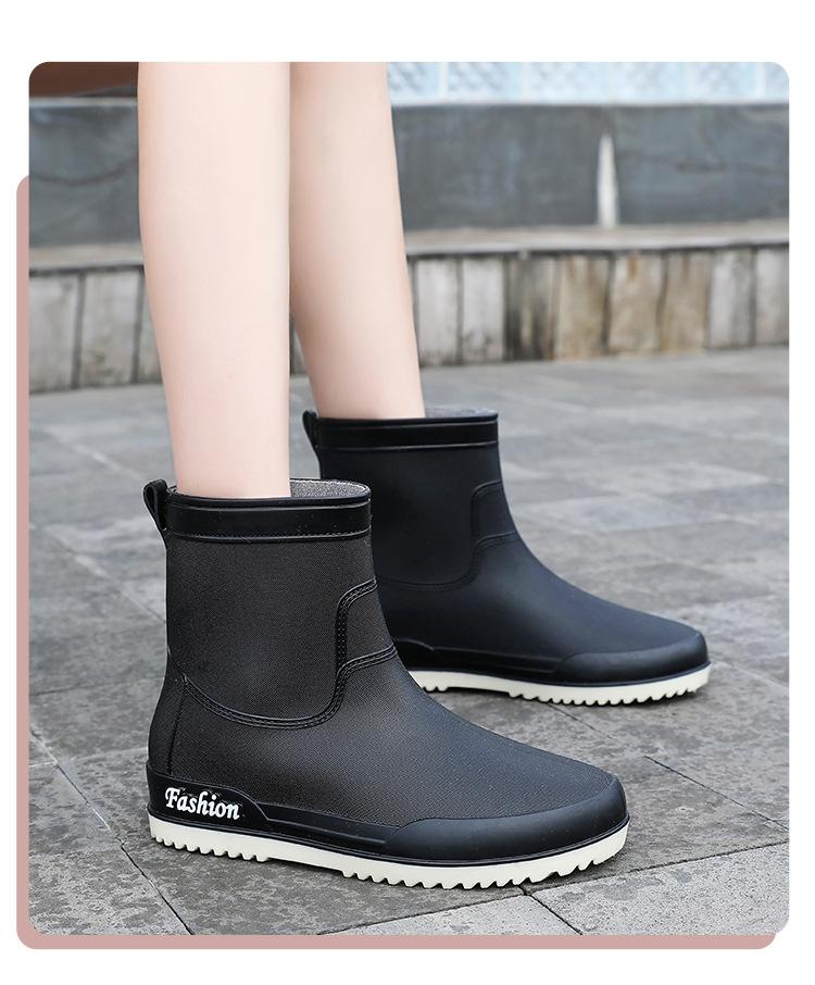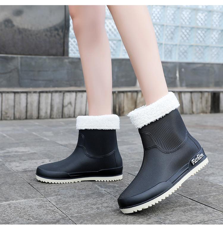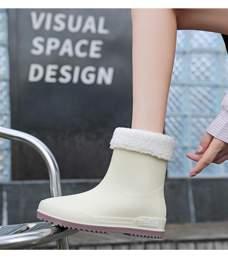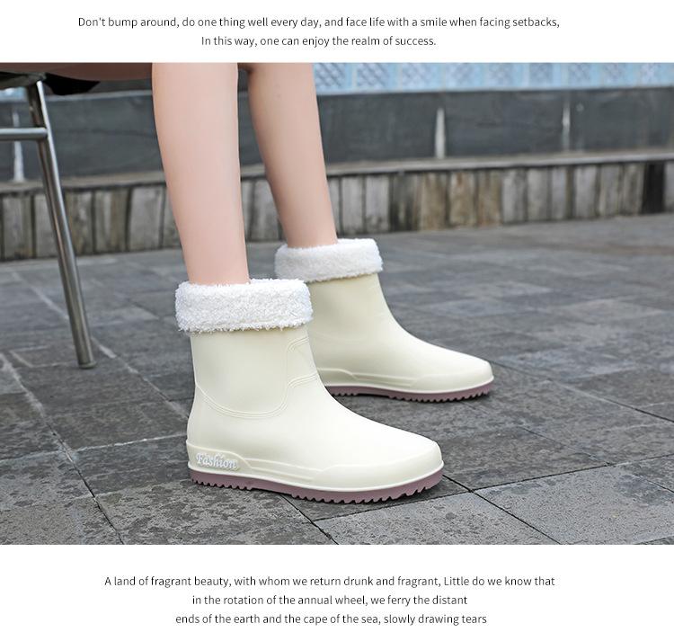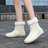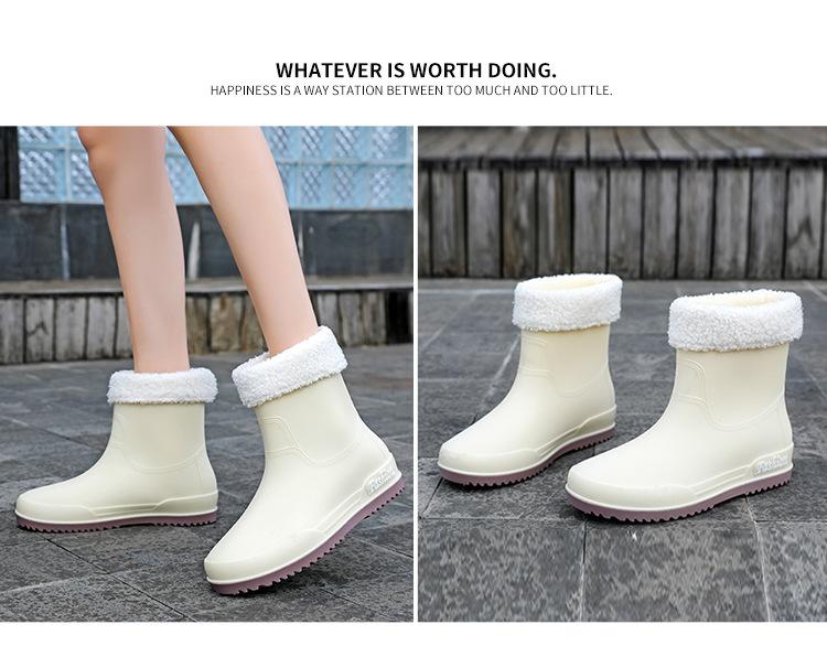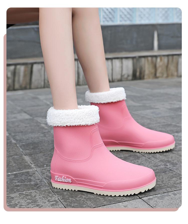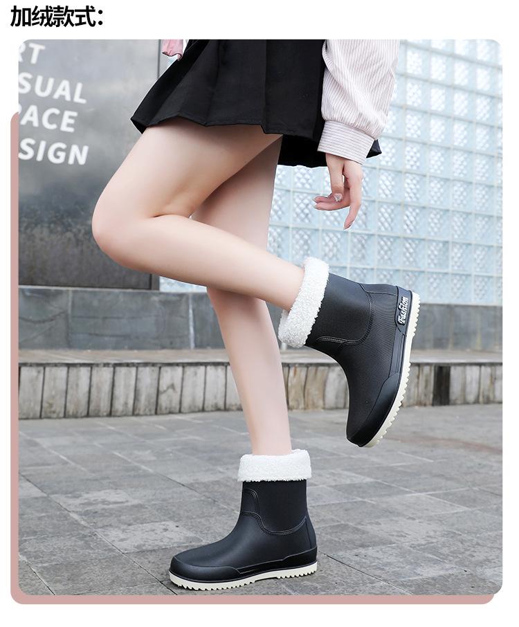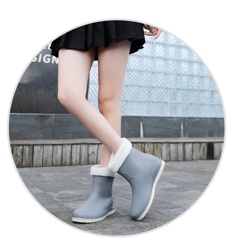 Botas de lluvia impermeables para mujer, moda para estudiantes, antideslizantes, de tubo corto, de goma, para exterior, cocina, forro polar, cálidas, botas de agua para mujer, venta al por mayor