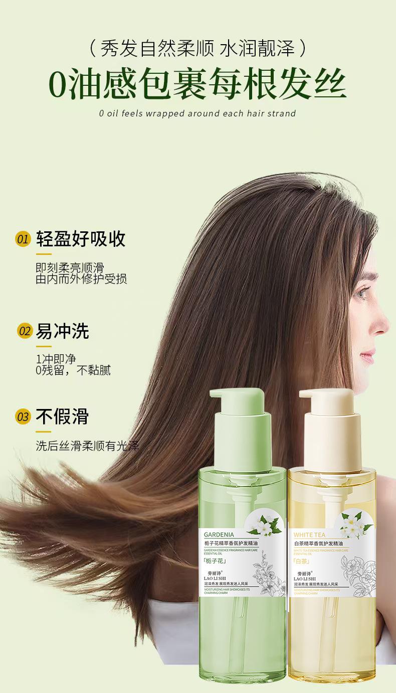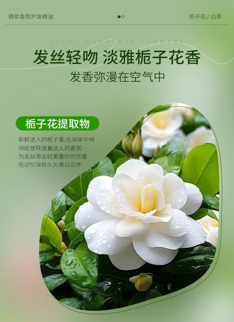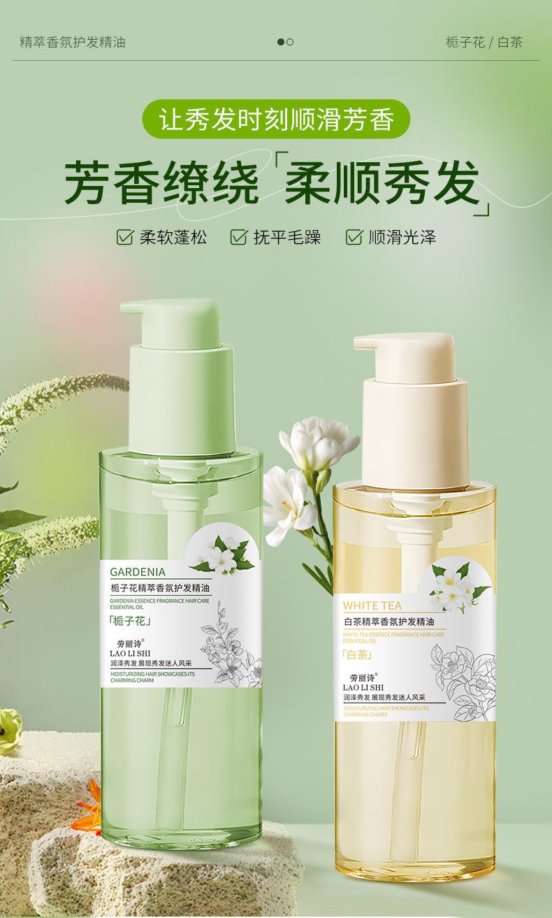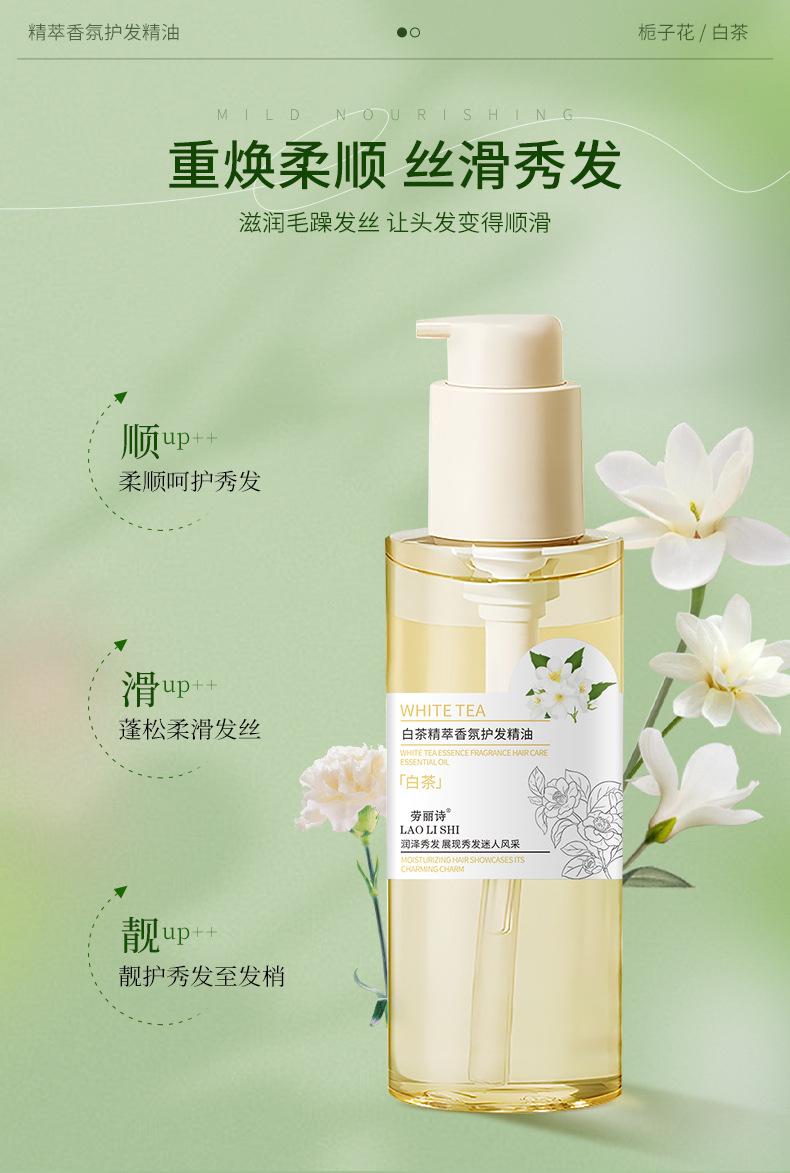 Aceite esencial para el cuidado del cabello con fragancia de extracto de gardenia de té blanco Laurie. Mejora la suavidad y la fragancia duradera del cabello rizado seco y fragante.