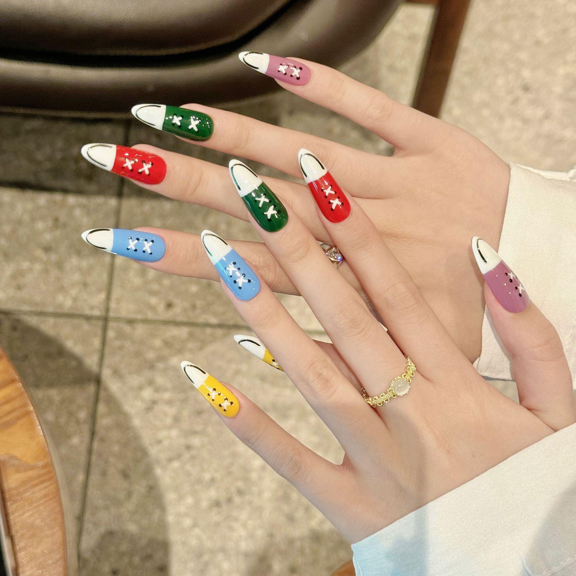 Zapatos de lona ultra largos de cinco colores con diseño de uñas europeo y americano de Yihe, uñas pintadas a mano, parches para uñas, productos terminados al por mayor