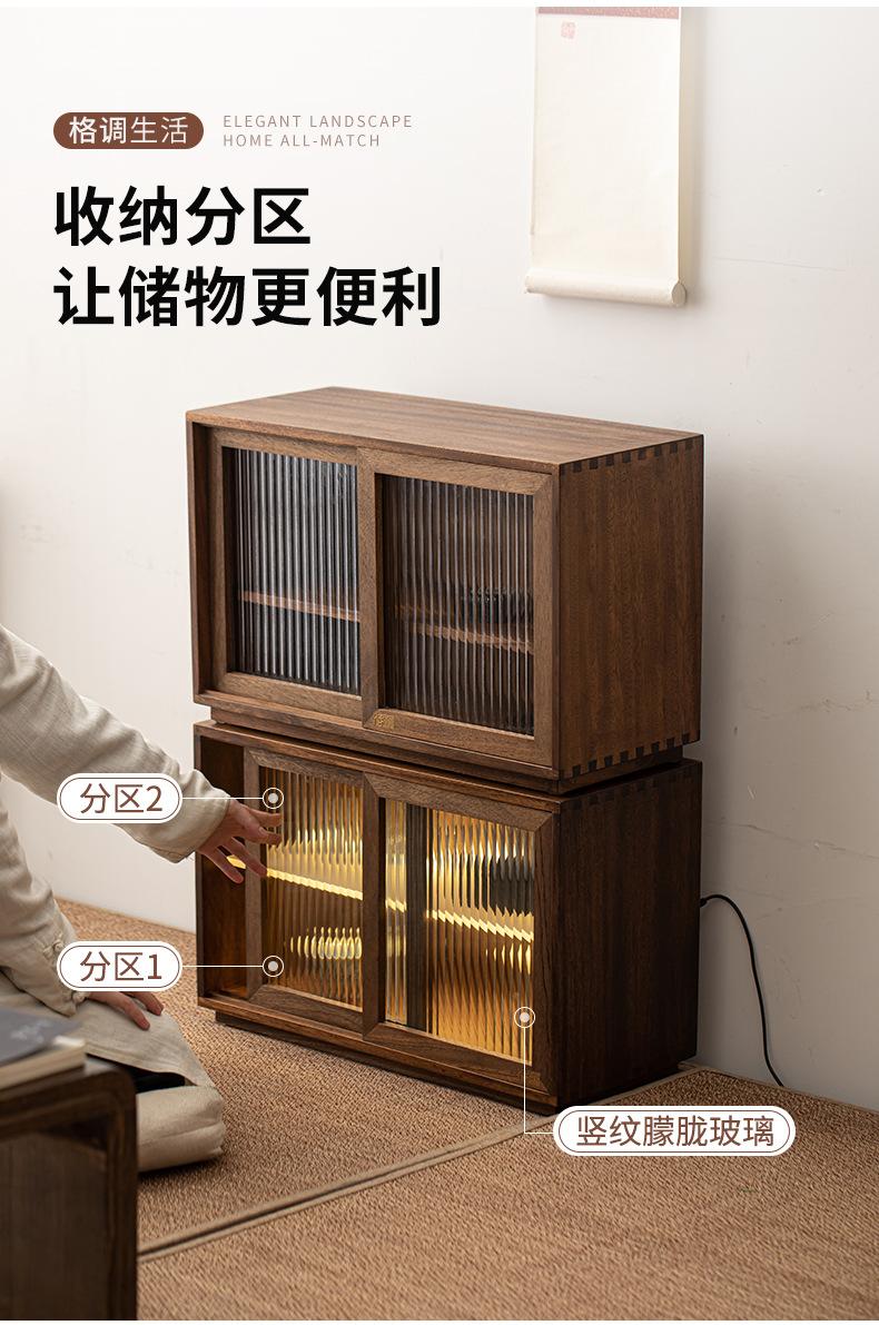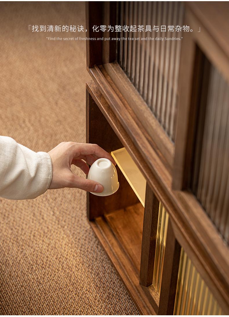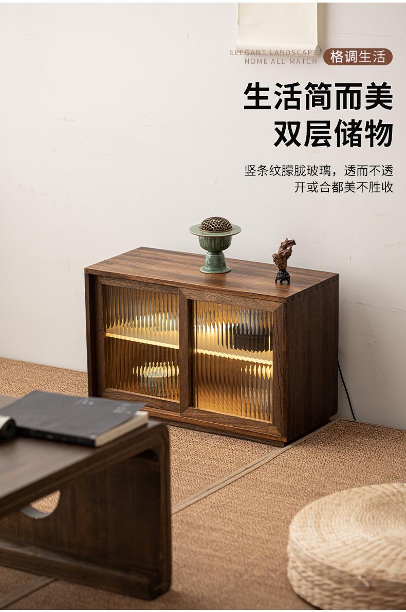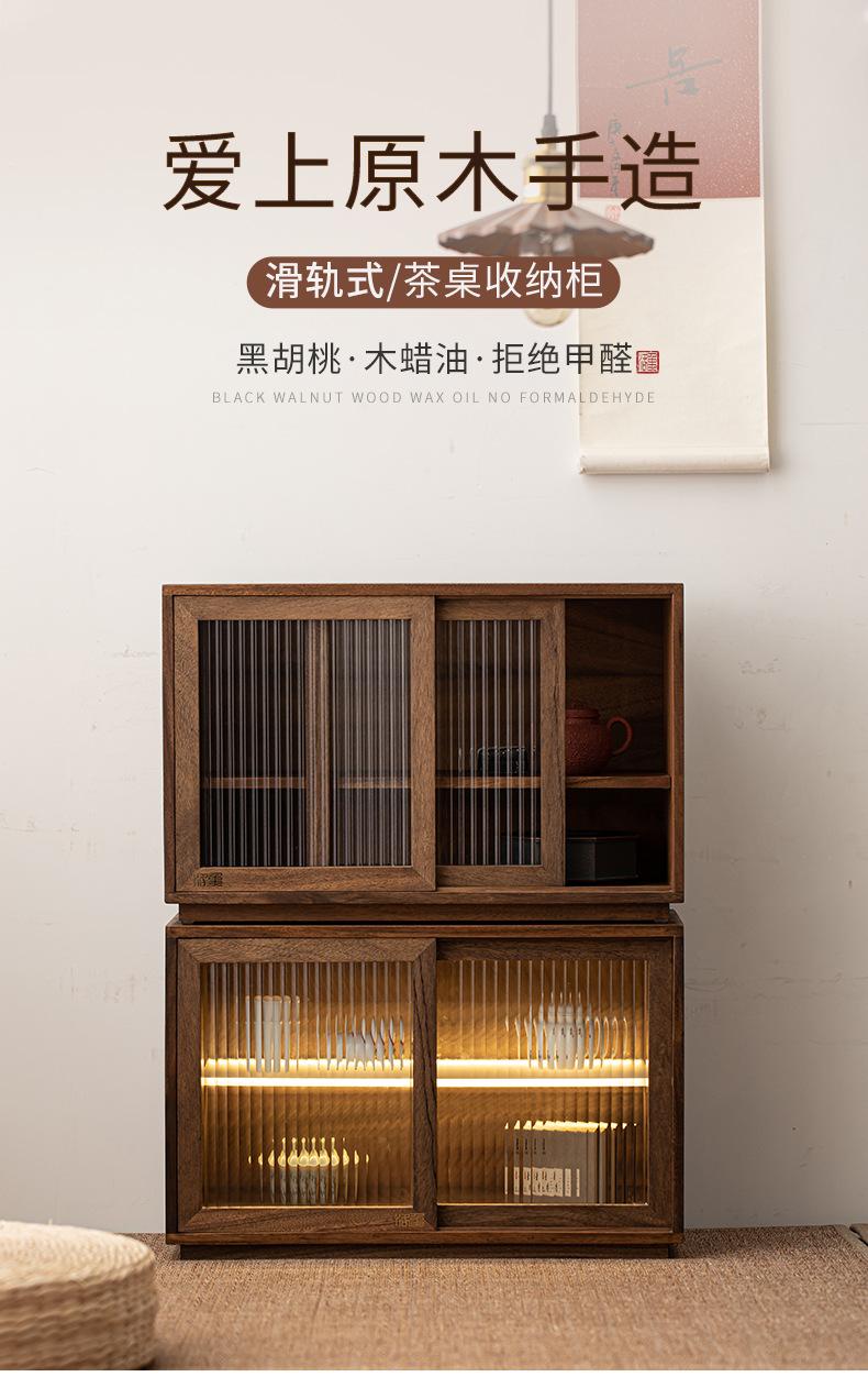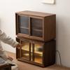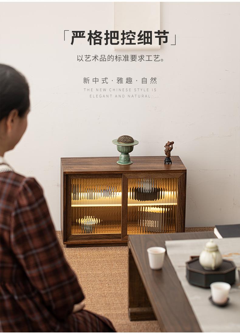 Gabinete de almacenamiento de escritorio de nogal con lámpara de inducción y puerta corrediza a prueba de polvo. Nuevo gabinete de almacenamiento de estilo chino, juego de té, estante para guardar tazas.