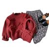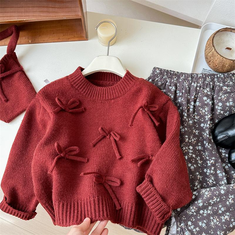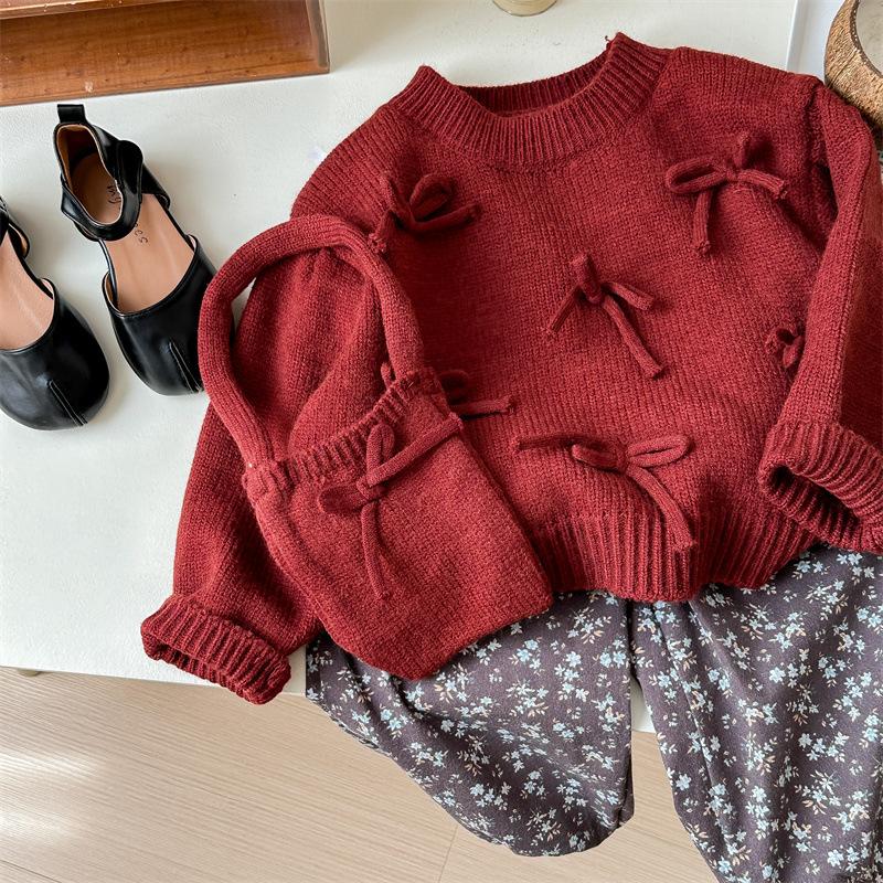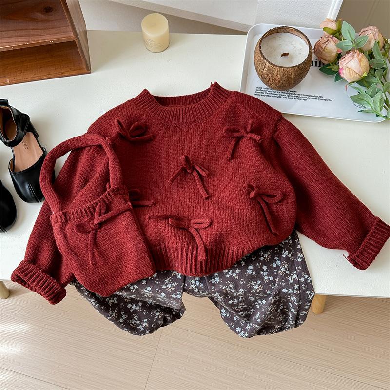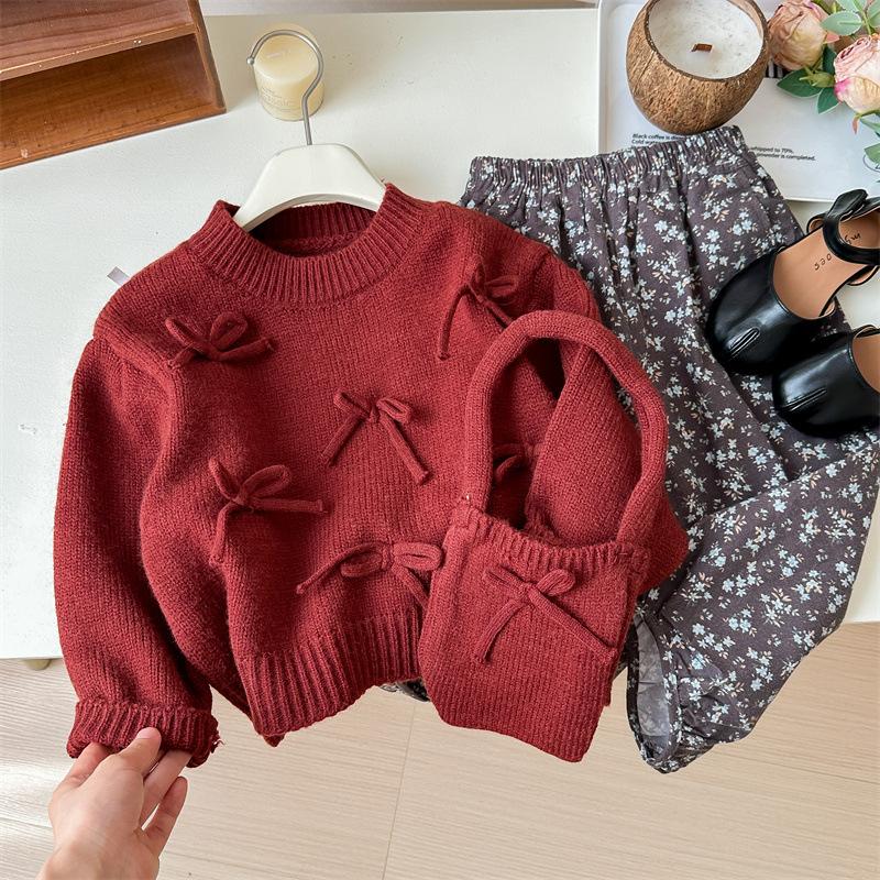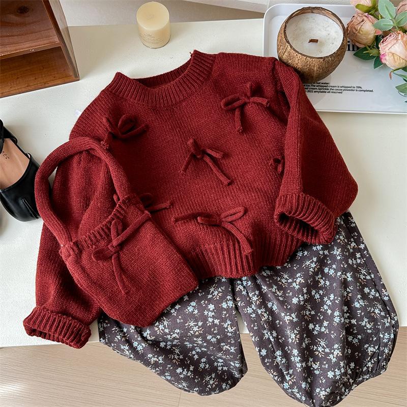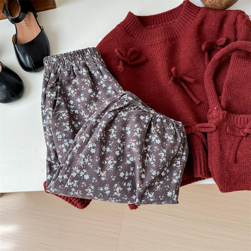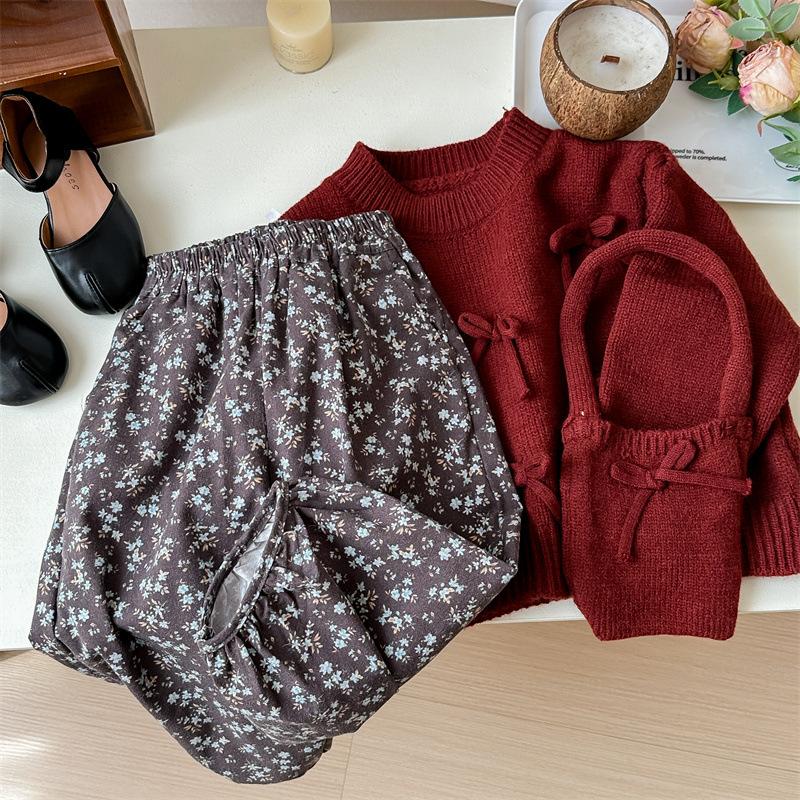 Tong Xingyuan Otoño Nuevo Estilo Coreano Lindo Suéter con Lazo Rojo Abrigo Niñas Camisa de Punto Pantalones Florales Conjunto
