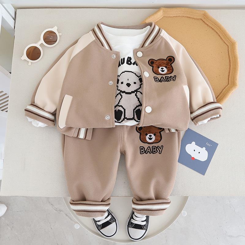 Long Sleeve Bear Baseball Suit Three-Piece khaki