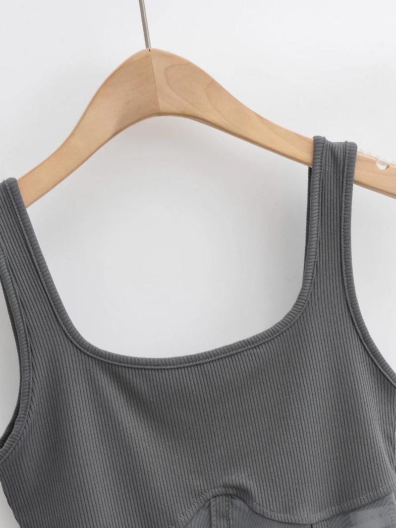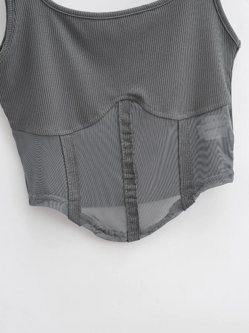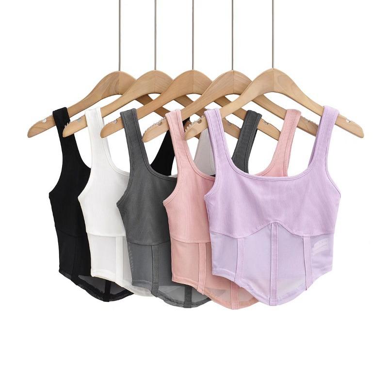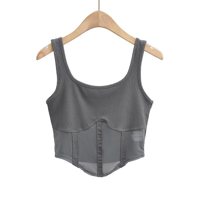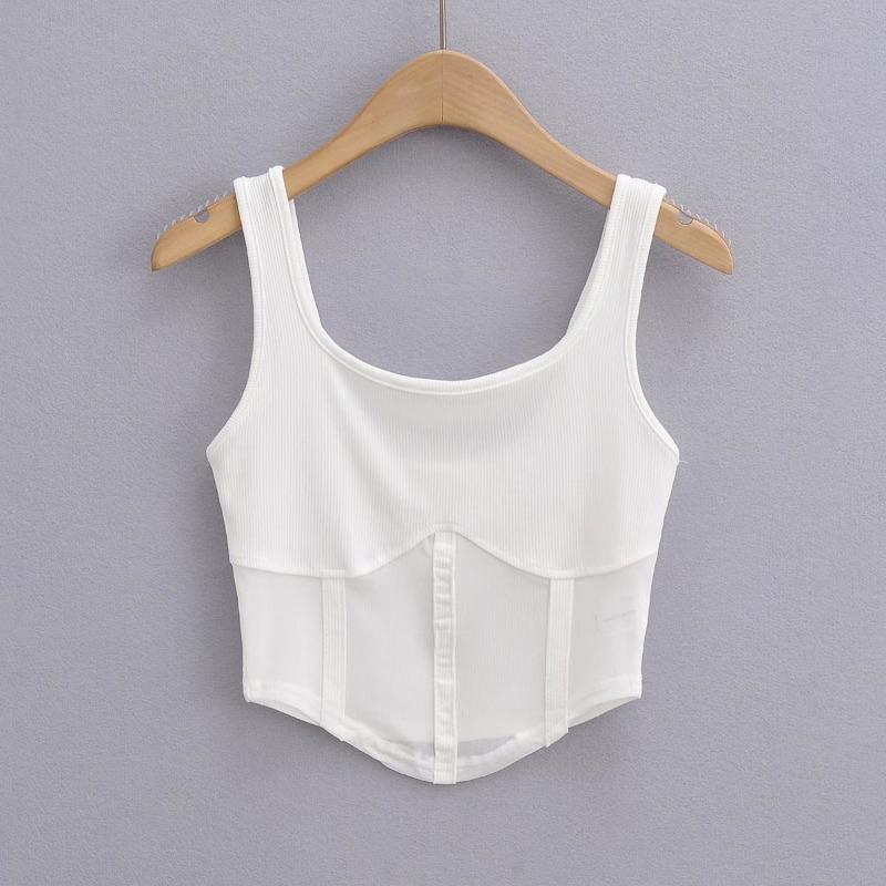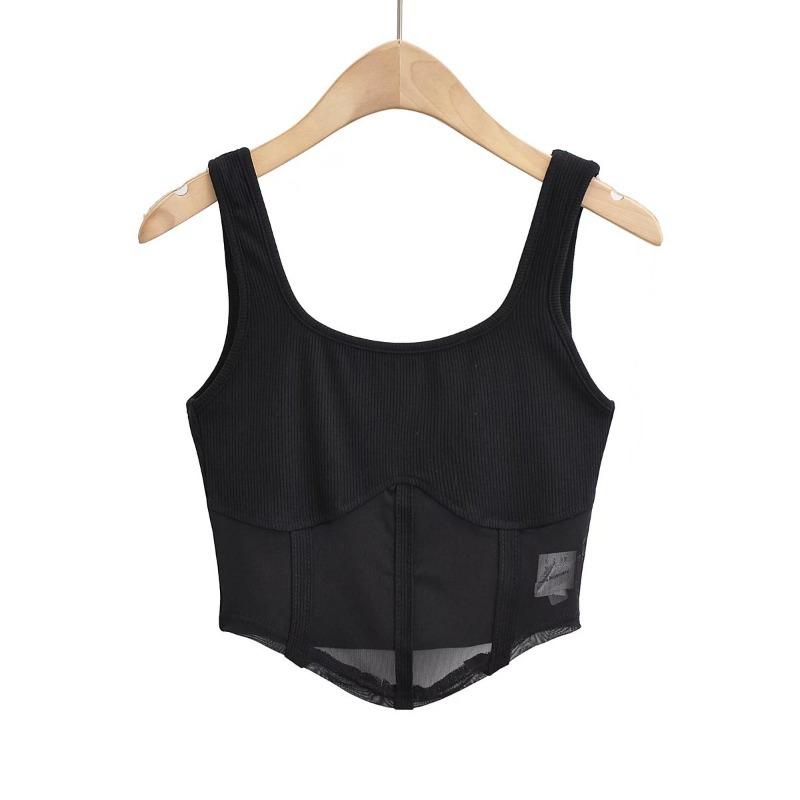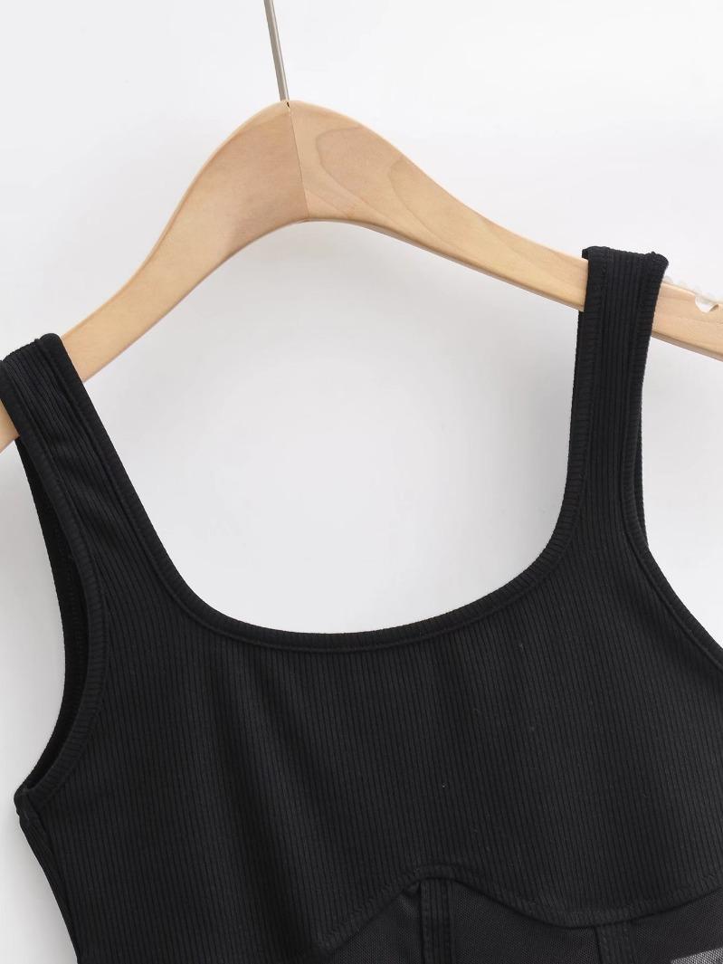 Estilo europeo y americano para mujer, chaleco de malla con costuras de espiguilla, nuevo top corto curvo de tirantes con cuello cuadrado grande y color sólido