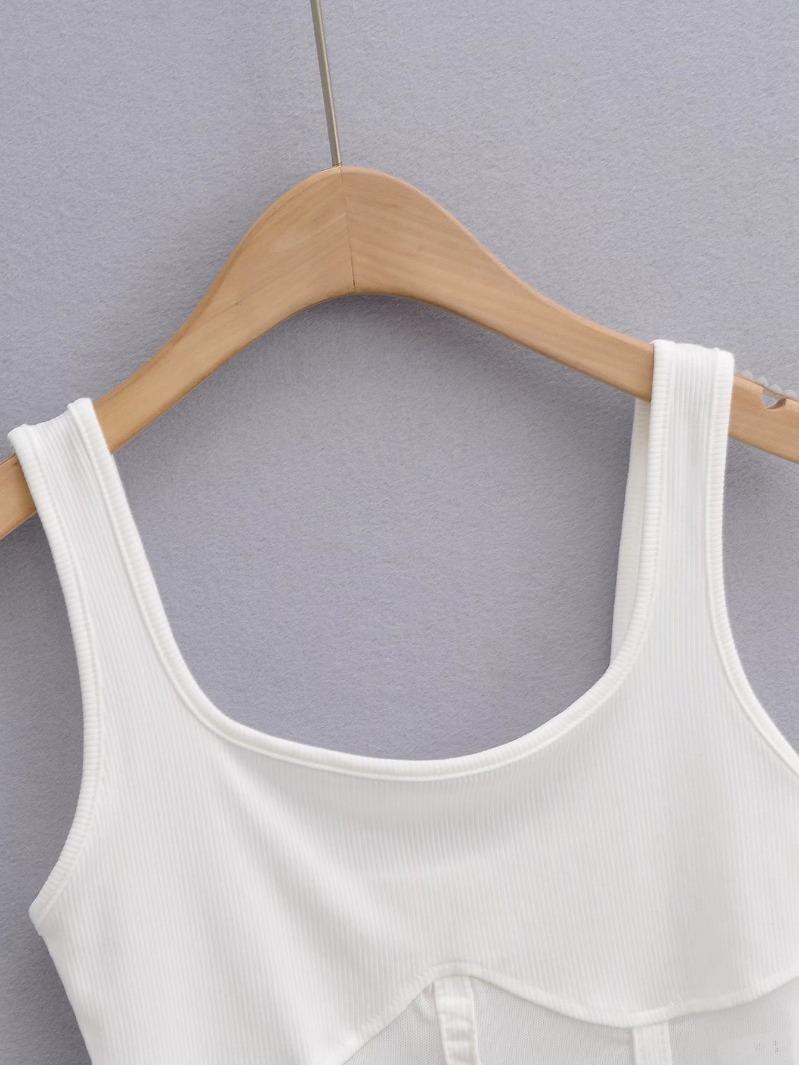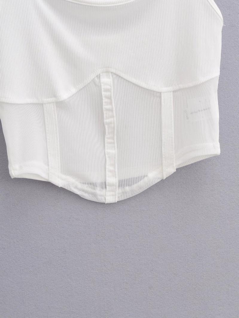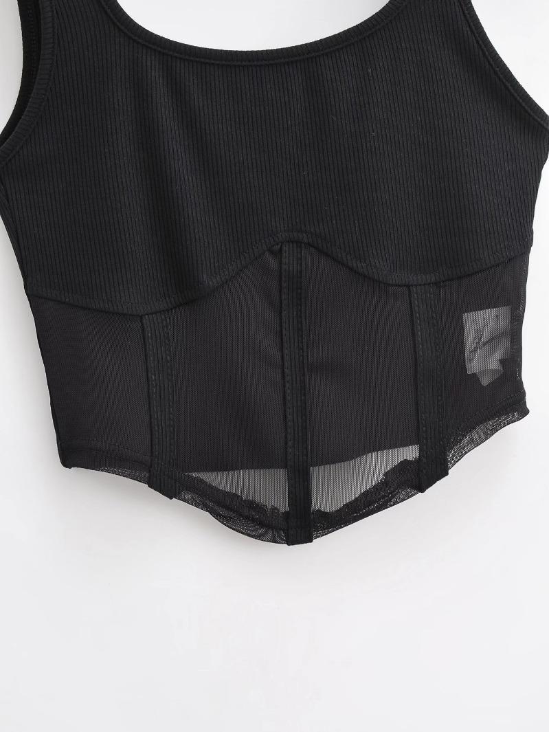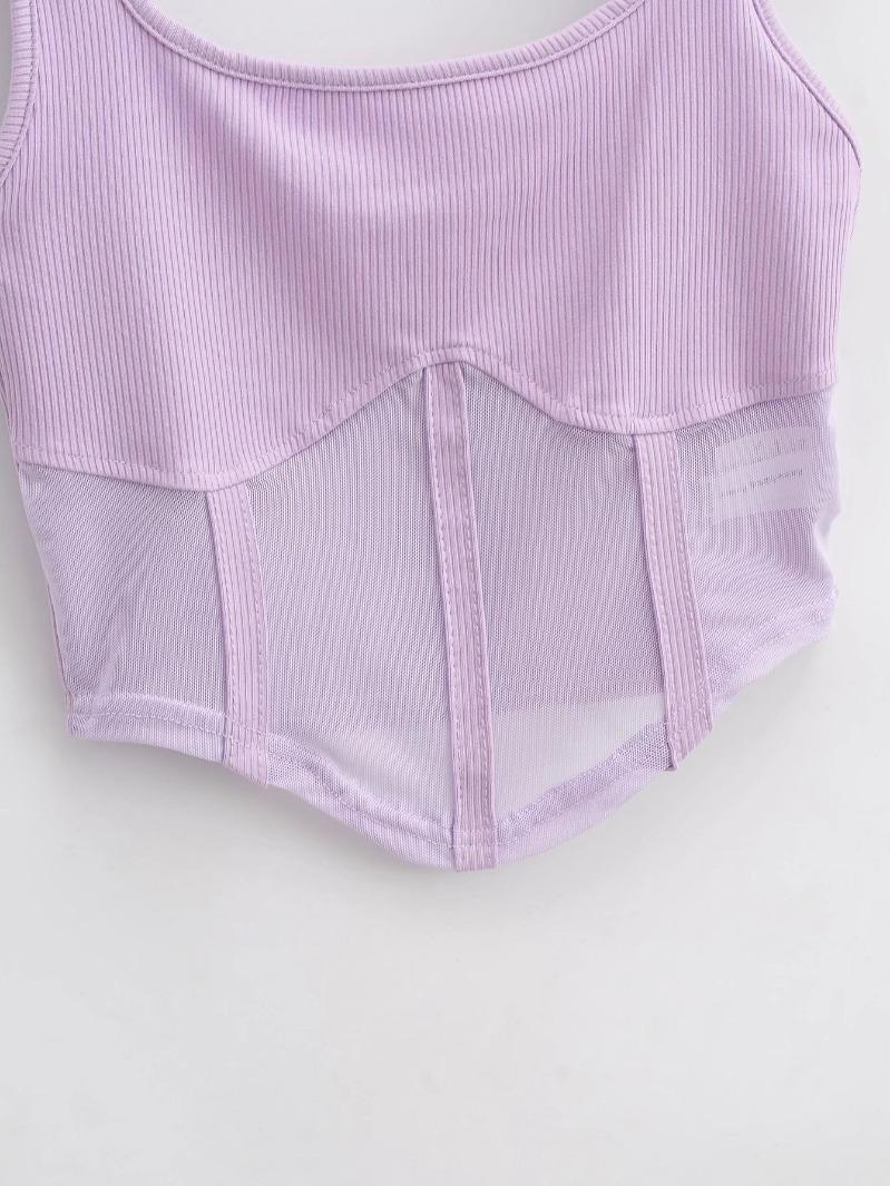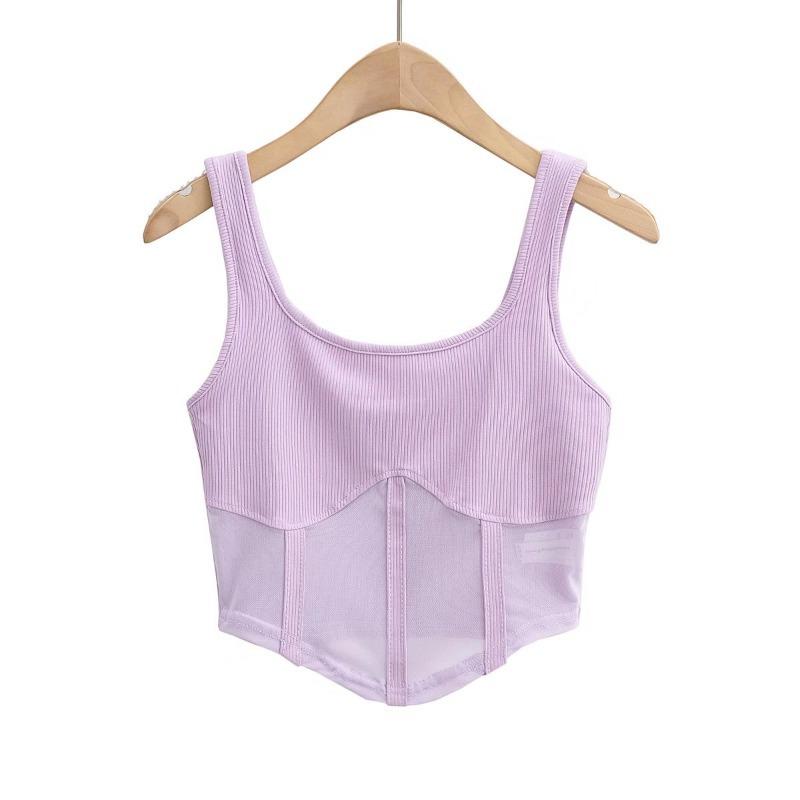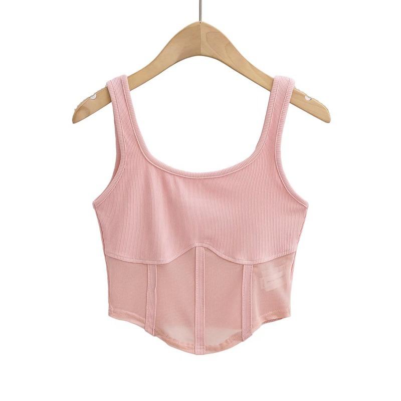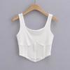 Estilo europeo y americano para mujer, chaleco de malla con costuras de espiguilla, nuevo top corto curvo de tirantes con cuello cuadrado grande y color sólido