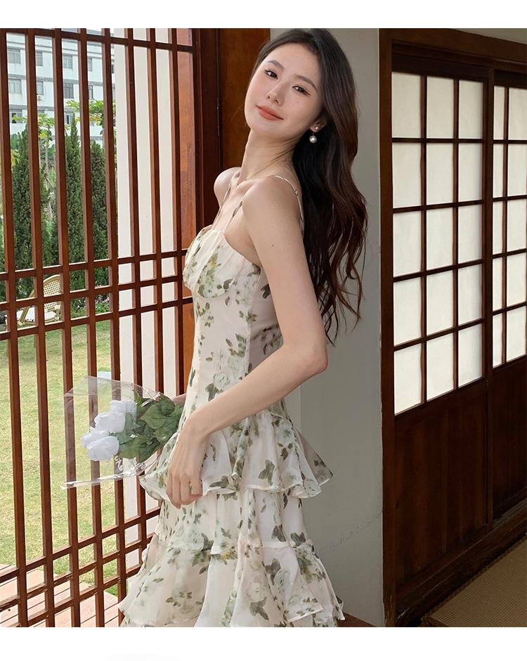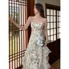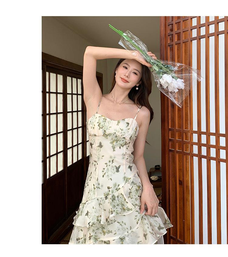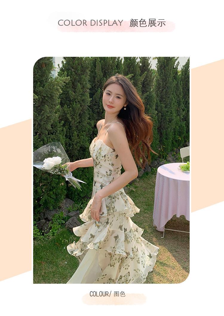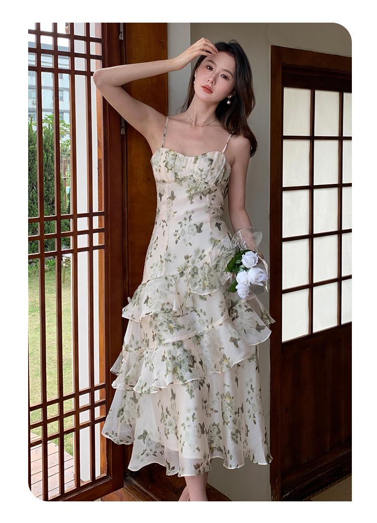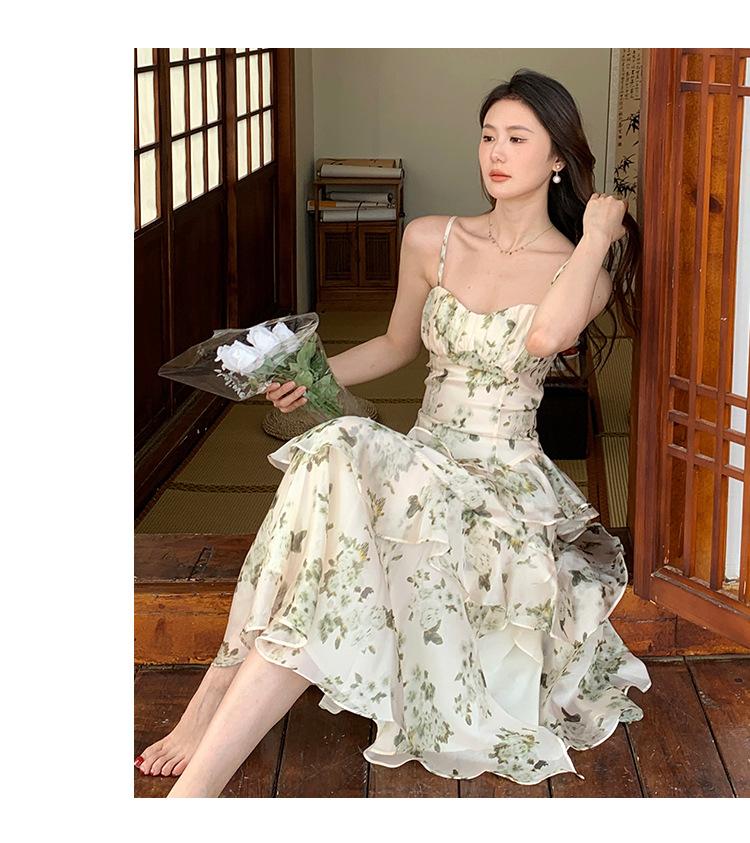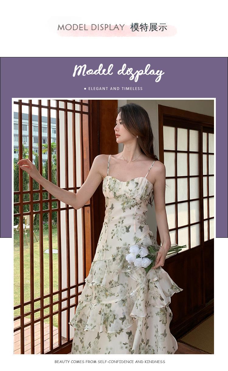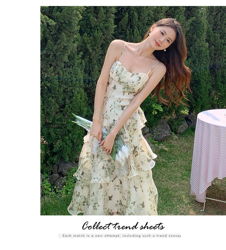 Vestido largo playero de verano 2023 con estampado floral de cintura alta y tirantes finos estilo pastel francés.