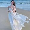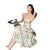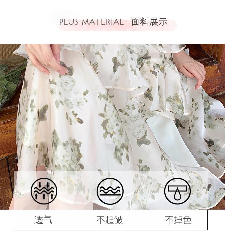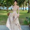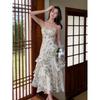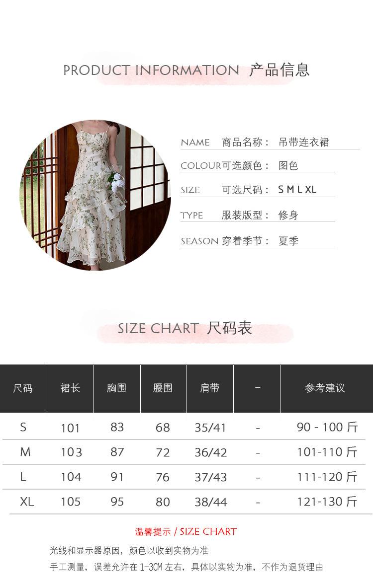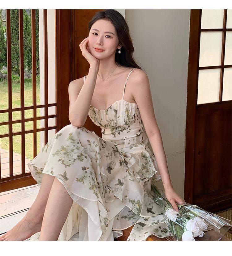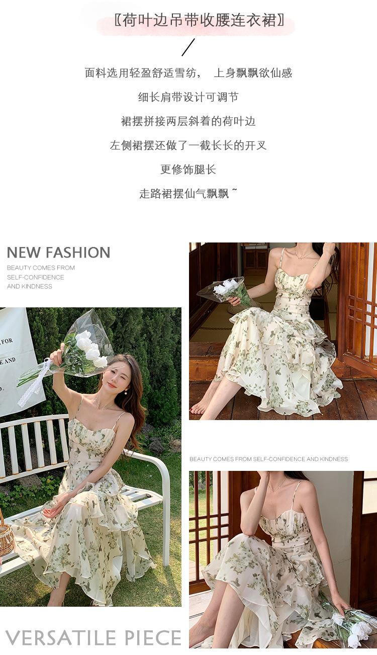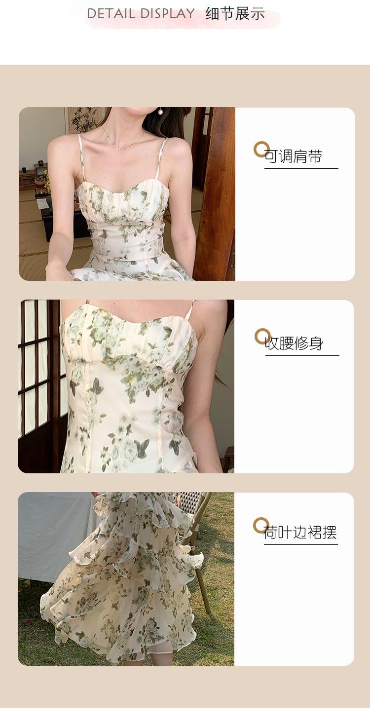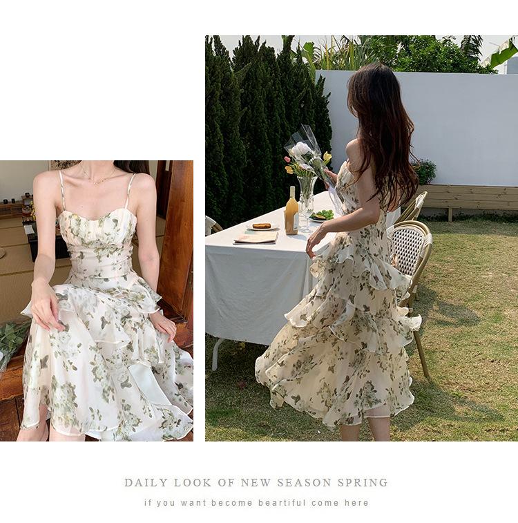Vestido largo playero de verano 2023 con estampado floral de cintura alta y tirantes finos estilo pastel francés.