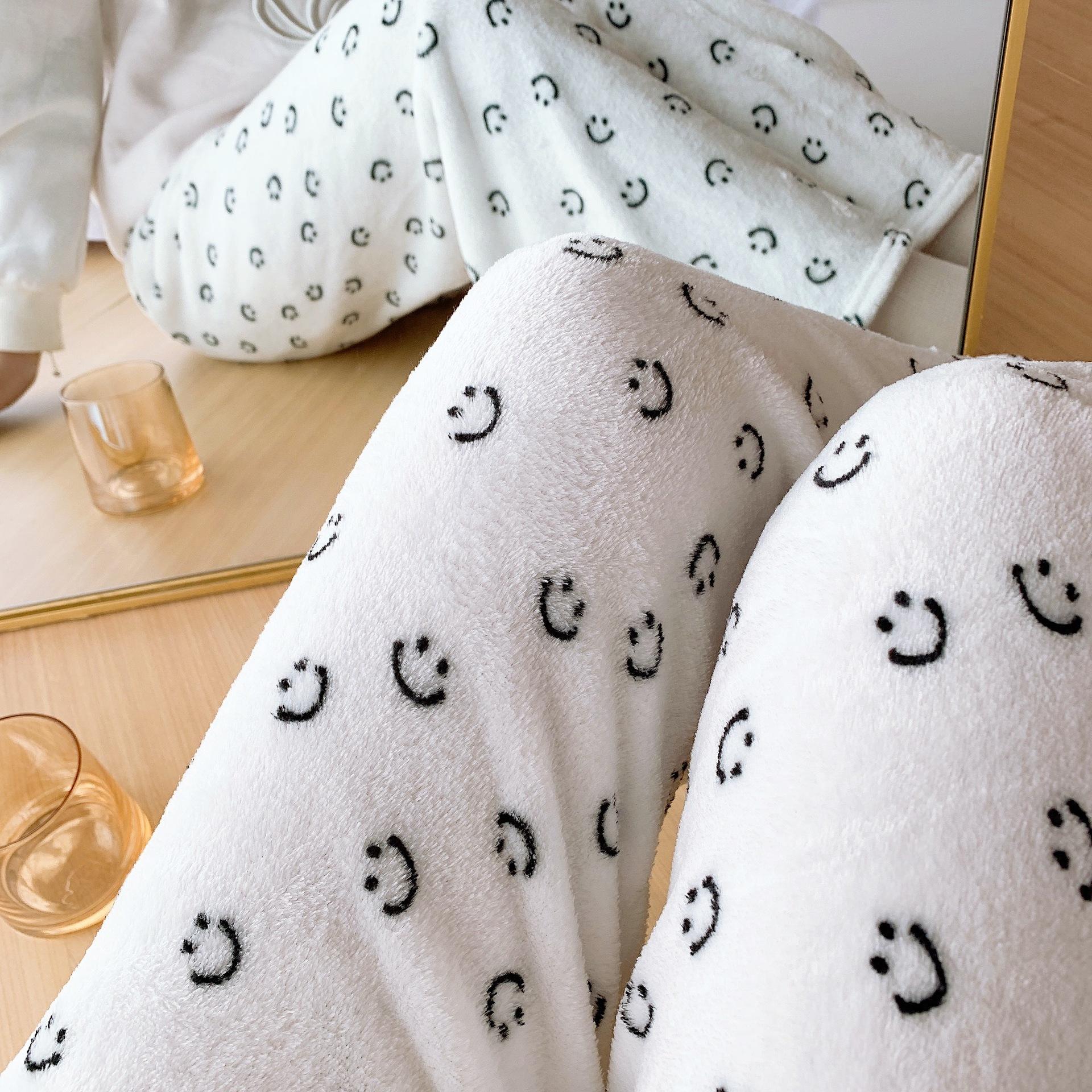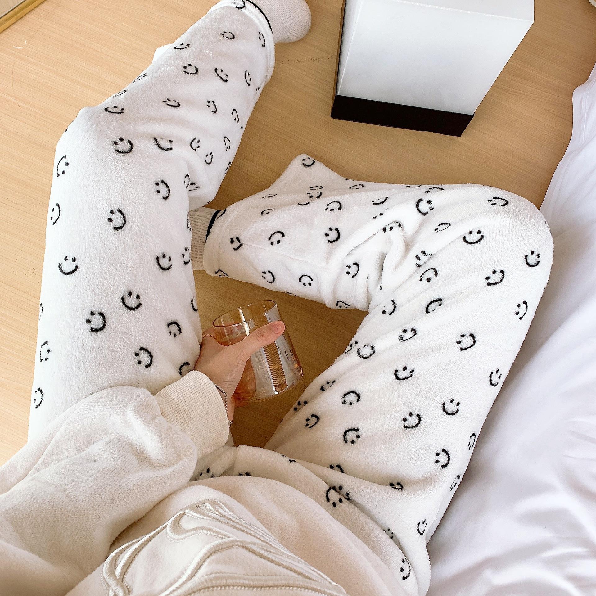 Pantalones de pijama de franela blanca con cara sonriente para mujer otoño e invierno Nuevo forro polar coral grueso cálido casual para el hogar