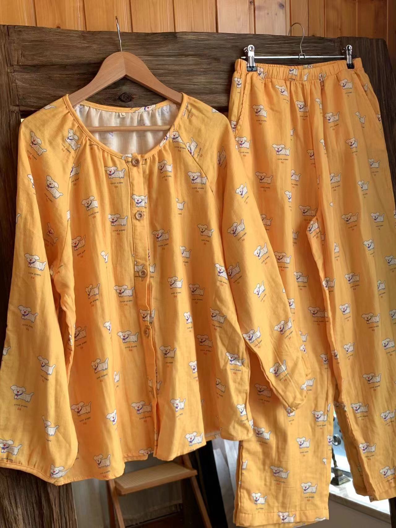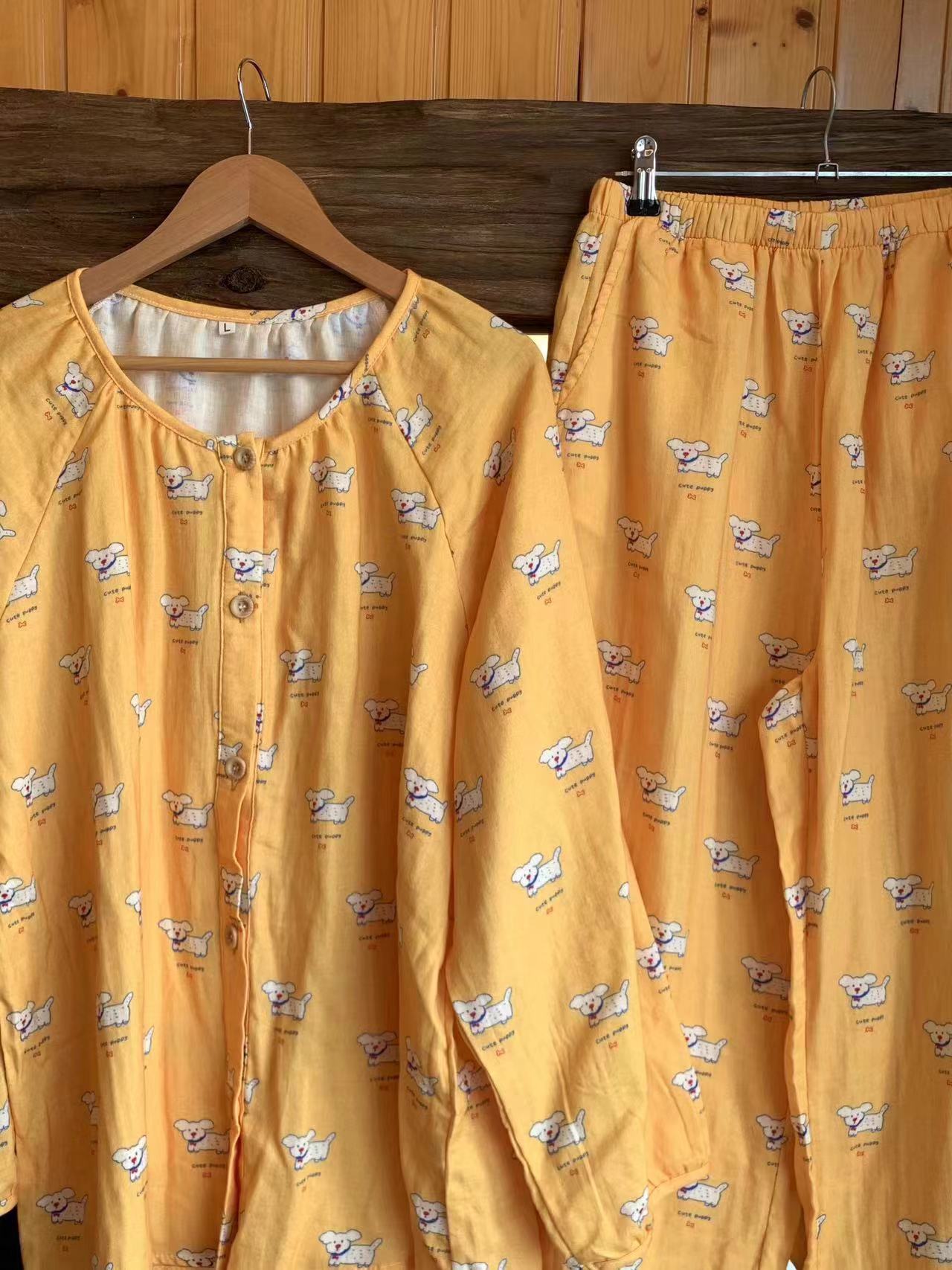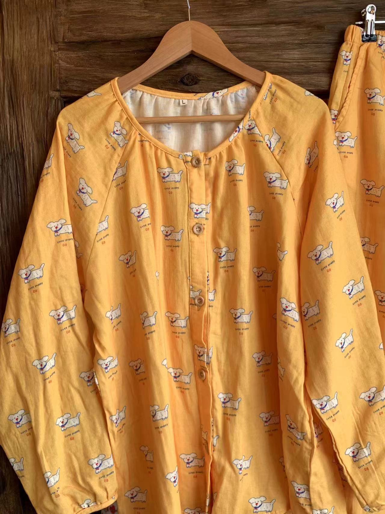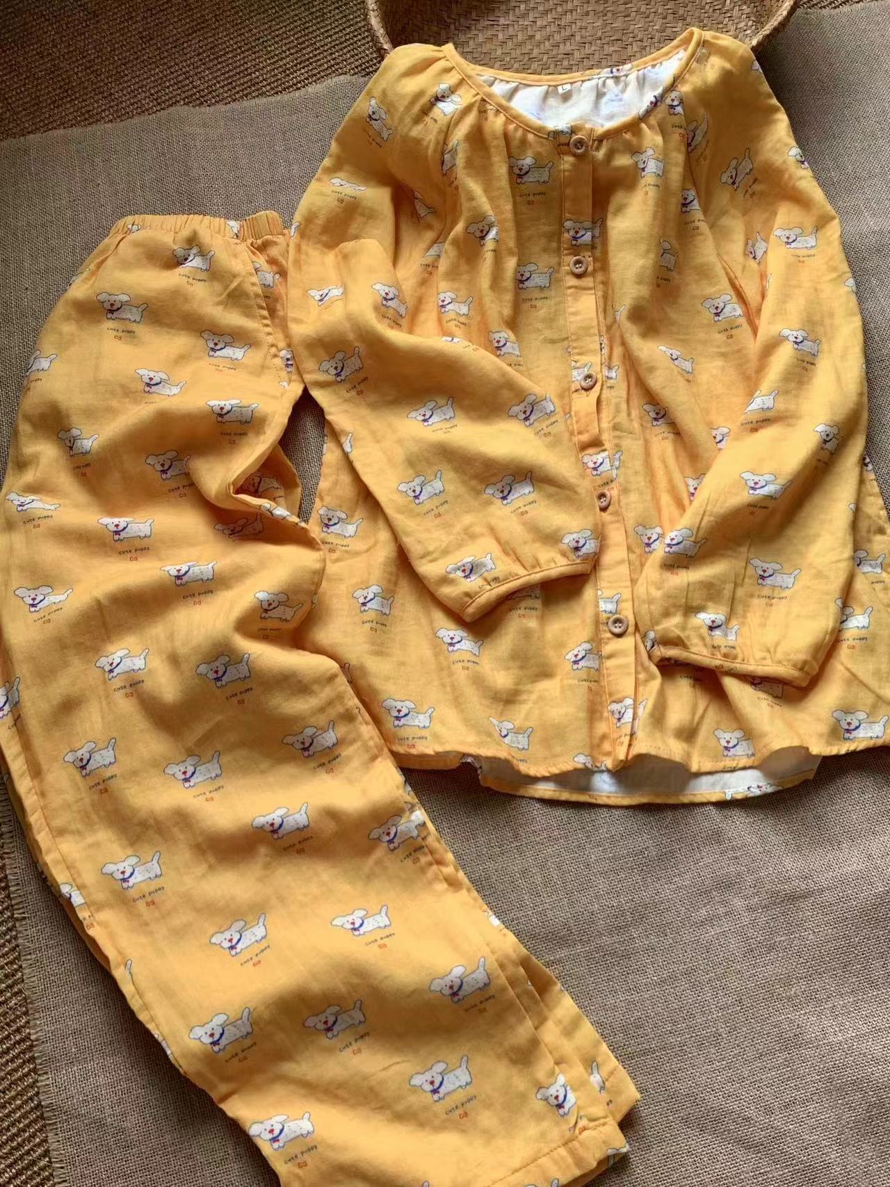 Yellow puppy-double-layer gauze round neck long sleeves trousers M