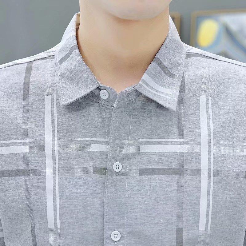 Camisa de manga corta de seda helada de verano para hombre, marca de moda, elegante camisa de hombre, estilo coreano, corte entallado, camisa de manga tres cuartos