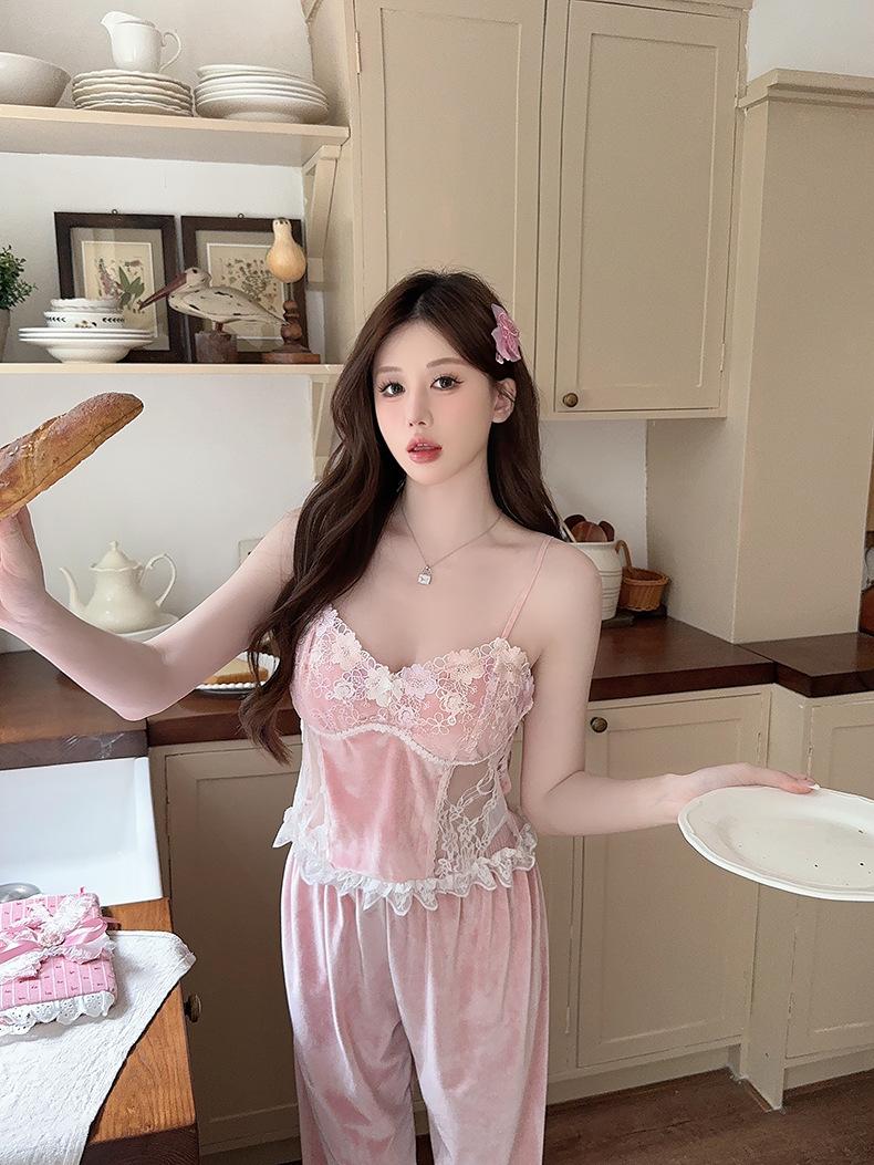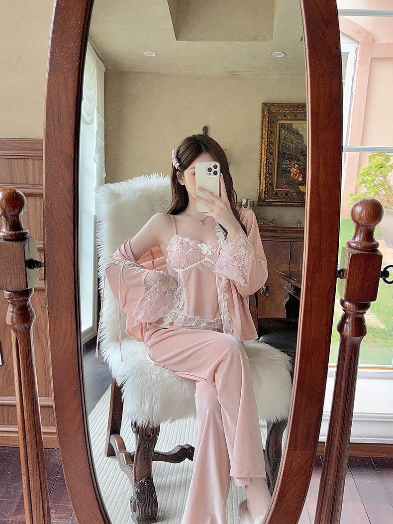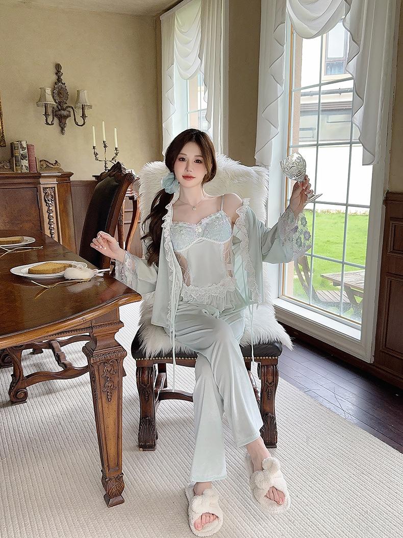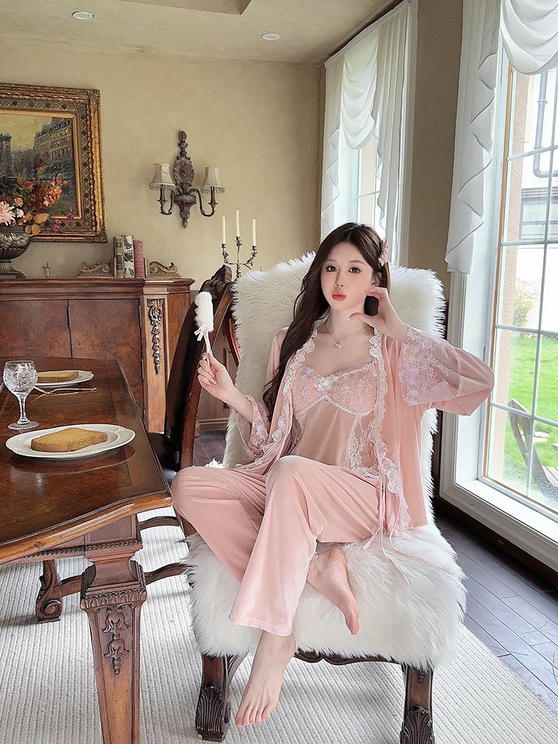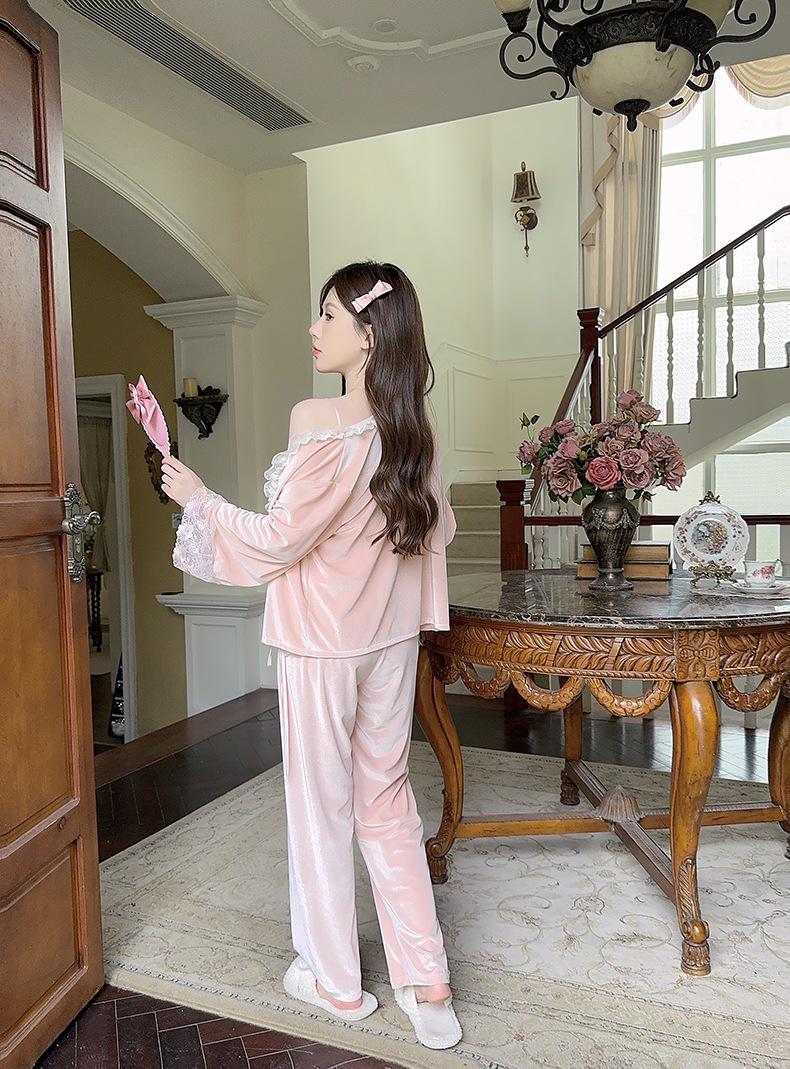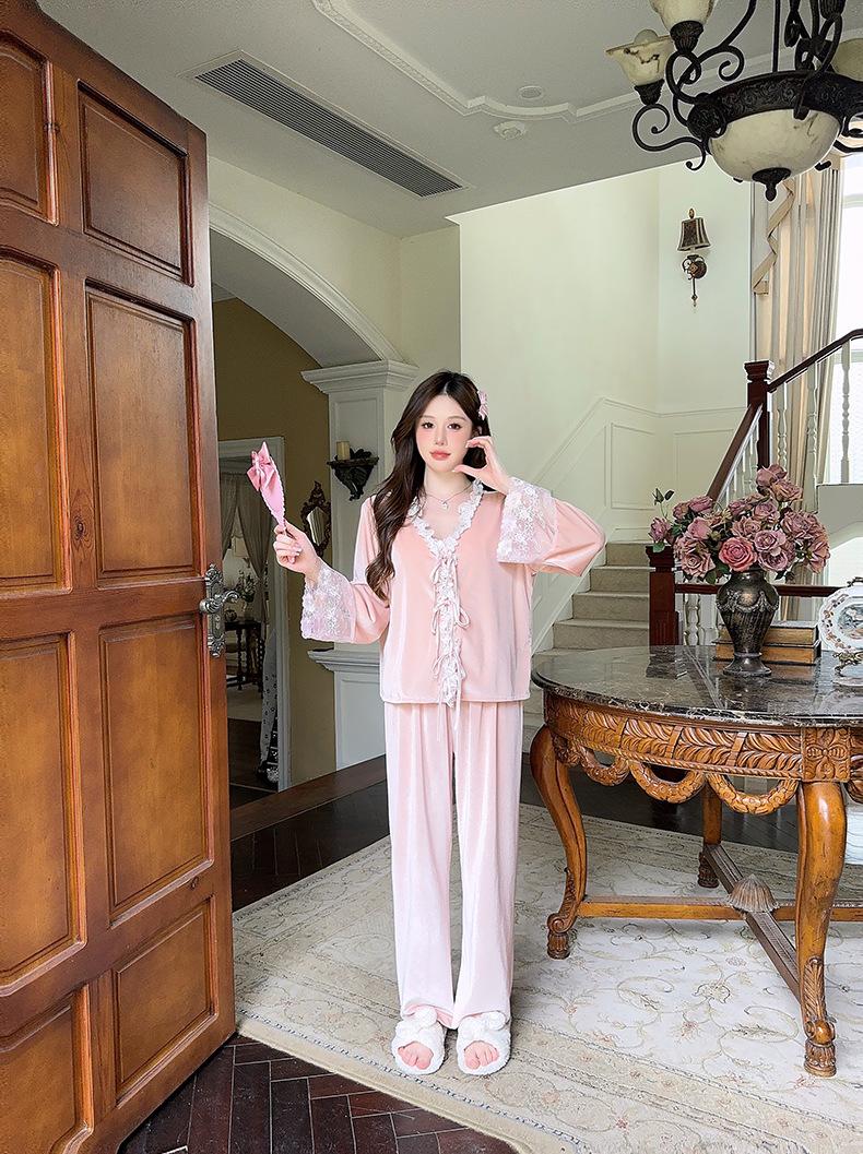 Pijama de Terciopelo para Mujer, Otoño e Invierno, Conjunto de Pantalón Largo de Manga Larga con Solapa, Pijama de Encaje Estilo Palacio que se puede usar afuera