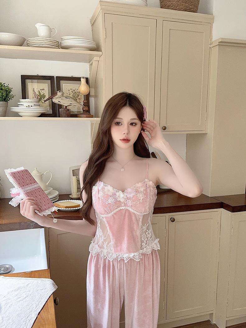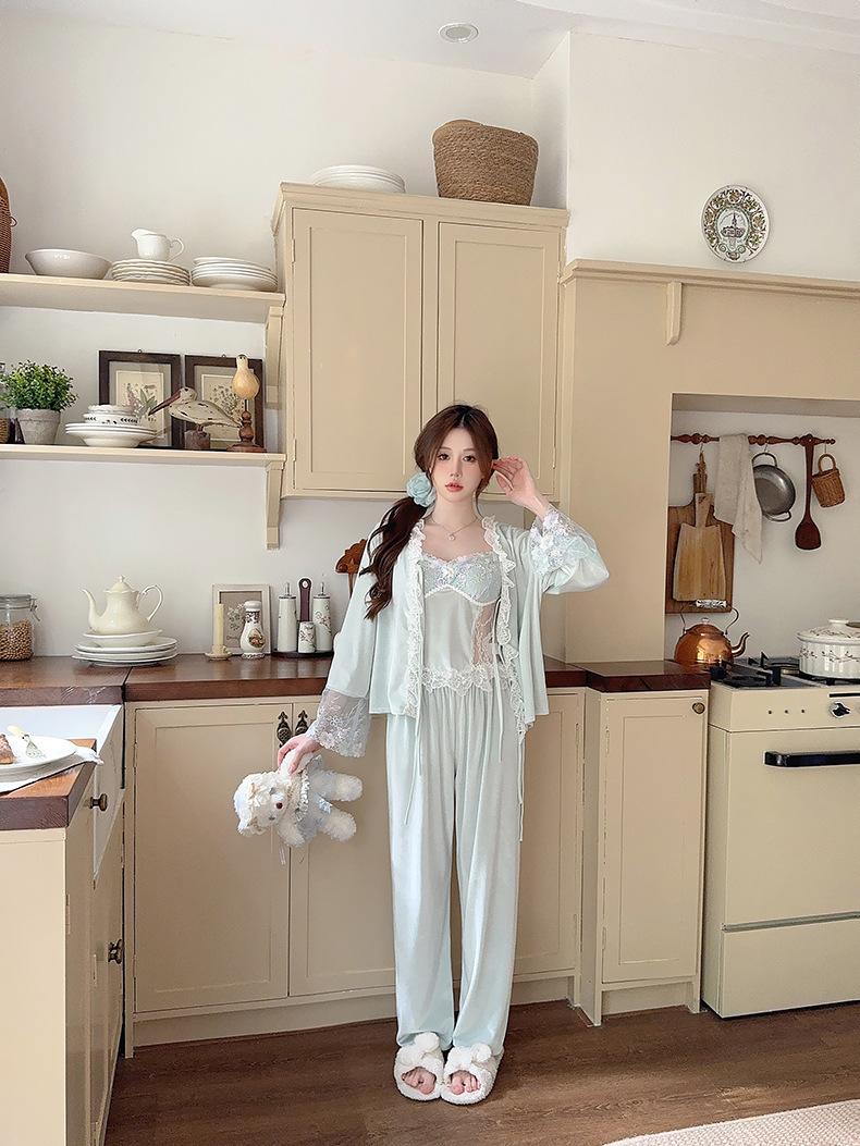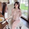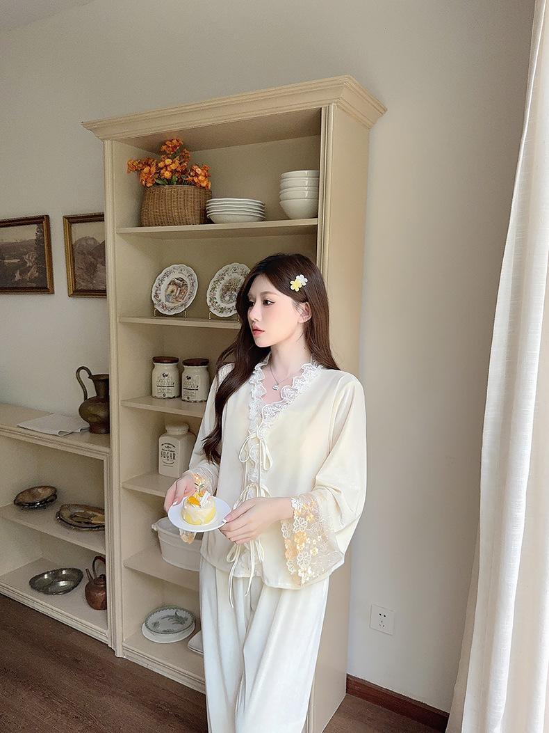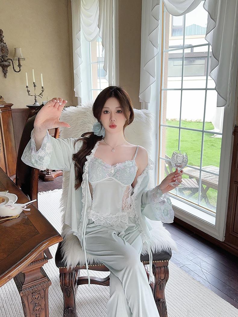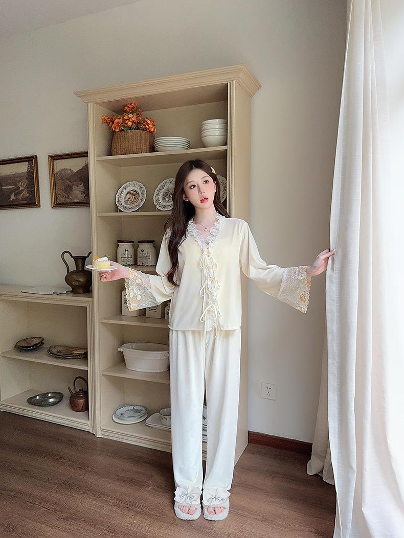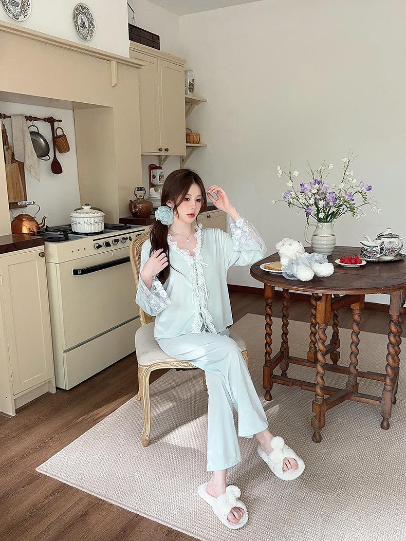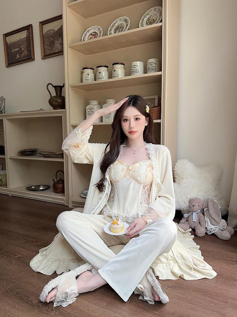 Pijama de Terciopelo para Mujer, Otoño e Invierno, Conjunto de Pantalón Largo de Manga Larga con Solapa, Pijama de Encaje Estilo Palacio que se puede usar afuera