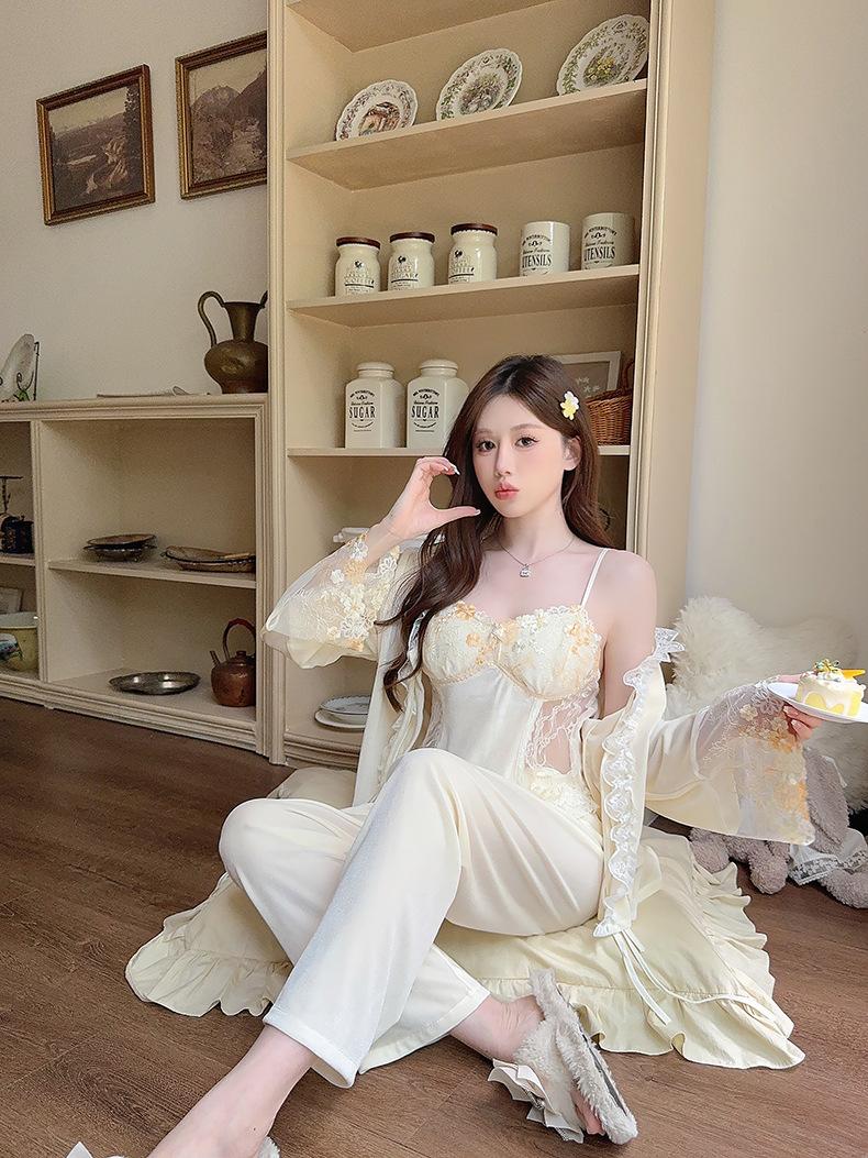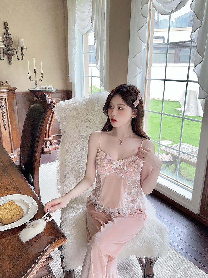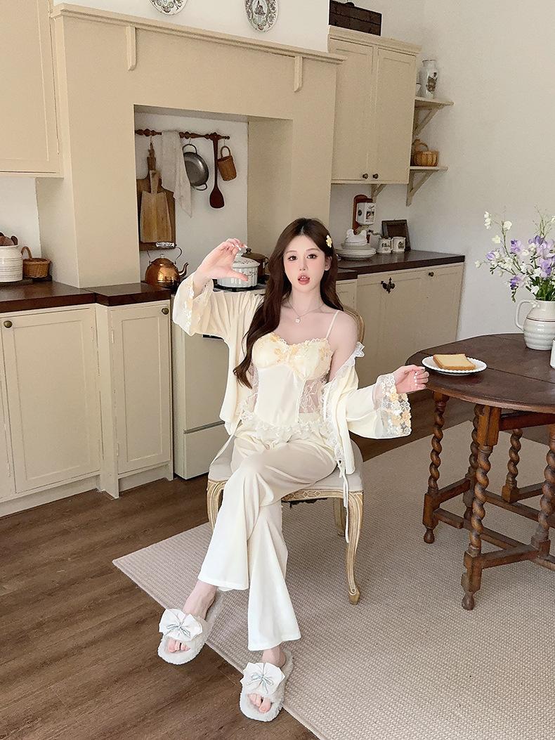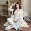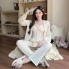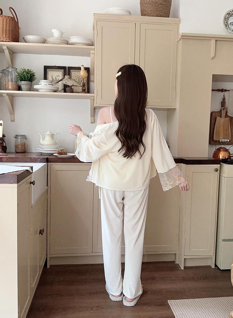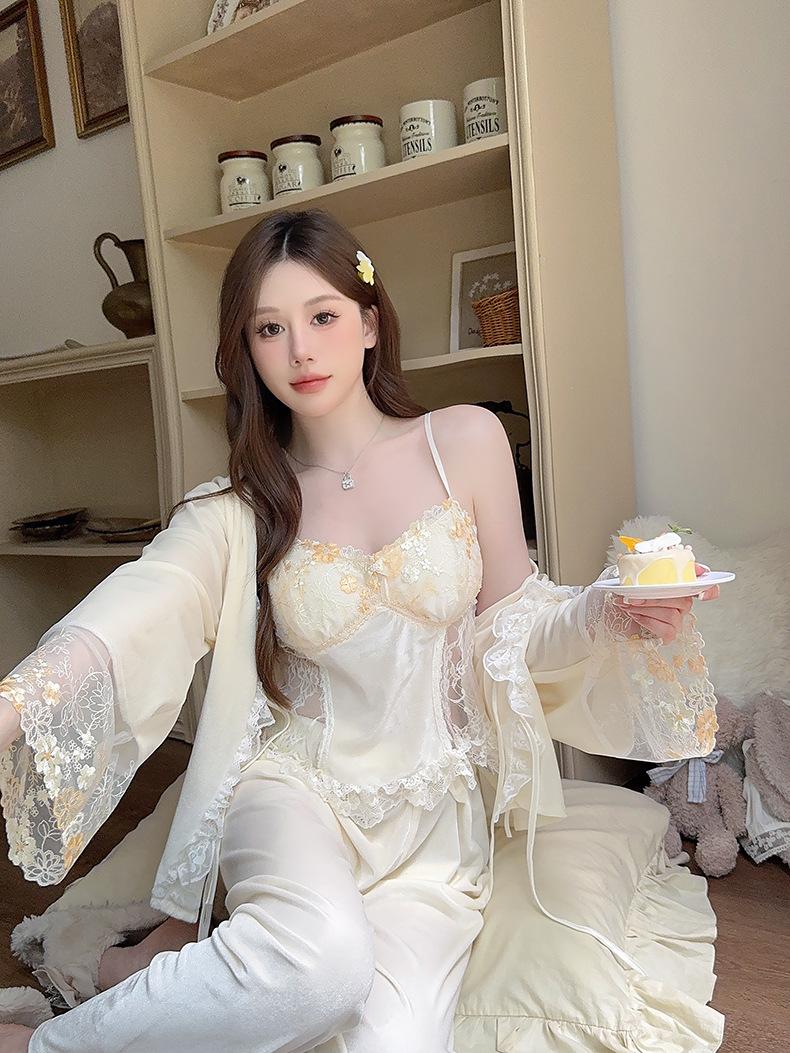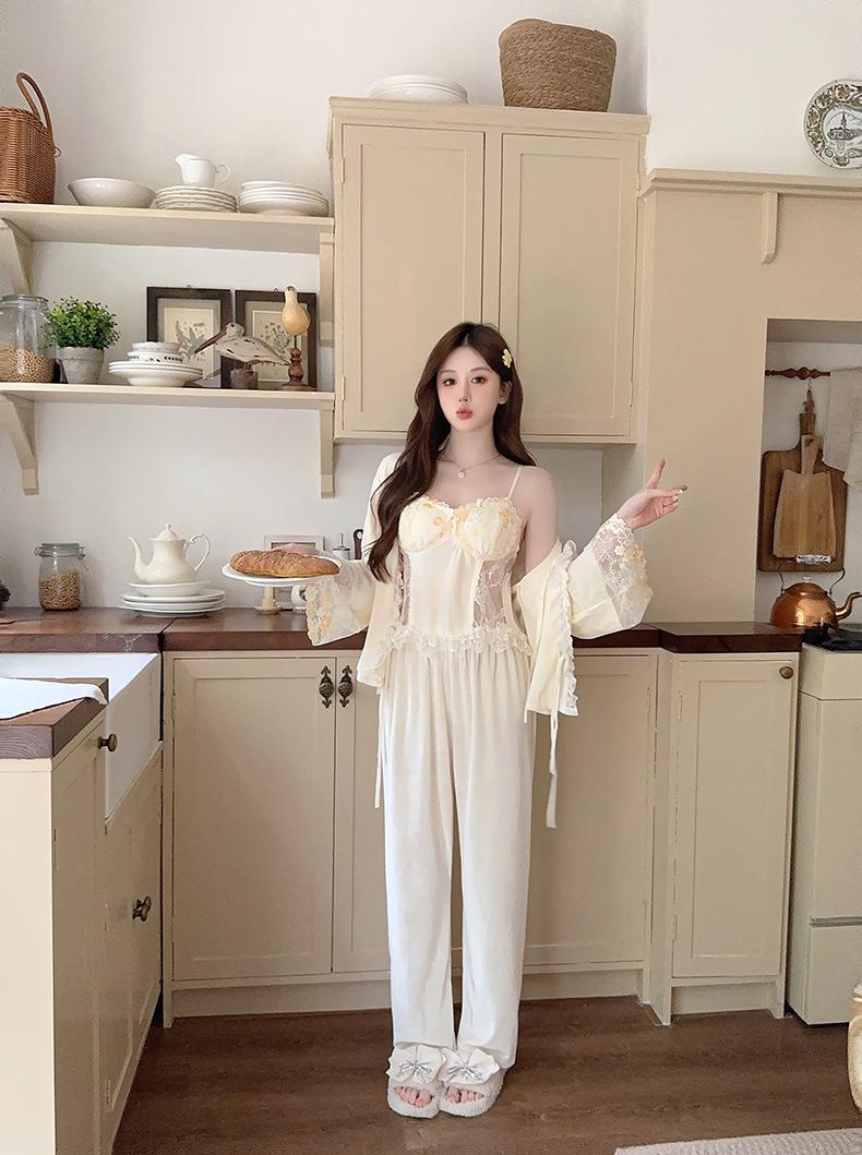 Pijama de Terciopelo para Mujer, Otoño e Invierno, Conjunto de Pantalón Largo de Manga Larga con Solapa, Pijama de Encaje Estilo Palacio que se puede usar afuera