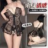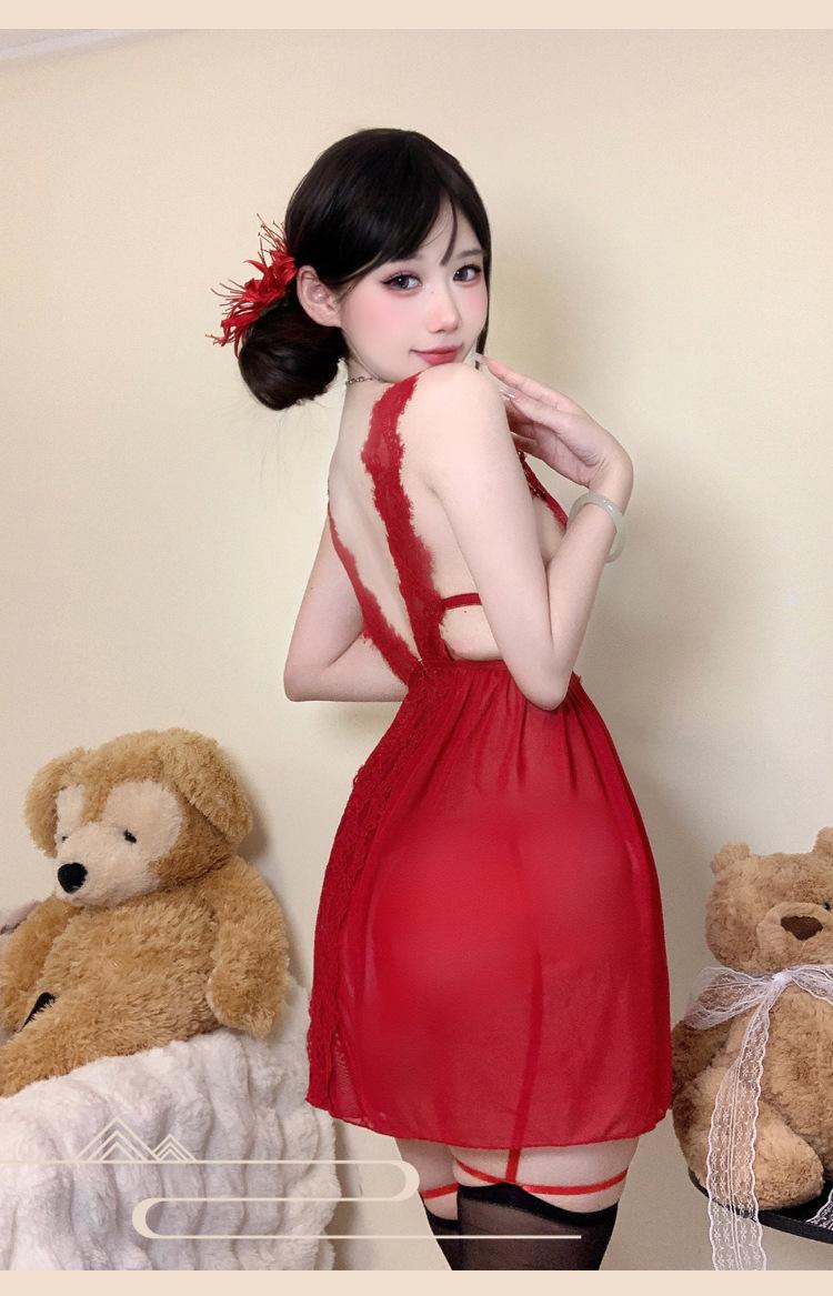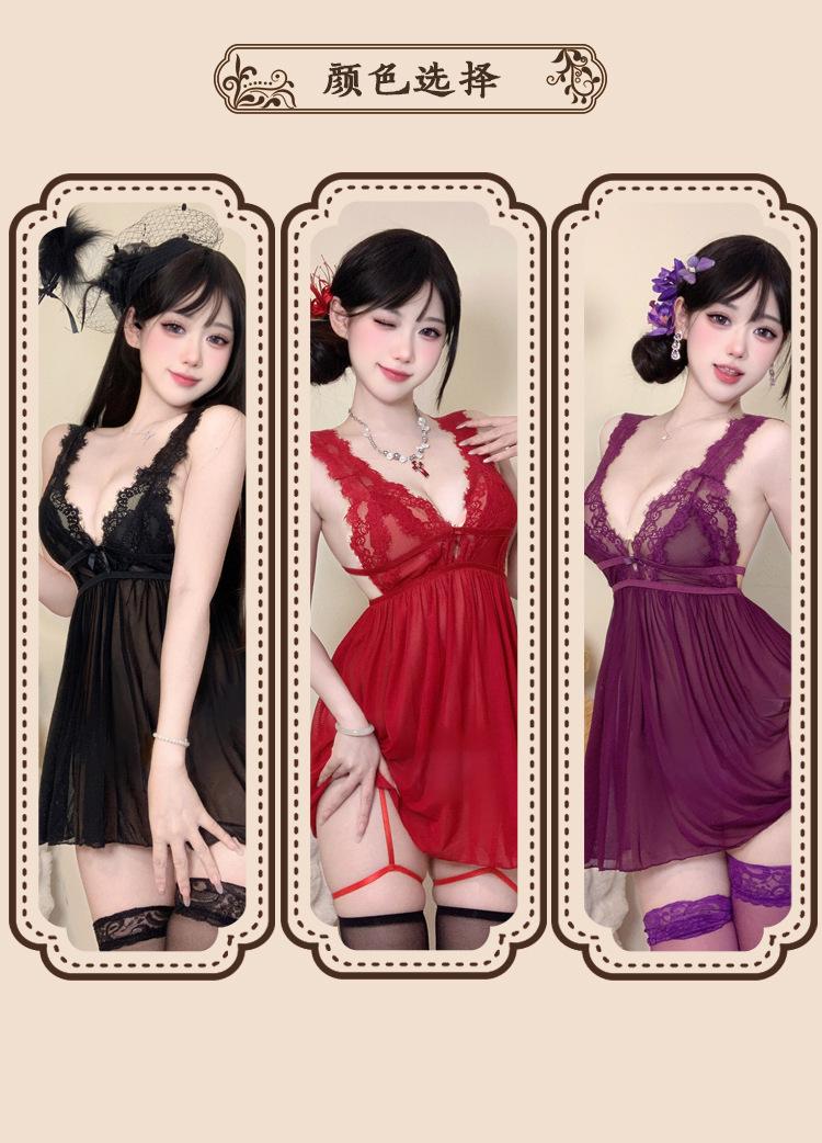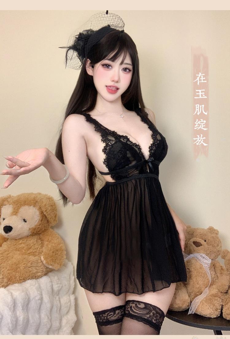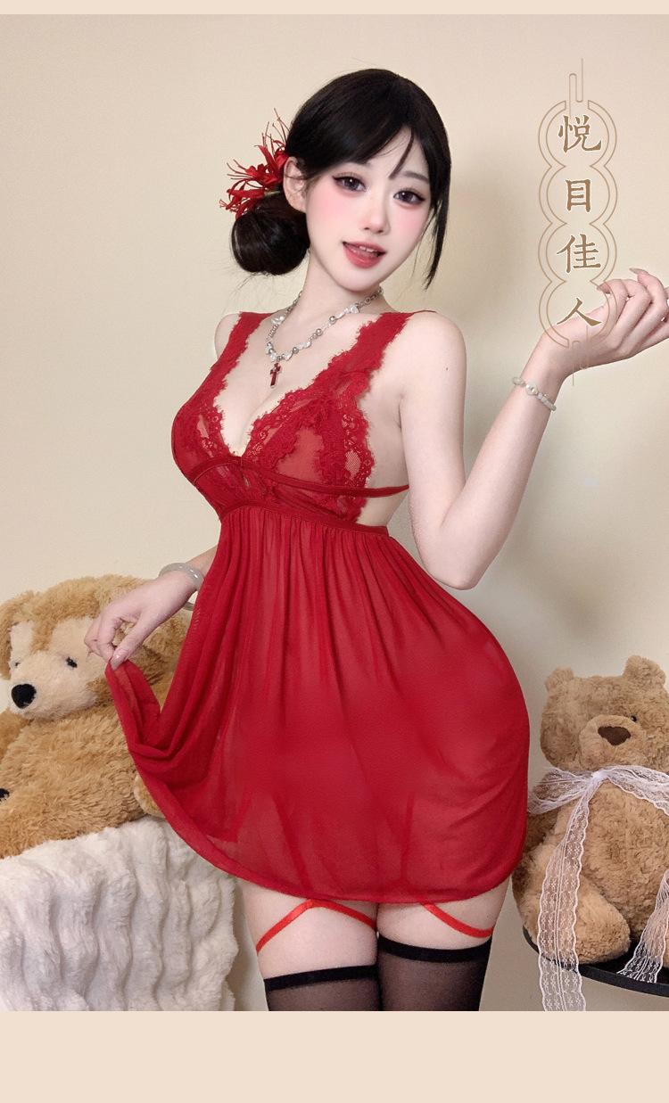 Camisón transparente de estilo nuevo y sexy para mujer, con escote en V profundo, perspectiva de malla, encaje tentador, abertura fina.