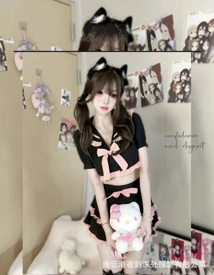 School Uniform, Student uniform + black bow stockings, Student uniform + black striped stockings