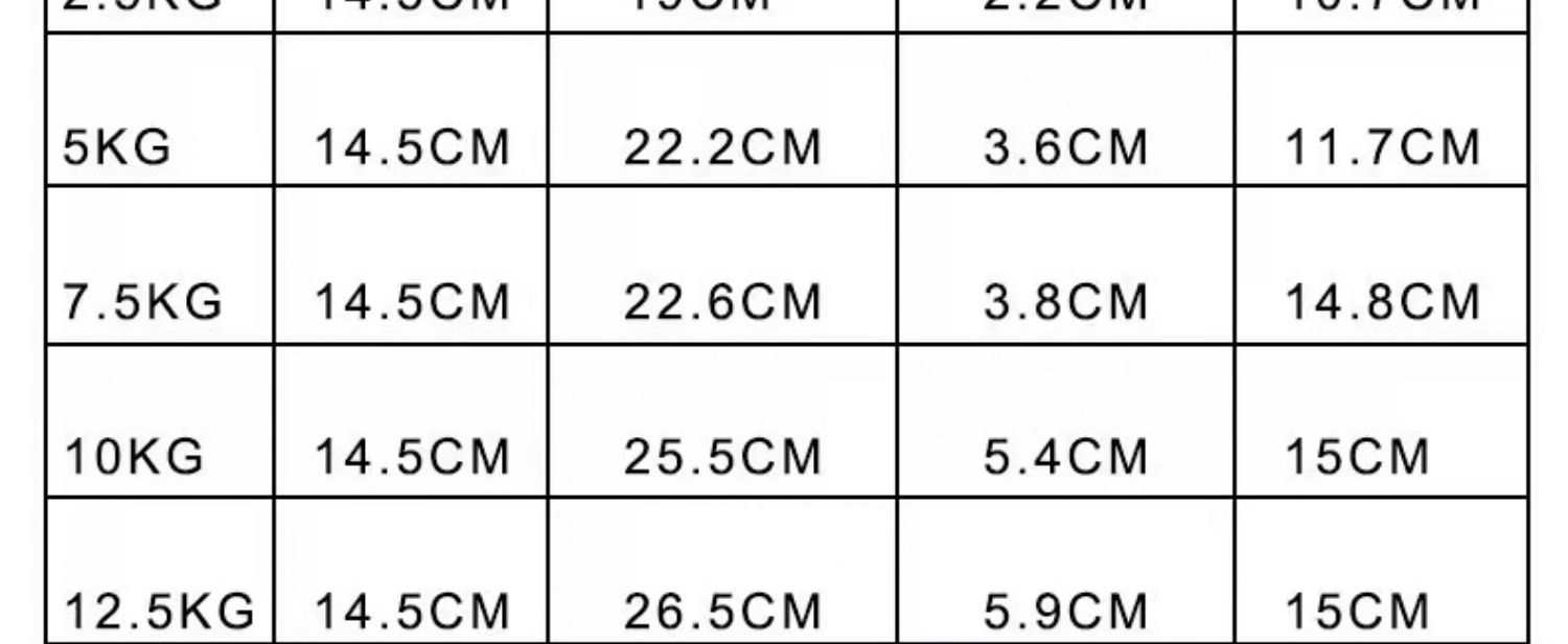 (2.5kg * 2) total weight 5kg, (5kg * 2) Total weight 10kg, (7.5kg * 2) total weight 15kg, (10kg * 2) Total wei...
