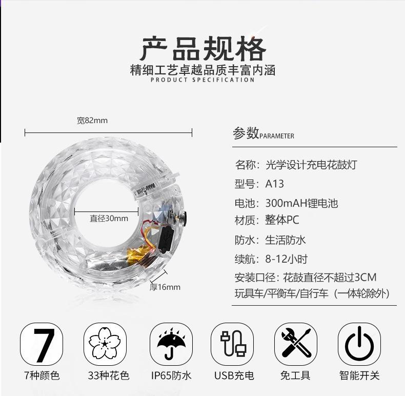 Luz de tambor de flores, luz de bicicleta para niños, luz de equilibrio para andar de noche, accesorios para caminar de noche, luz de rueda luminosa con flash y rueda caliente.